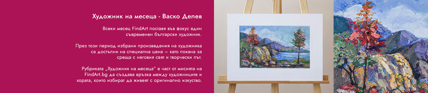 Онлайн галерия за съвременно българско изкуство – подбрано с внимание и страст. Всяко произведение тук търси своя дом и човек, който да го усети истински. Разгледайте колекция от автори с различен почерк и вдъхновение – място, където изкуството живее и очаква да бъде открито.