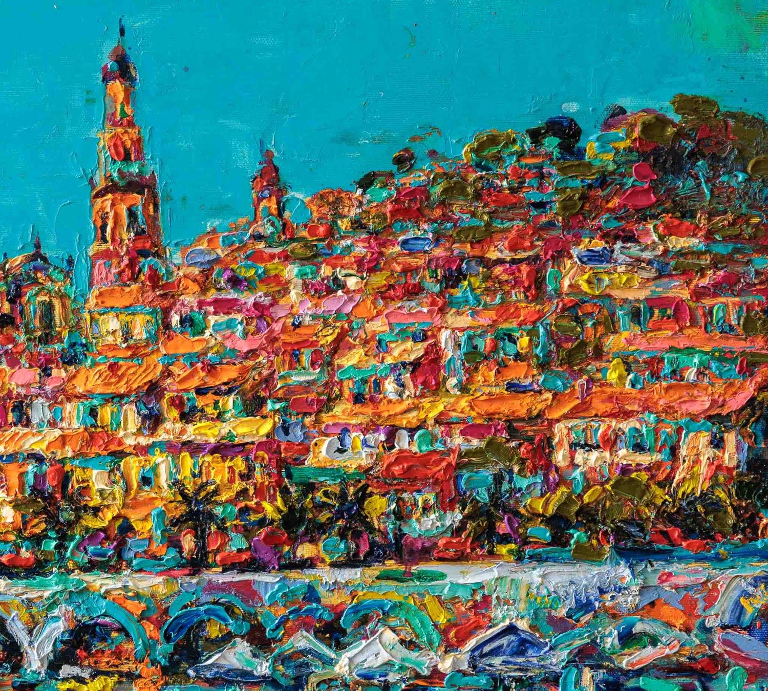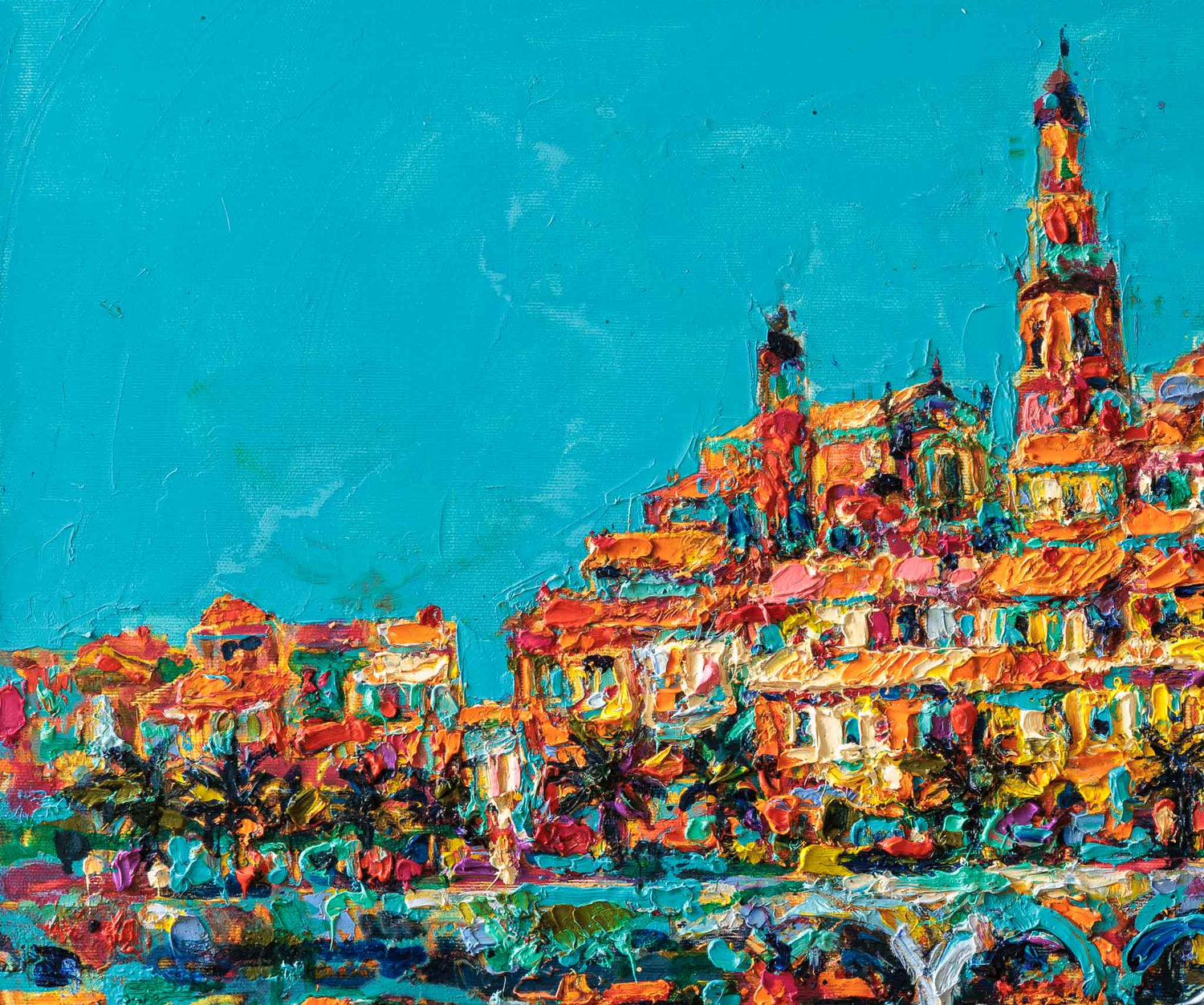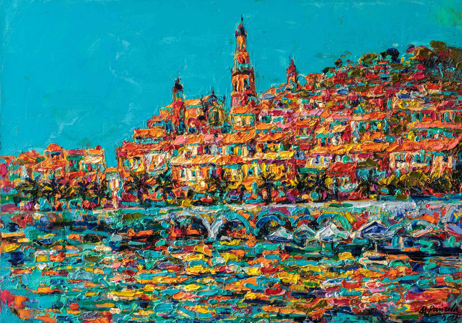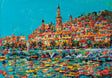 Крайбрежният град се разгръща като сияеща цветна тераса над морето. Наситените мазки изграждат архитектурата в ритъм от охри, розови и тюркоазени тонове, които се отразяват във водата като трептяща мозайка. Композицията излъчва светлина, жизненост и средиземноморска лекота — пейзаж, в който цветът носи основното настроение.