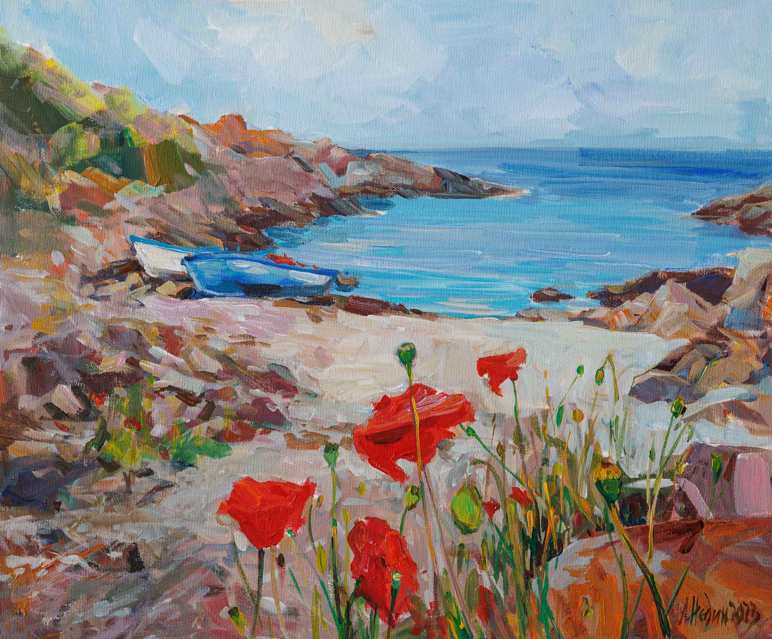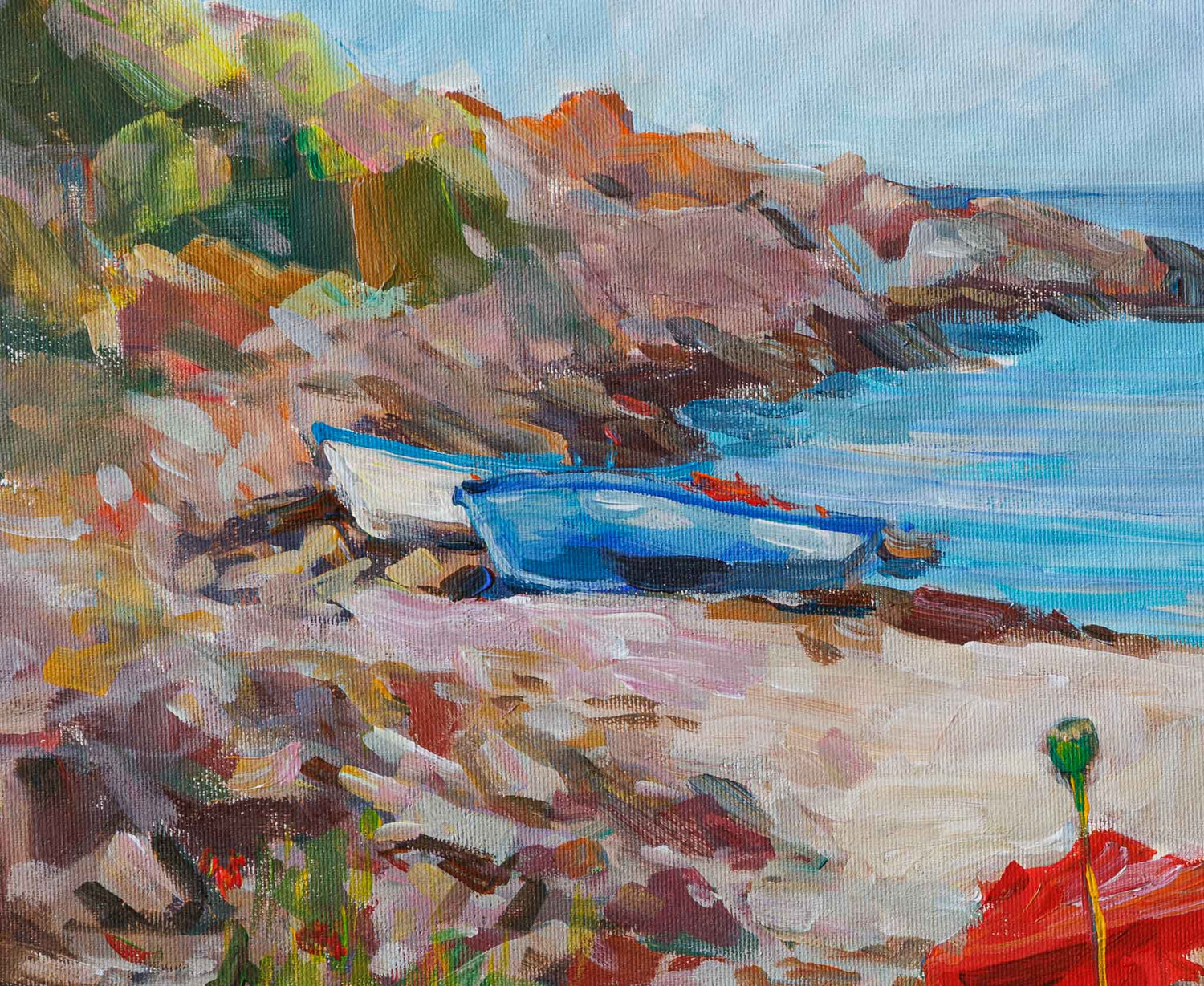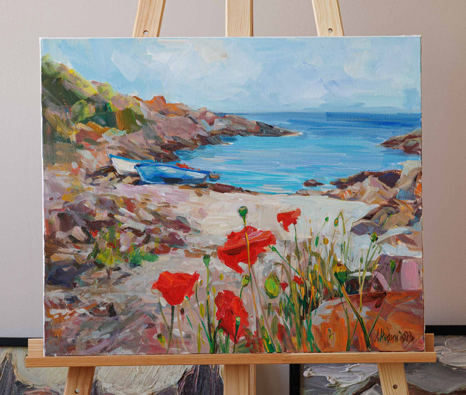В това платно художничката ни въвежда в интимна среща между морето и сушата. Пейзажът не е просто природен мотив, а сцена на вечна хармония – синята безкрайност на водата се отразява в спокойствието на лодките, оставени на брега. В преден план маковете се извисяват като символ на жизненост и крехка красота, контрапункт на неподвижните скали. Творбата носи усещане за поетично съзерцание, в което всеки елемент е внимателно подбран, за да изгради диалог между сила и нежност, мимолетност и вечност.