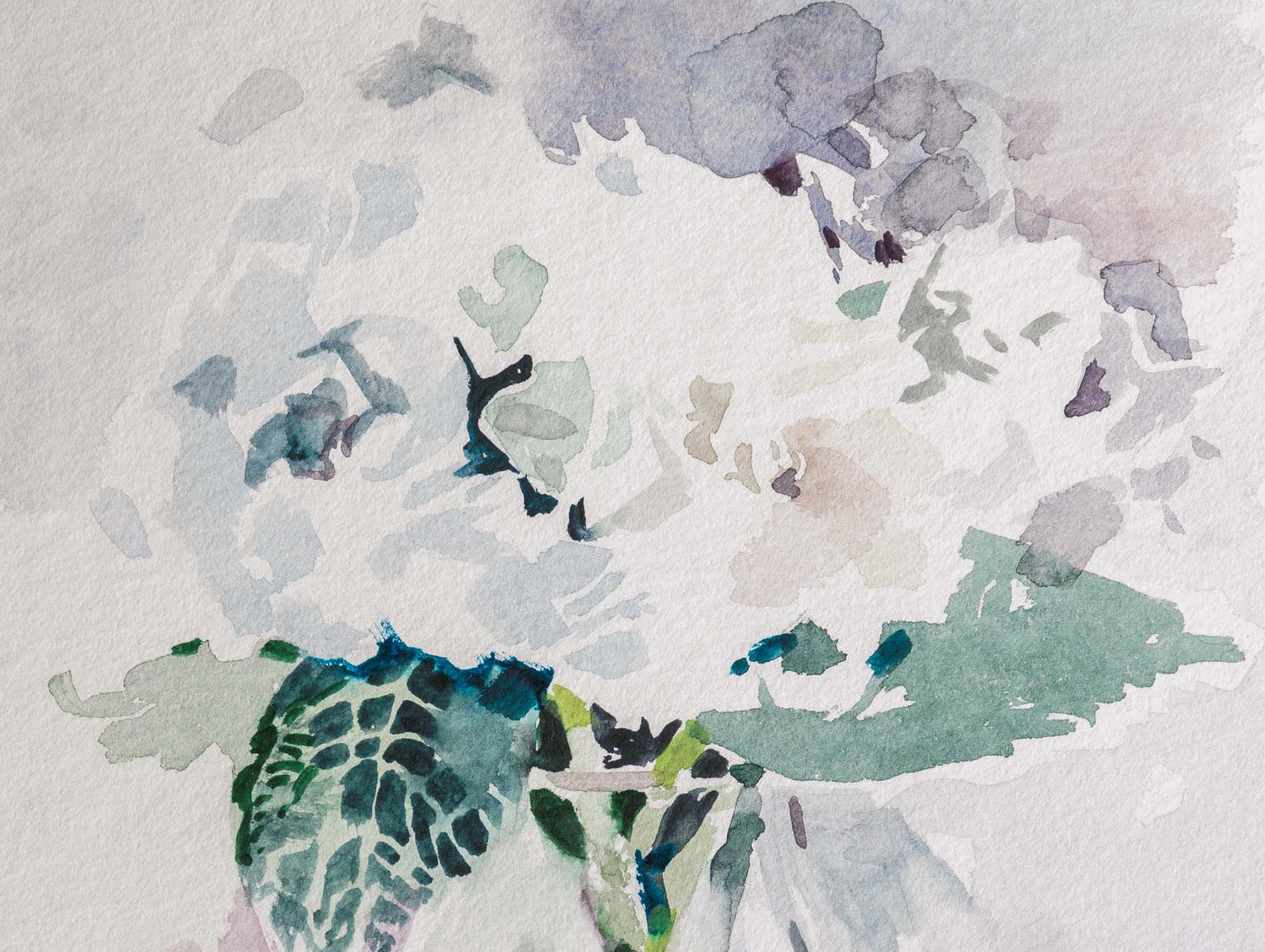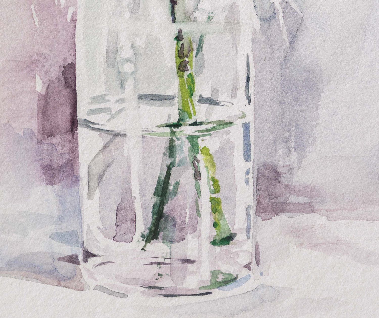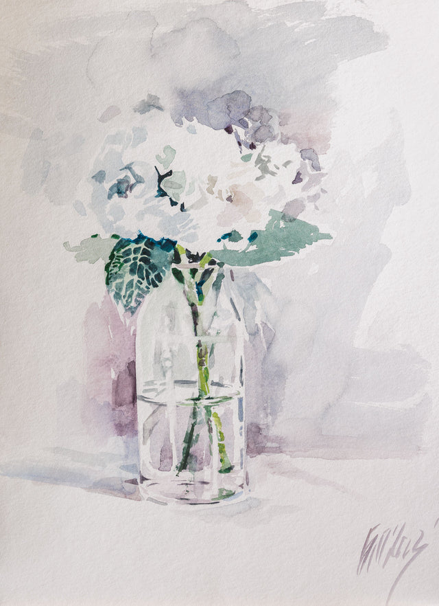 С минимални средства и ефирна акварелна техника, Бояна Петкова създава усещане за крехкост и тишина. Цветето, потопено в прозрачна ваза, е като дъх – леко, почти нематериално. Композиция, в която бялото говори най-силно.