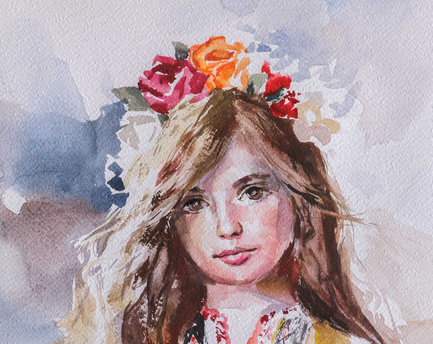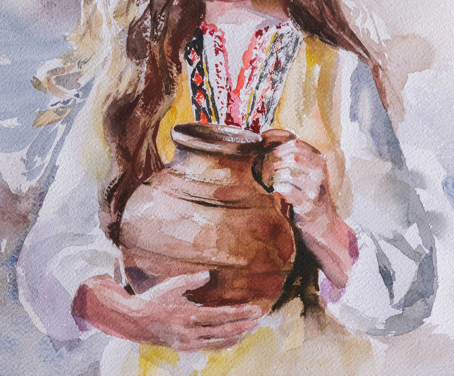 Младост, светлина и традиция се преплитат в този акварелен портрет. Венецът от цветя, народната носия и глиненият съд в ръцете на момичето създават образ едновременно символичен и жив. Погледът ѝ носи съвременна увереност, а цялостната композиция – чувство за идентичност и корен.