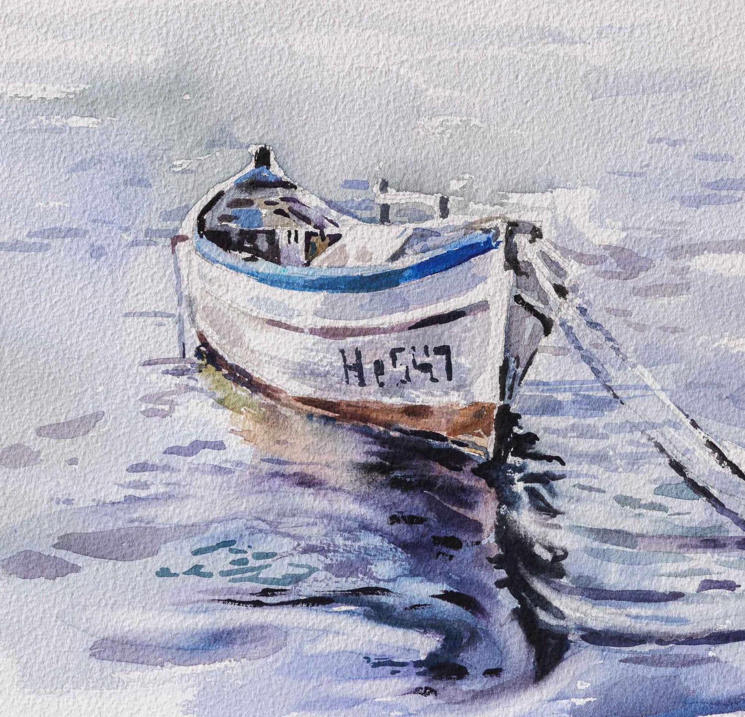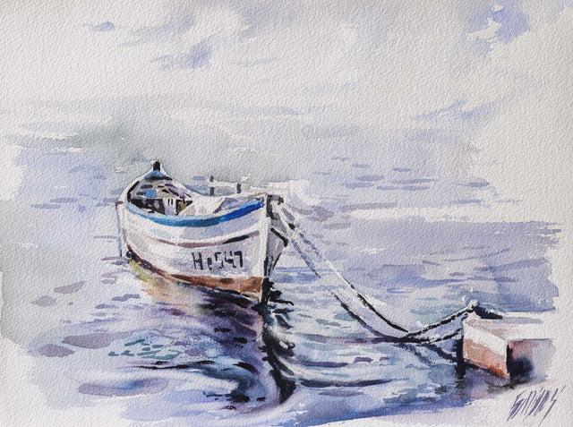 Самотно привързана лодка в утринна тишина. Акварелът улавя прозрачността на светлината и отраженията по водата с изключителна лекота. Минималистичната композиция носи усещане за покой, време, което спира – и един бряг, запомнен не с драмата, а със светлината си.