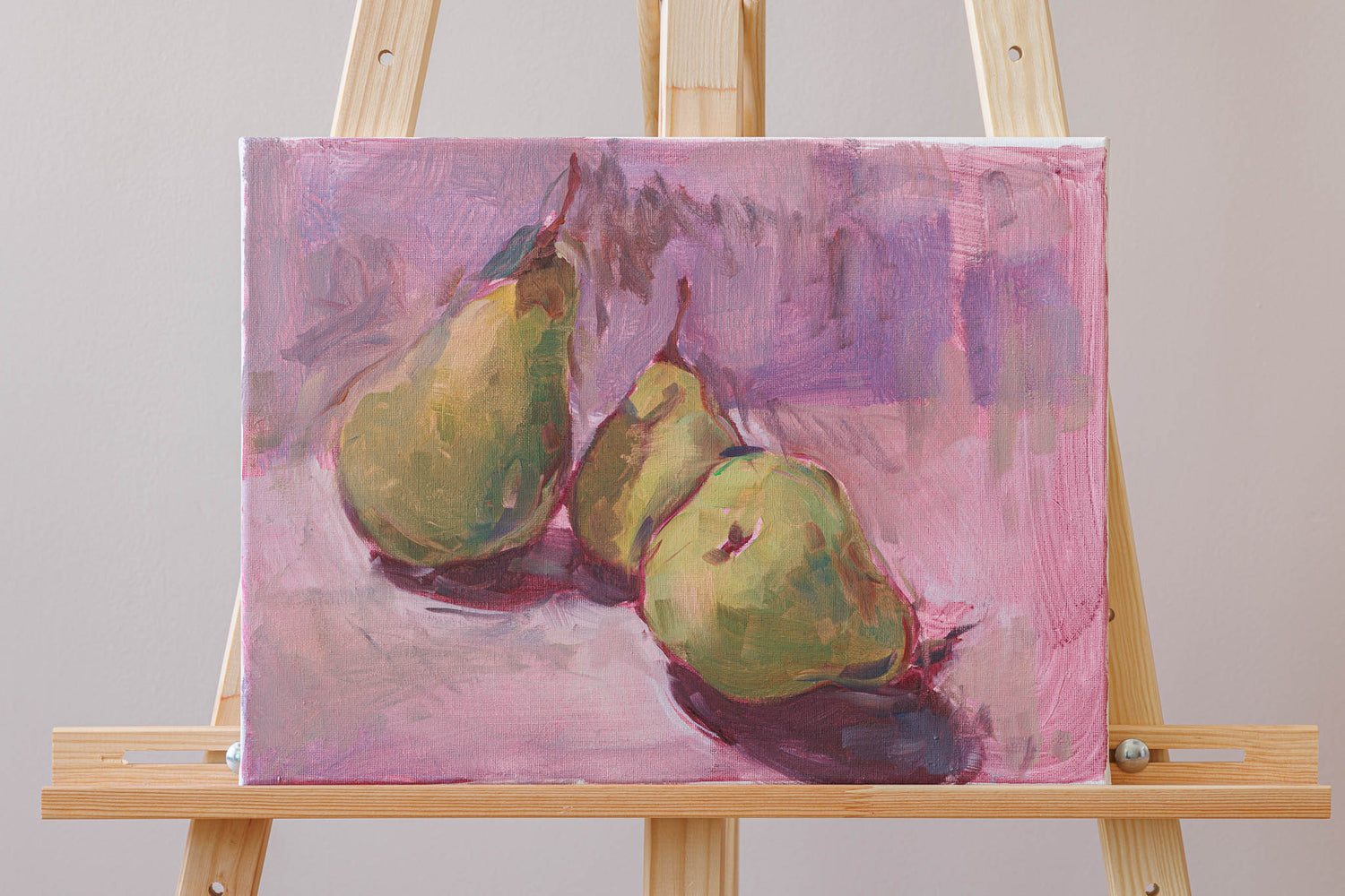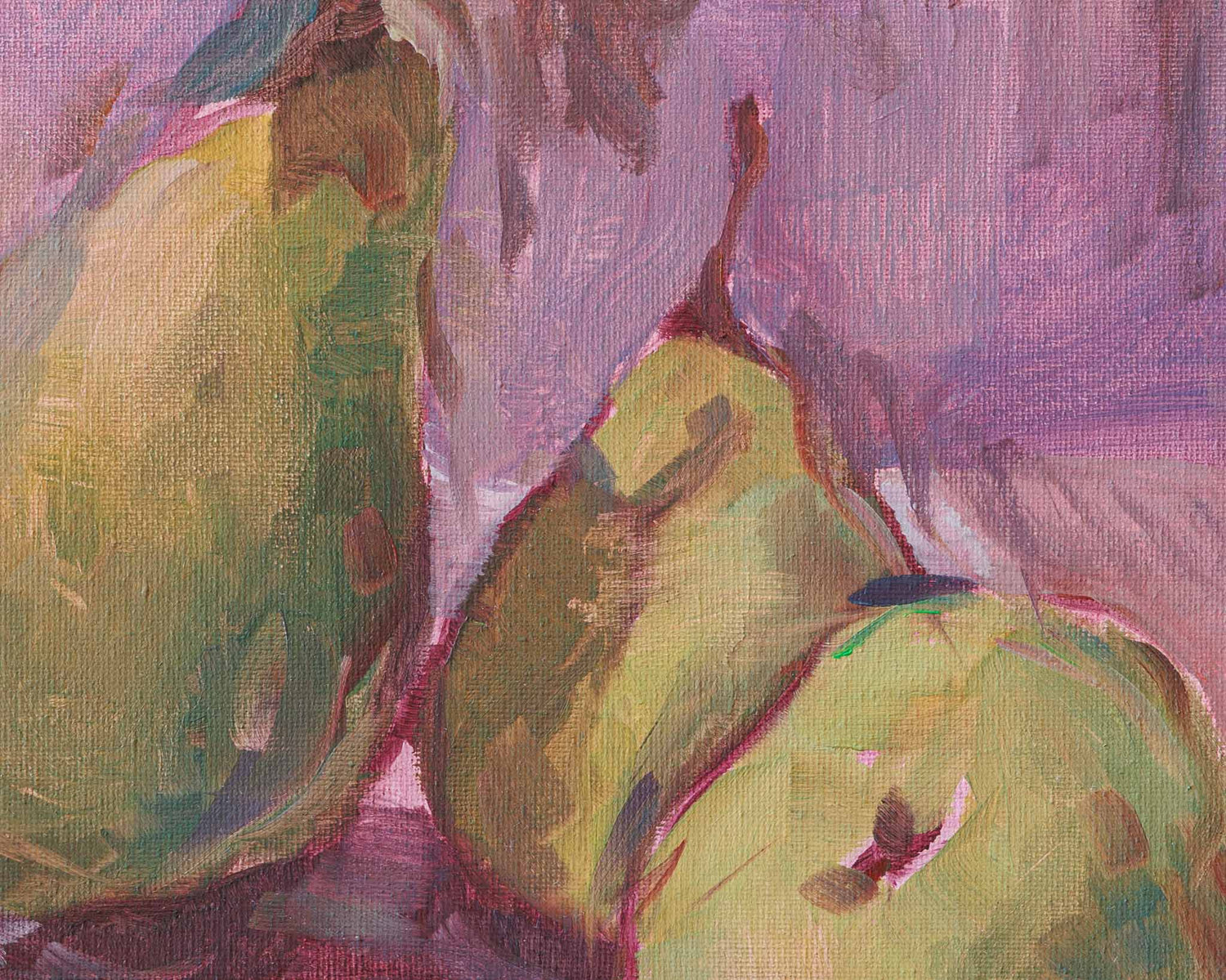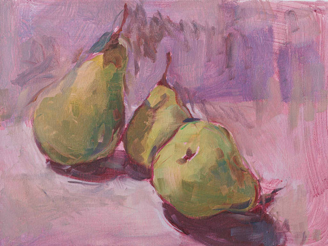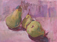 Три круши, разположени в небрежна хармония, изпъкват върху фона в розово-лилави тонове. Меката светлина и свободният живописен жест създават усещане за спокойствие и съзерцание – деликатен портрет на обикновеното с артистична чувствителност.
