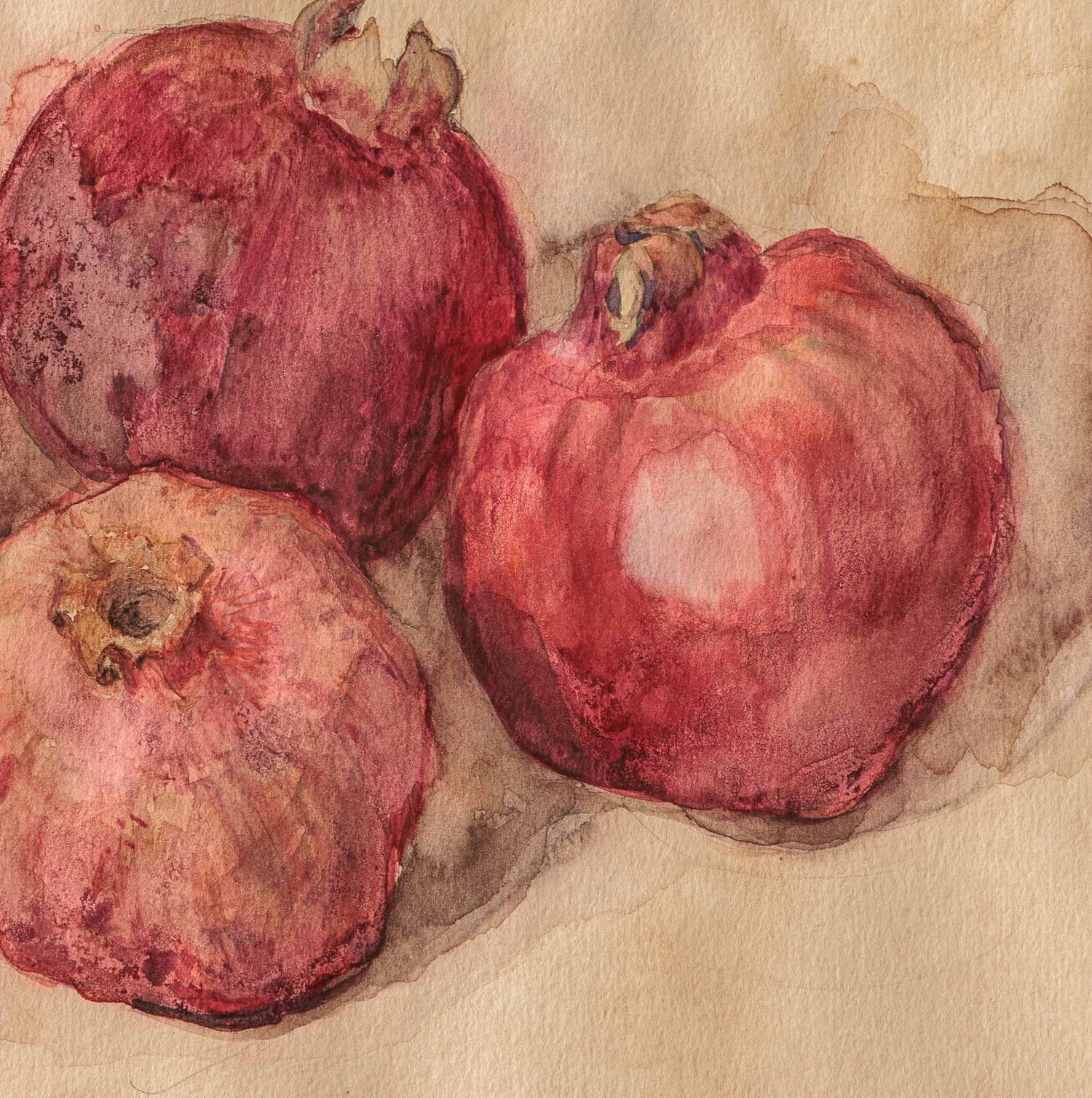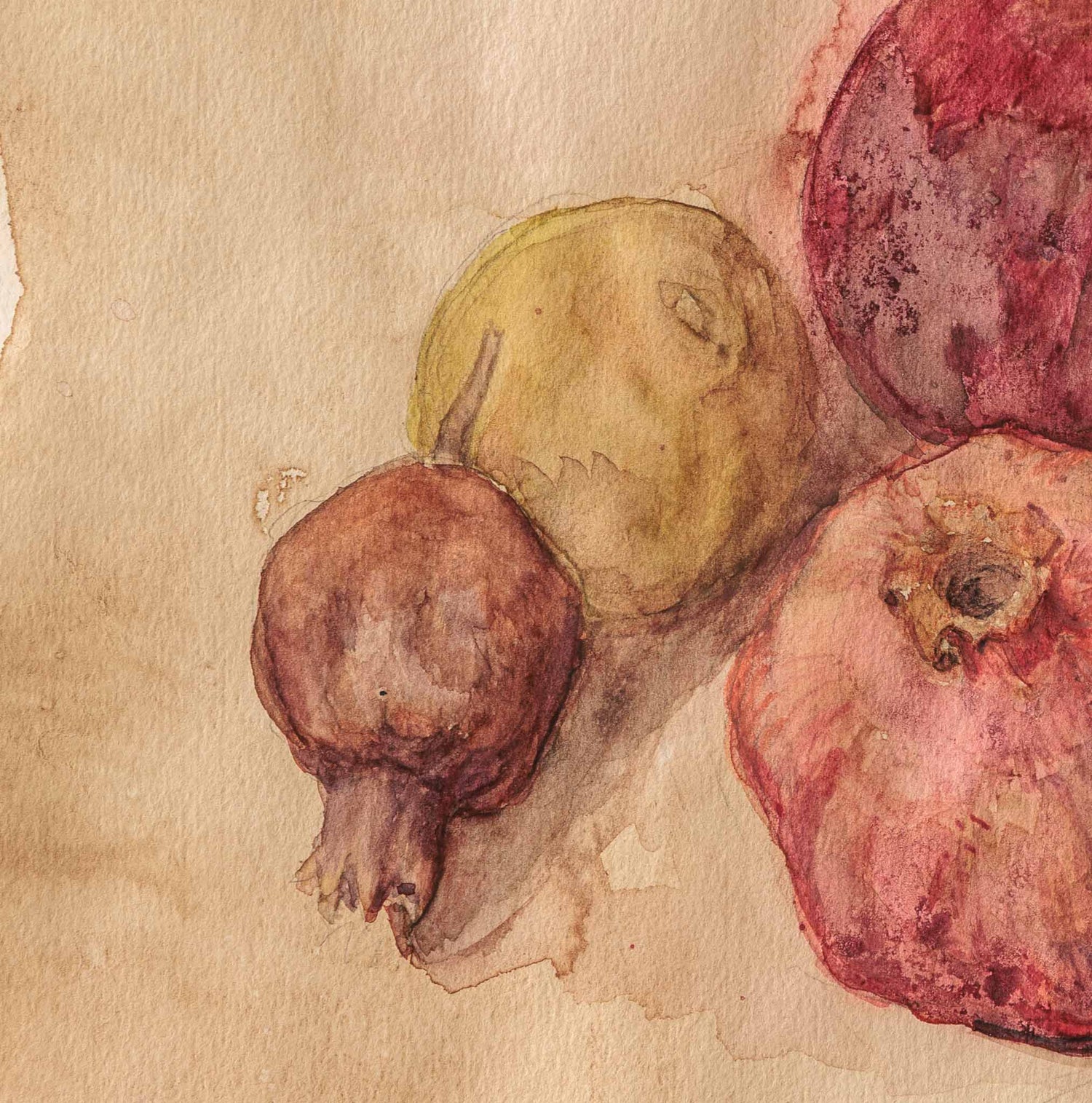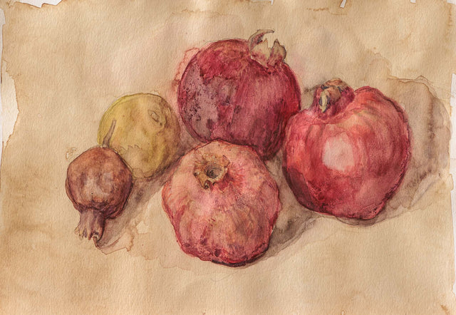 Натюрморт с нарове, изграден с меки акварелни преливания и приглушена цветова гама. Формите са обобщени, а прозрачните слоеве цвят подчертават естествената текстура на плодовете и създават усещане за зрялост и тиха концентрация.