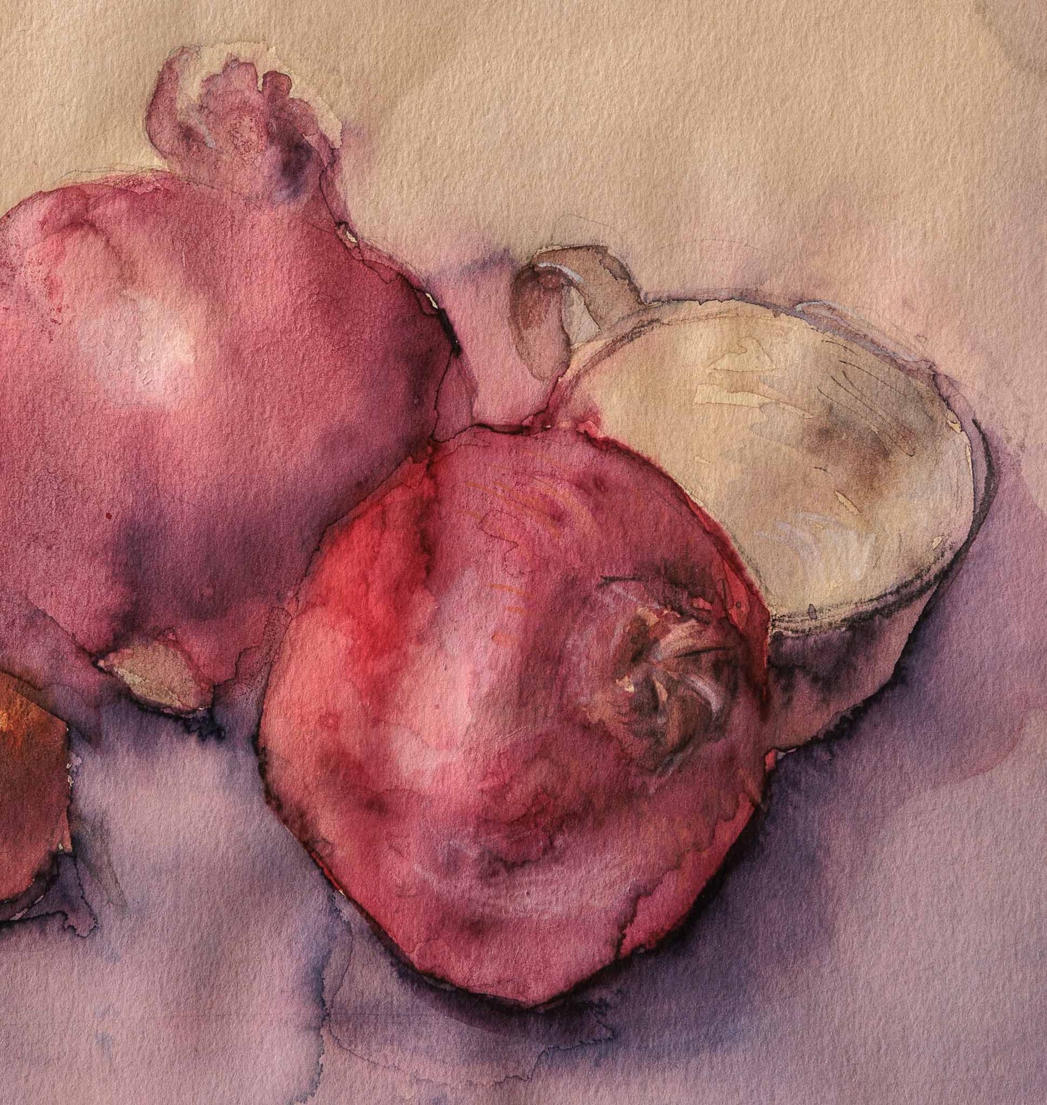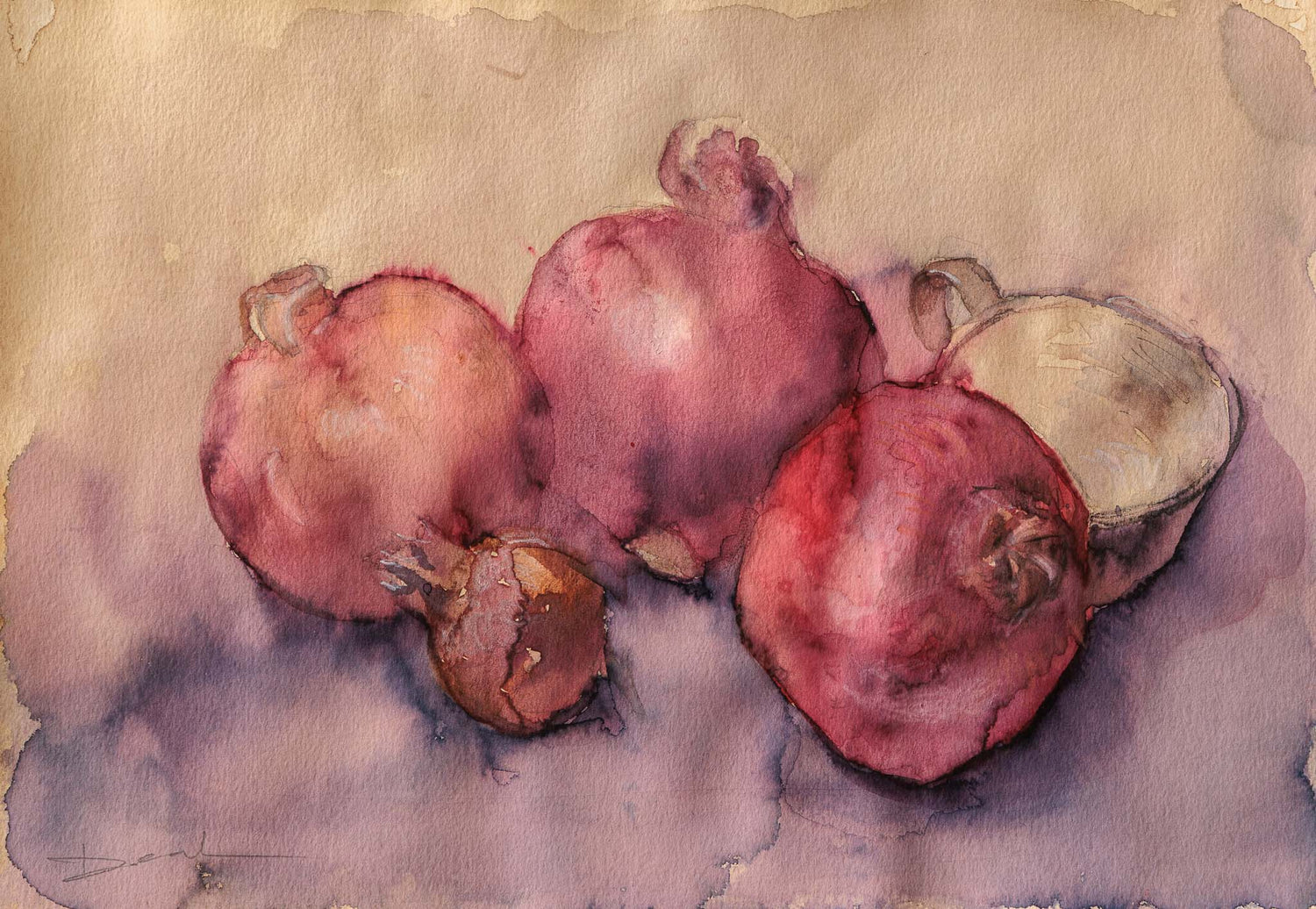 Акварелен натюрморт с нарове, изграден с прозрачни цветни пластове и меки преливания. Формите са плътни, но ненатрапчиви, а топлата гама носи усещане за зрялост и спокойна концентрация.