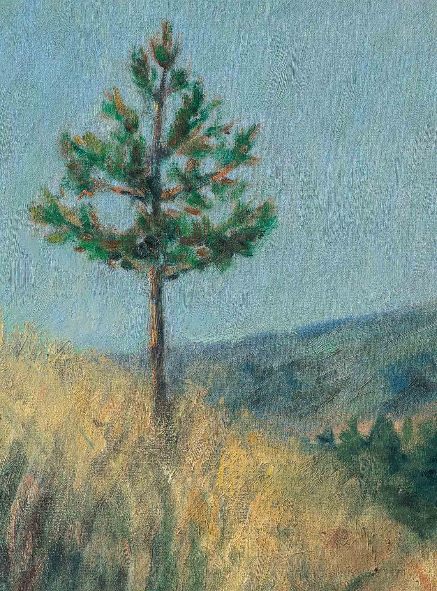 Самотно дърво сред сухи треви и меко хълмист пейзаж. Тиха сцена, в която светлината и въздухът носят усещане за простор и спокойствие.