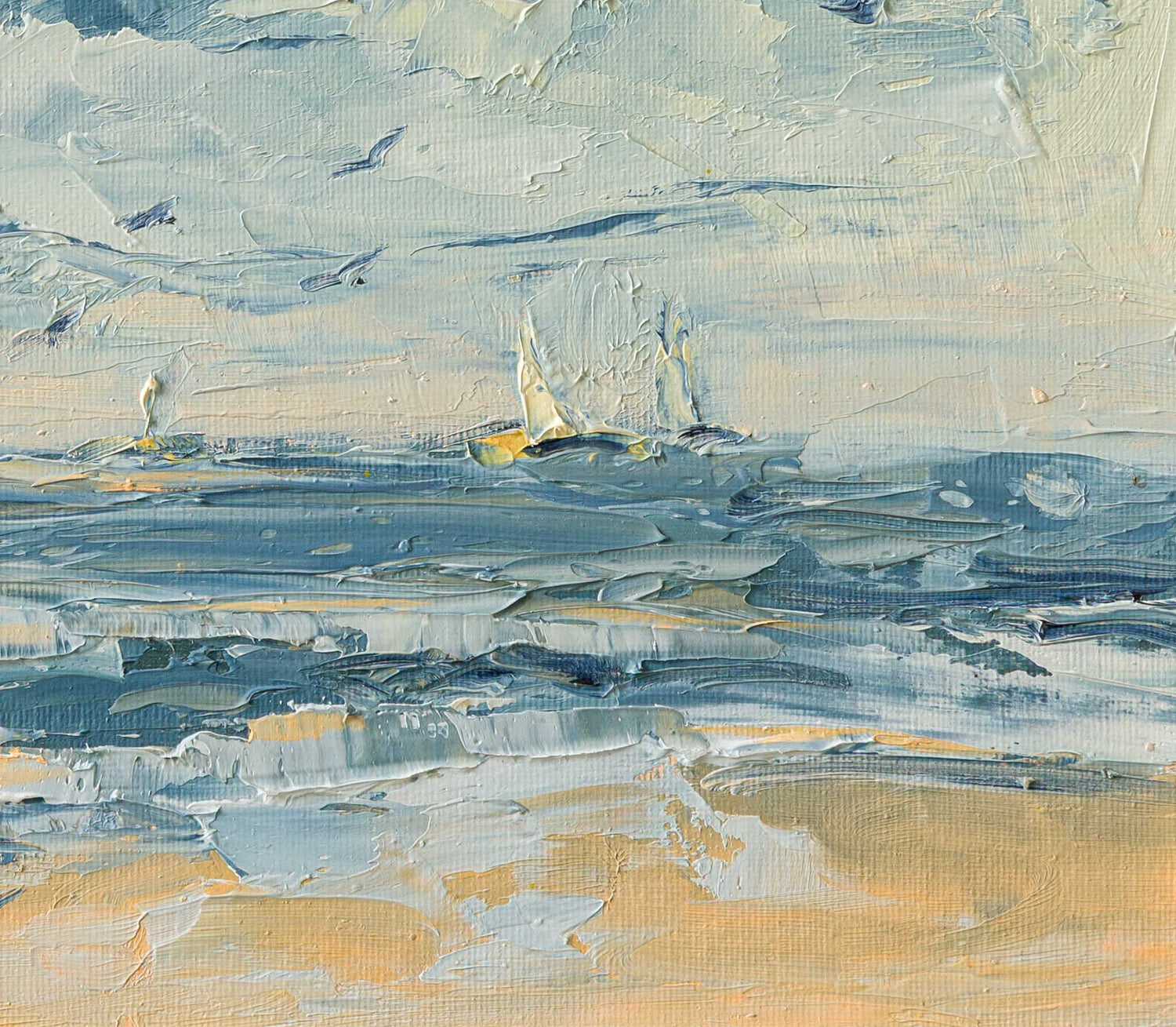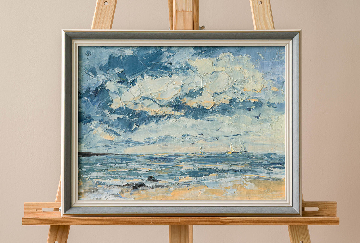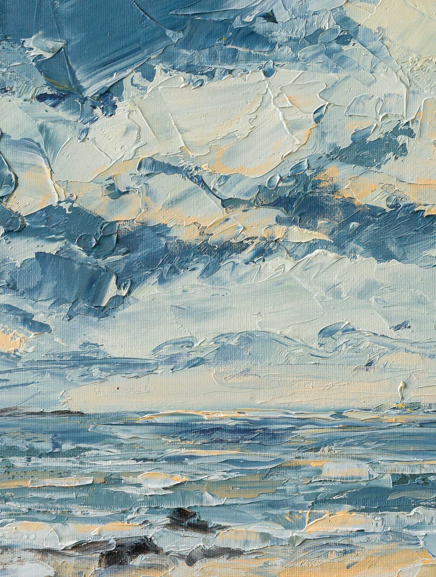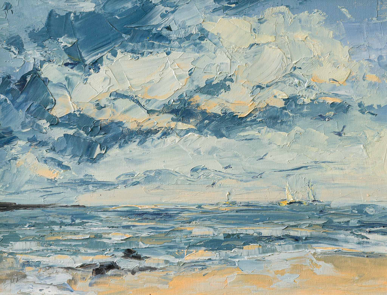 Морски пейзаж, в който драматичното небе и движението на вълните създават силно усещане за простор и динамика. Свободните мазки и студената гама подчертават свежестта на въздуха и непрекъснатия ритъм на морето.