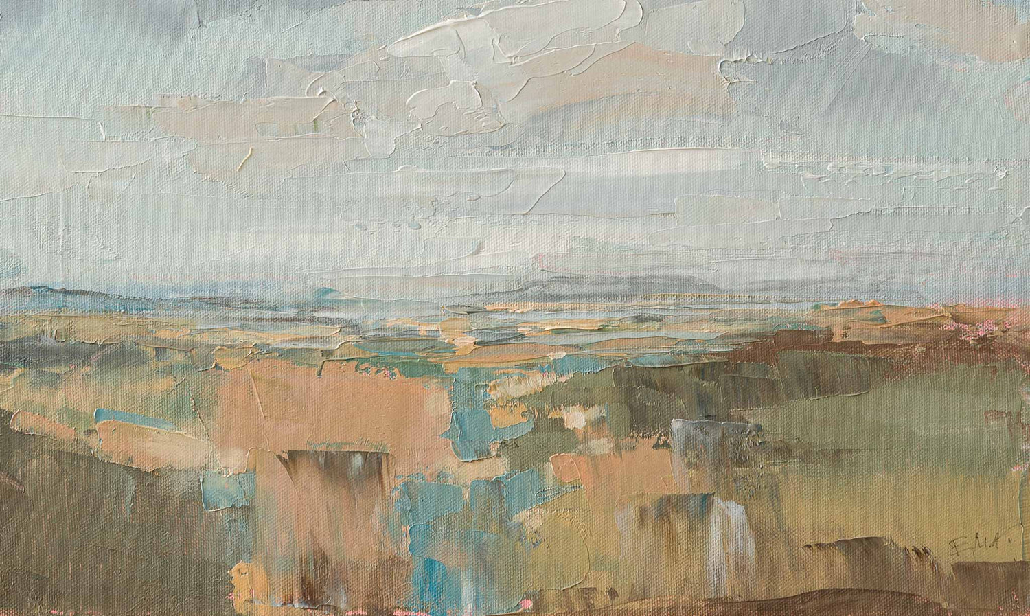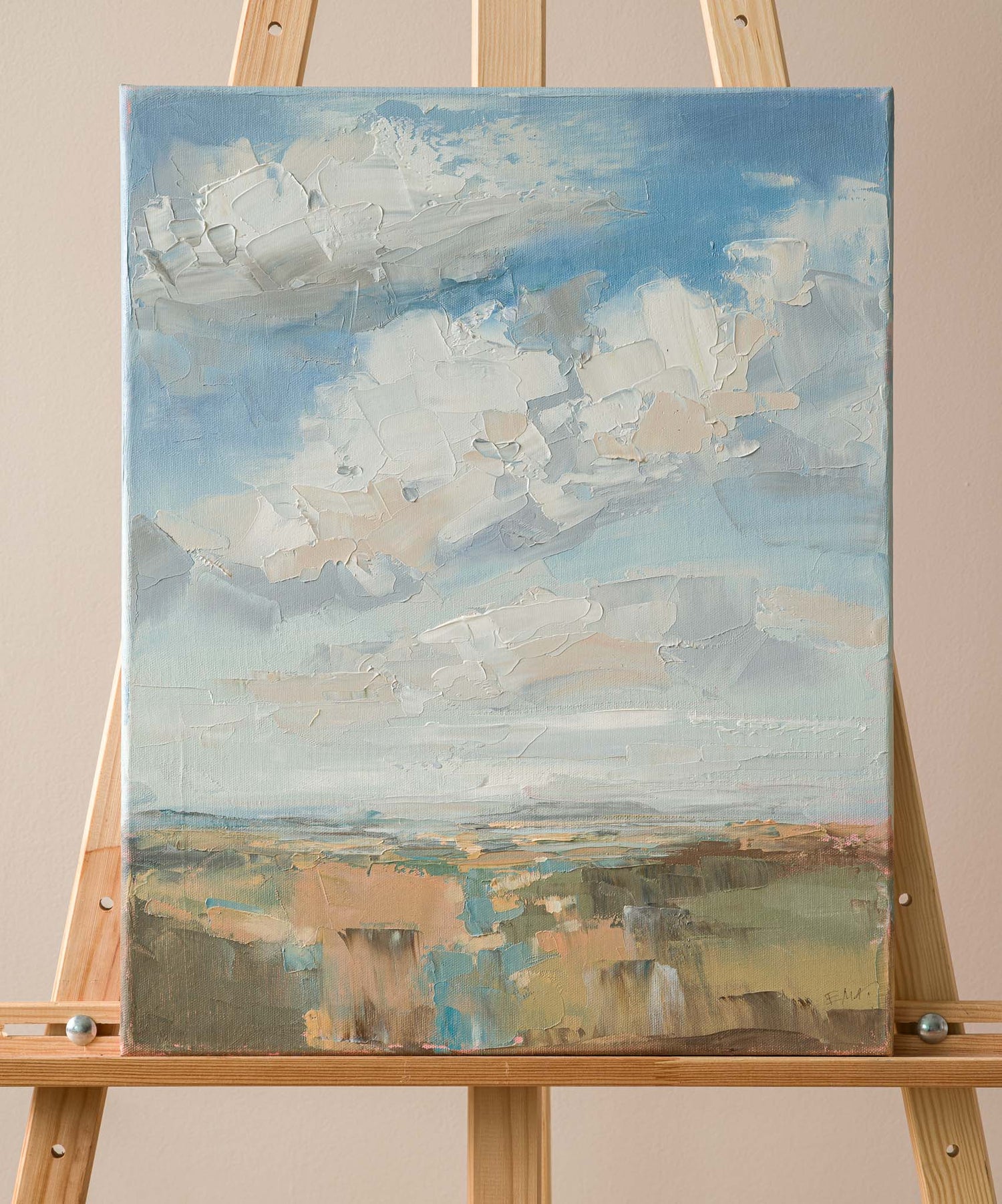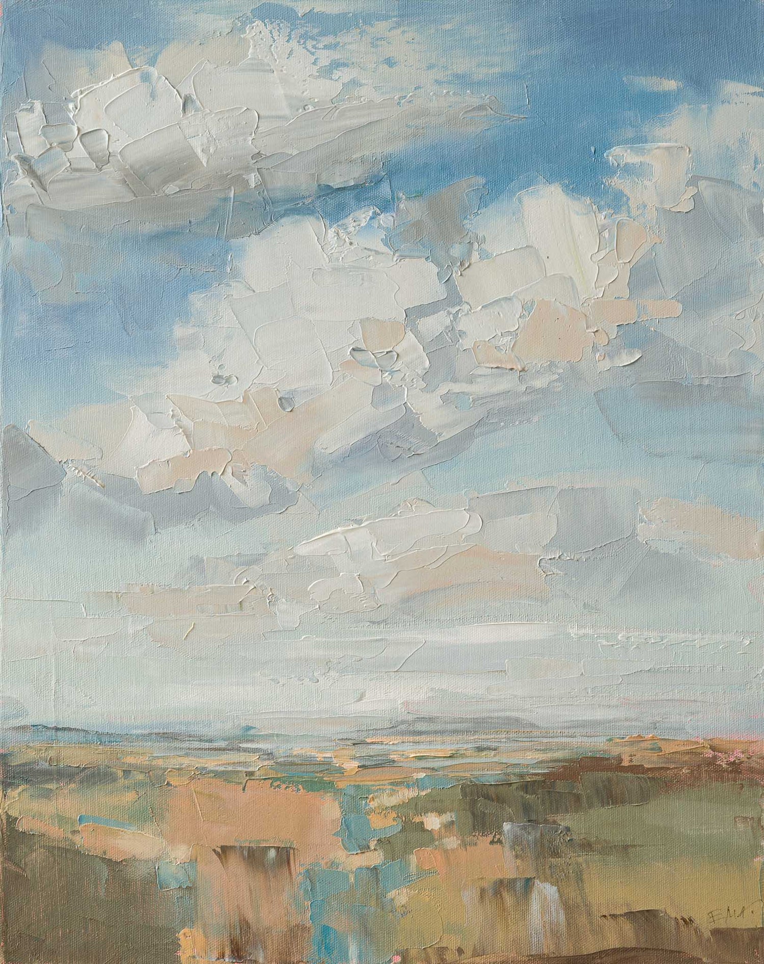 Пейзаж, в който просторът на небето доминира над тихия хоризонт и създава усещане за лекота и въздух. Светлата гама и широките живописни движения придават на композицията спокойствие и съзерцателна дълбочина.