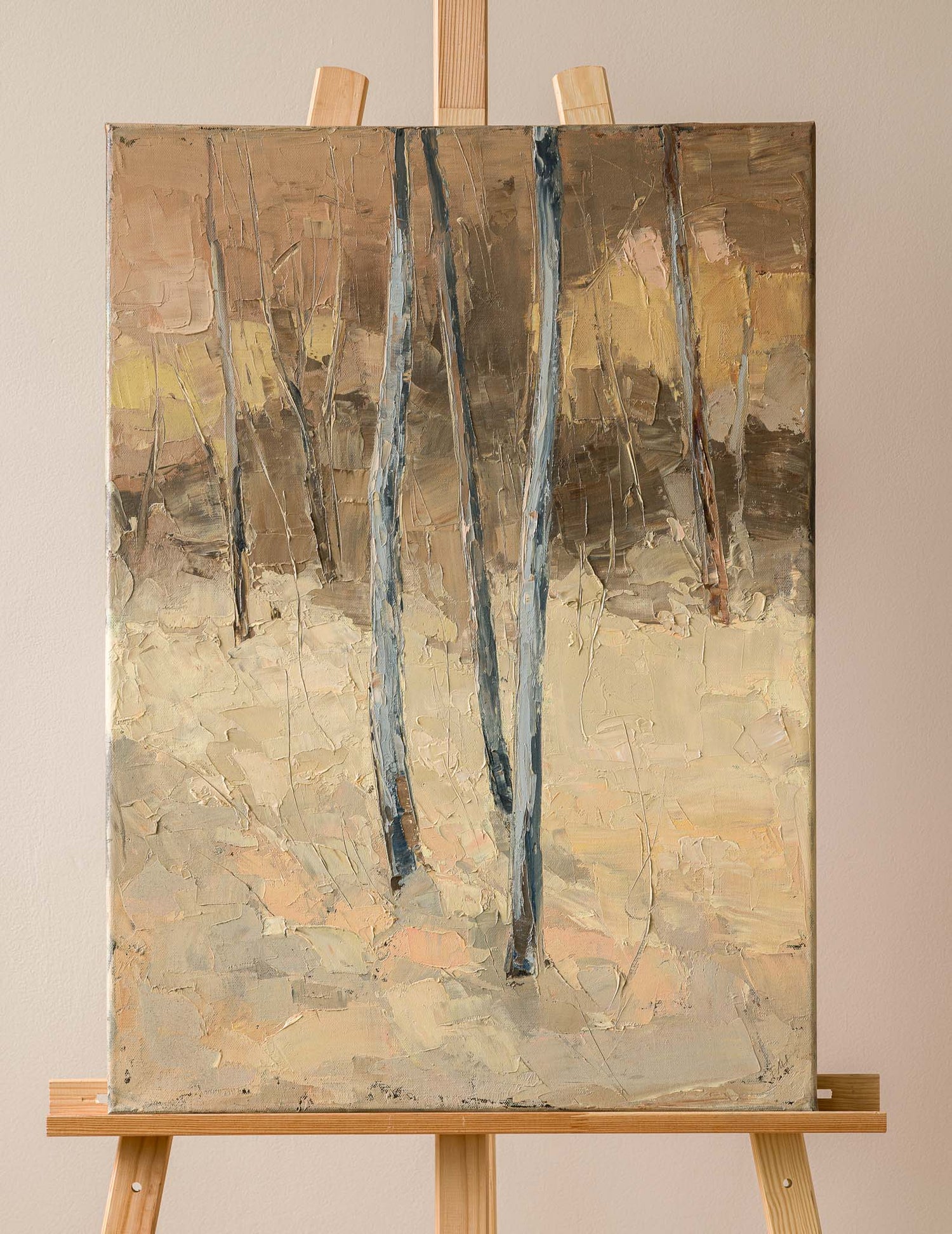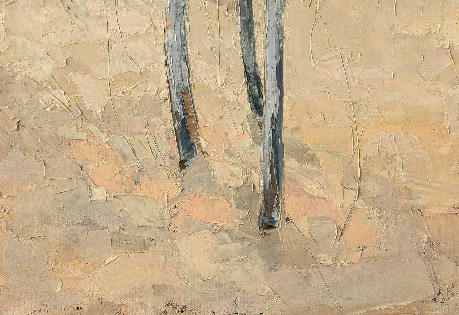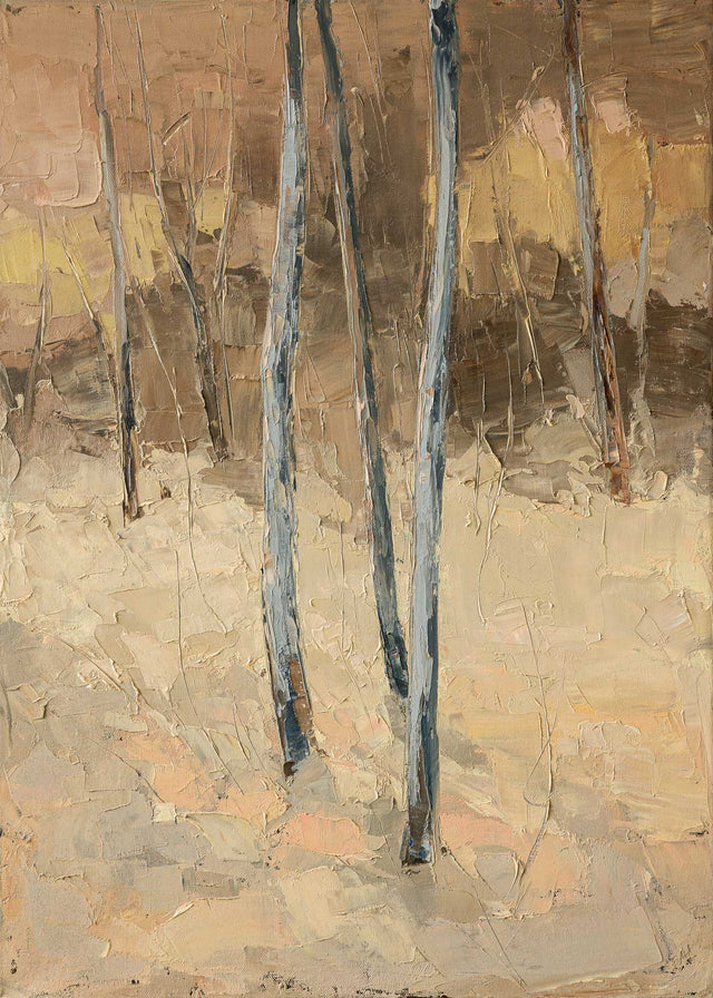 Минималистичен пейзаж, в който стройните вертикали на дърветата изграждат тих ритъм в пространството. Меката гама от земни и светли тонове създава усещане за спокойствие и съзерцание.