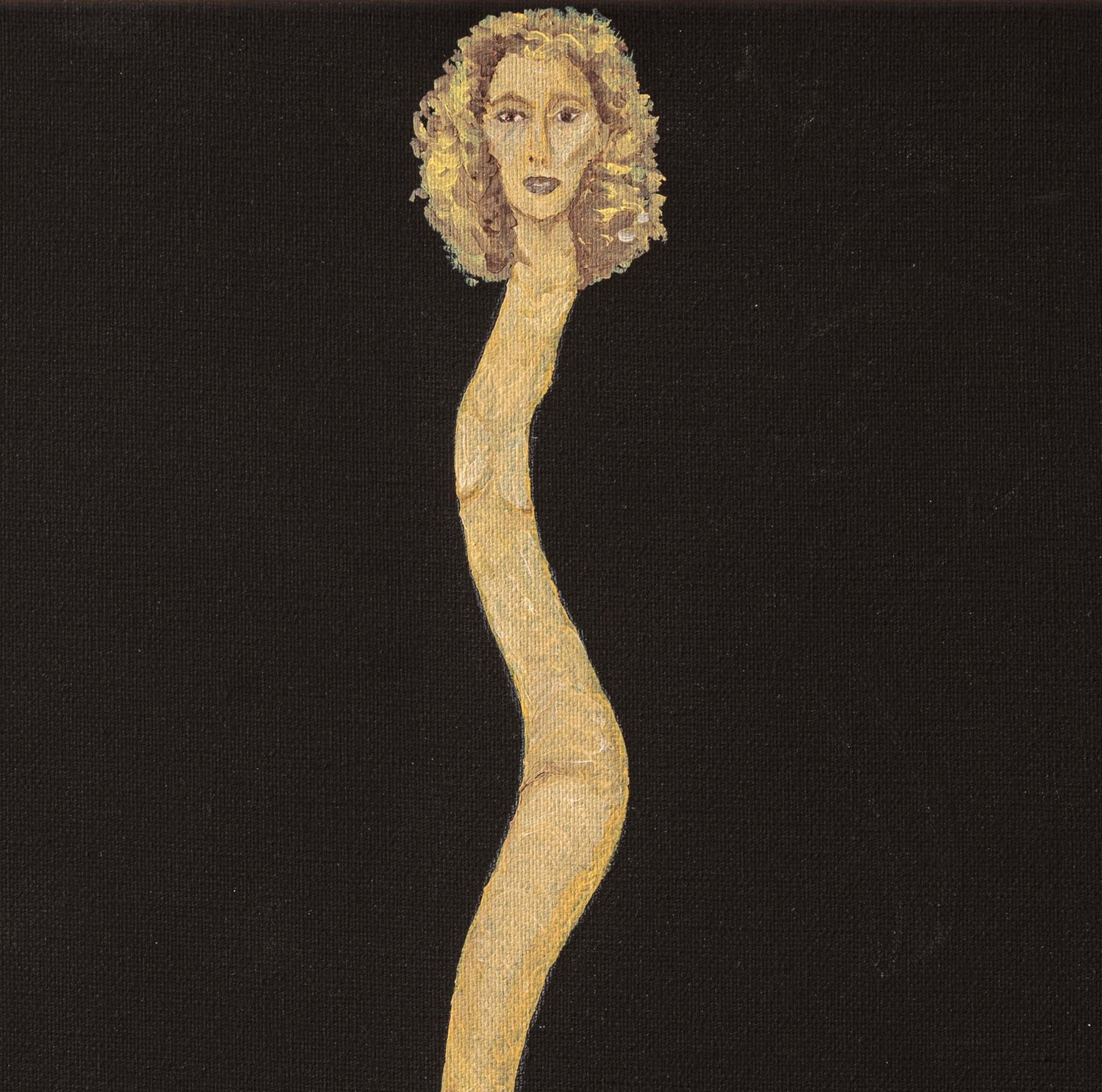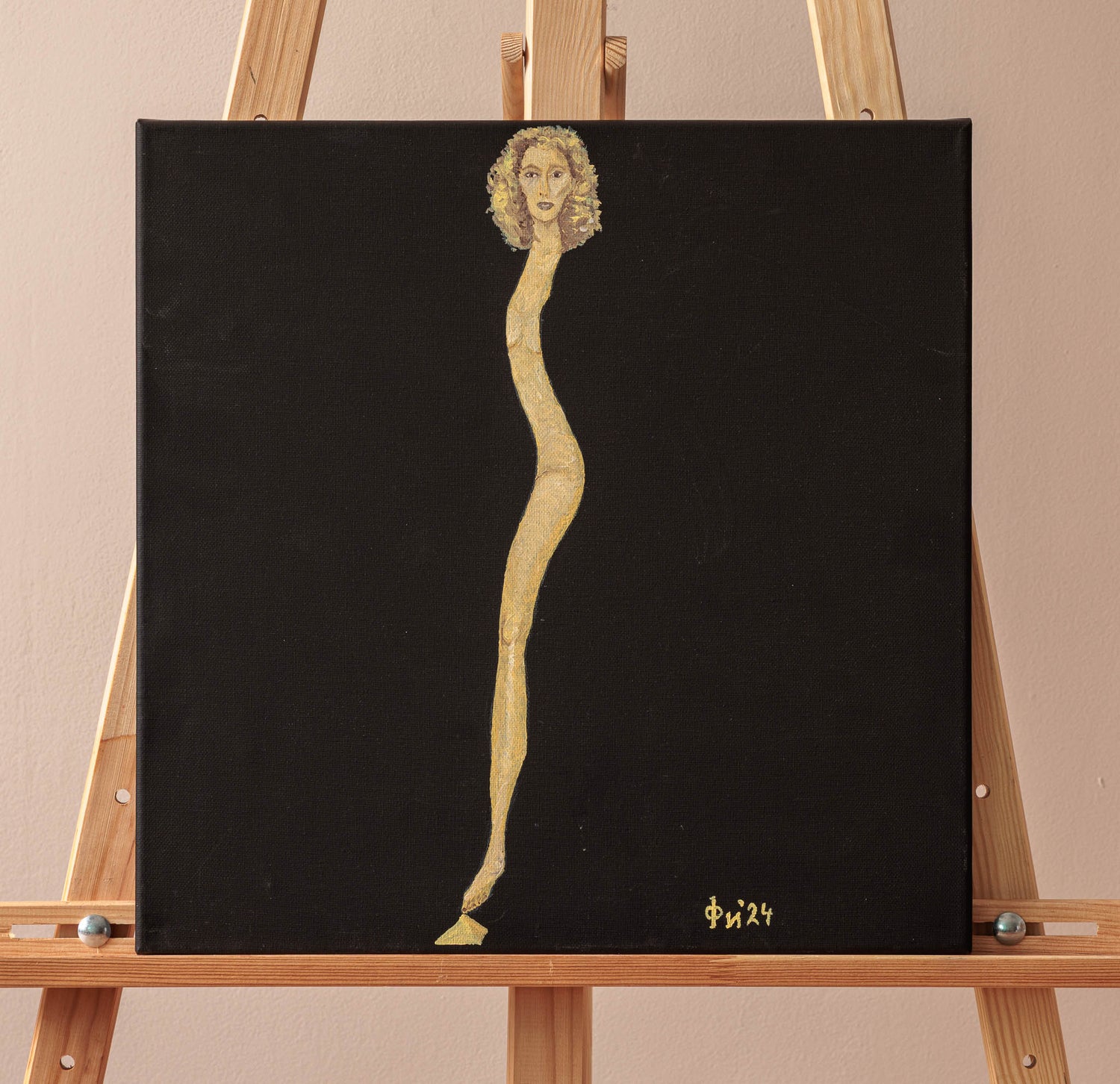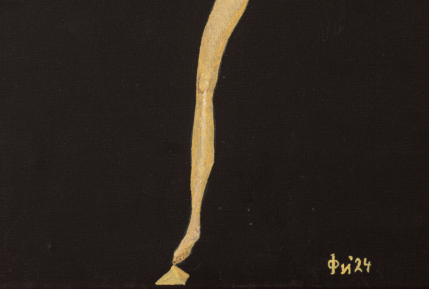 Фигурата се изтегля в почти нереална вертикалност, балансирайки между крехкост и вътрешна сила. Контрастът между тъмния фон и светлото тяло подчертава усещането за уязвимост и концентрация. Образът е едновременно деликатен и смел – визуална метафора за устойчивостта на женското присъствие, сведено до знак и линия.