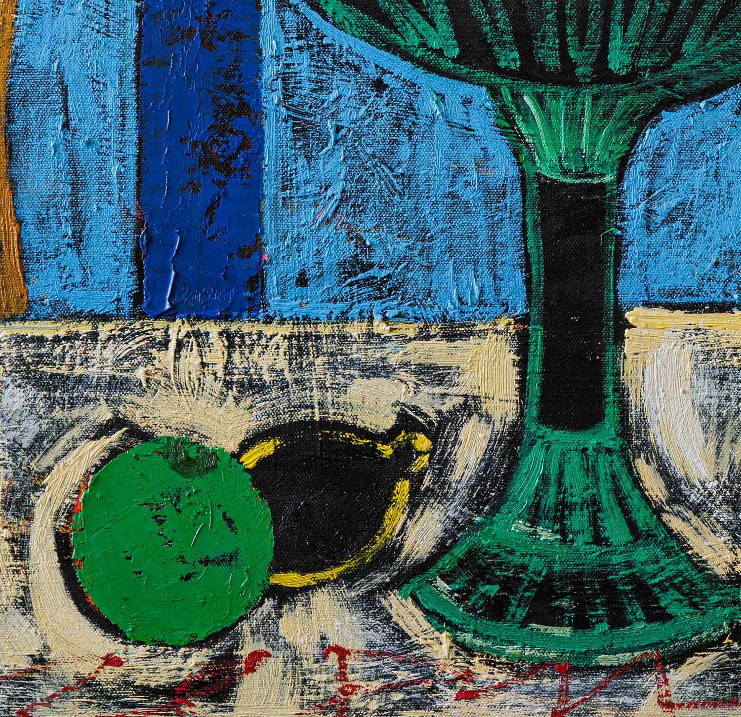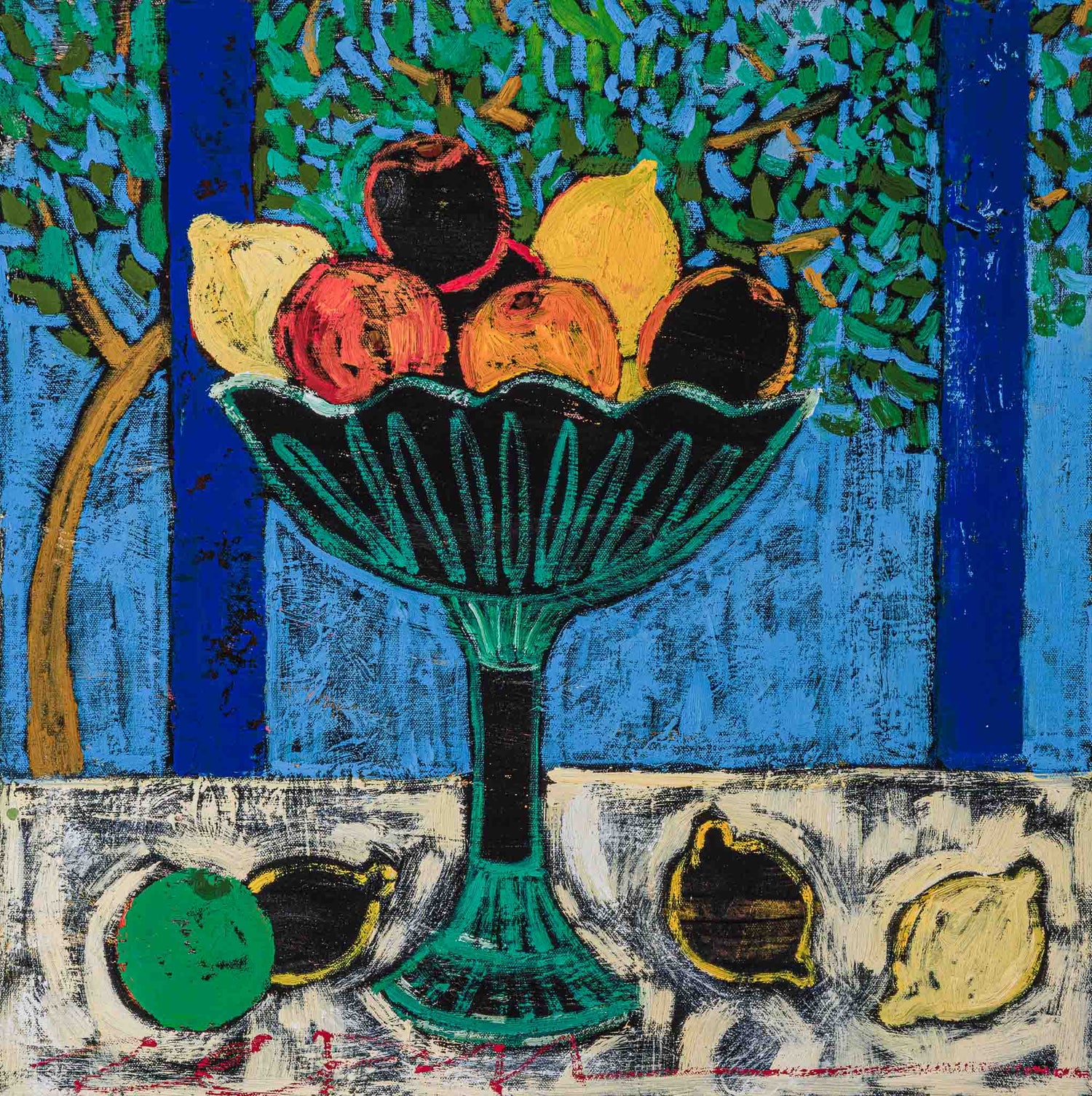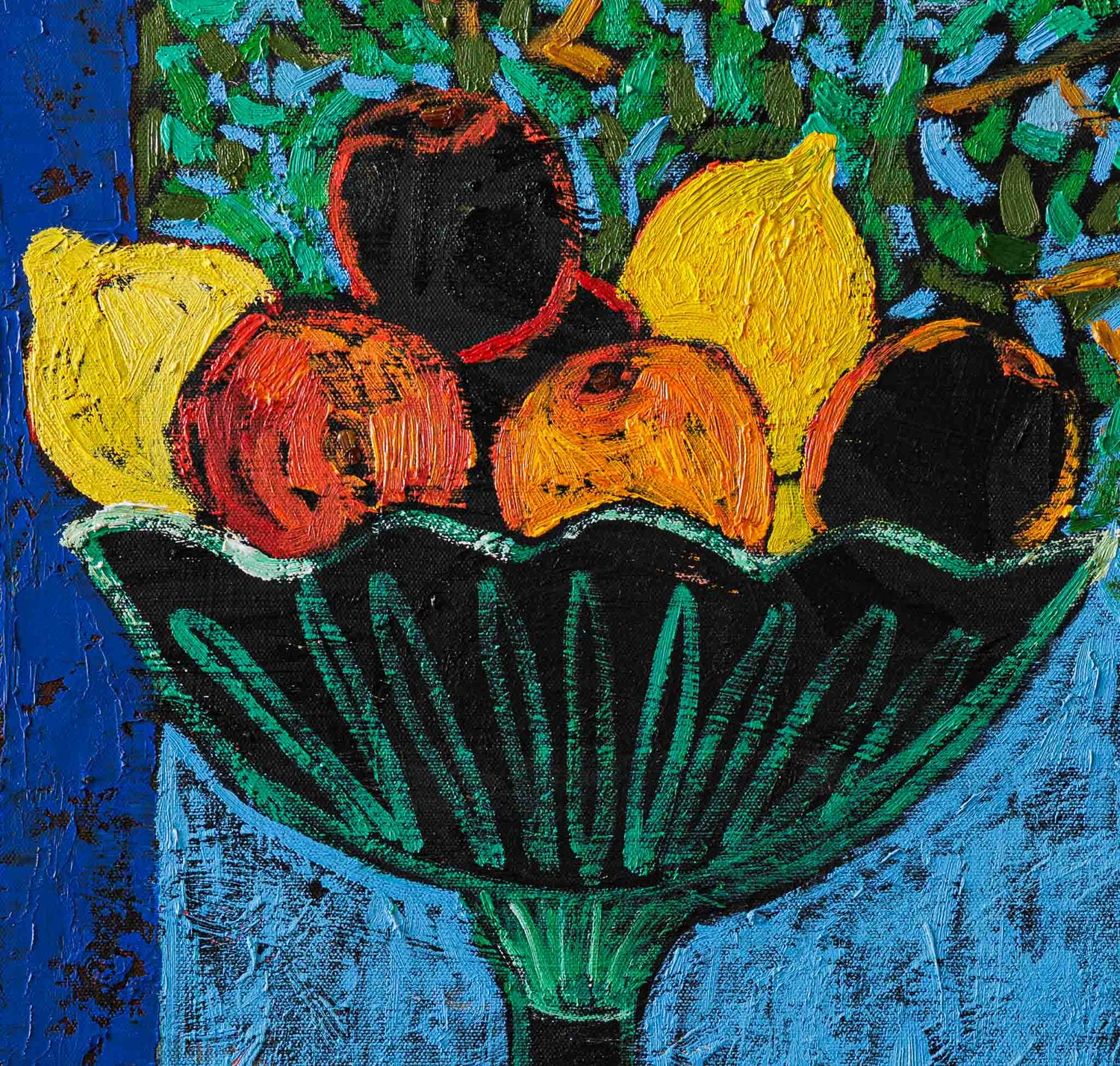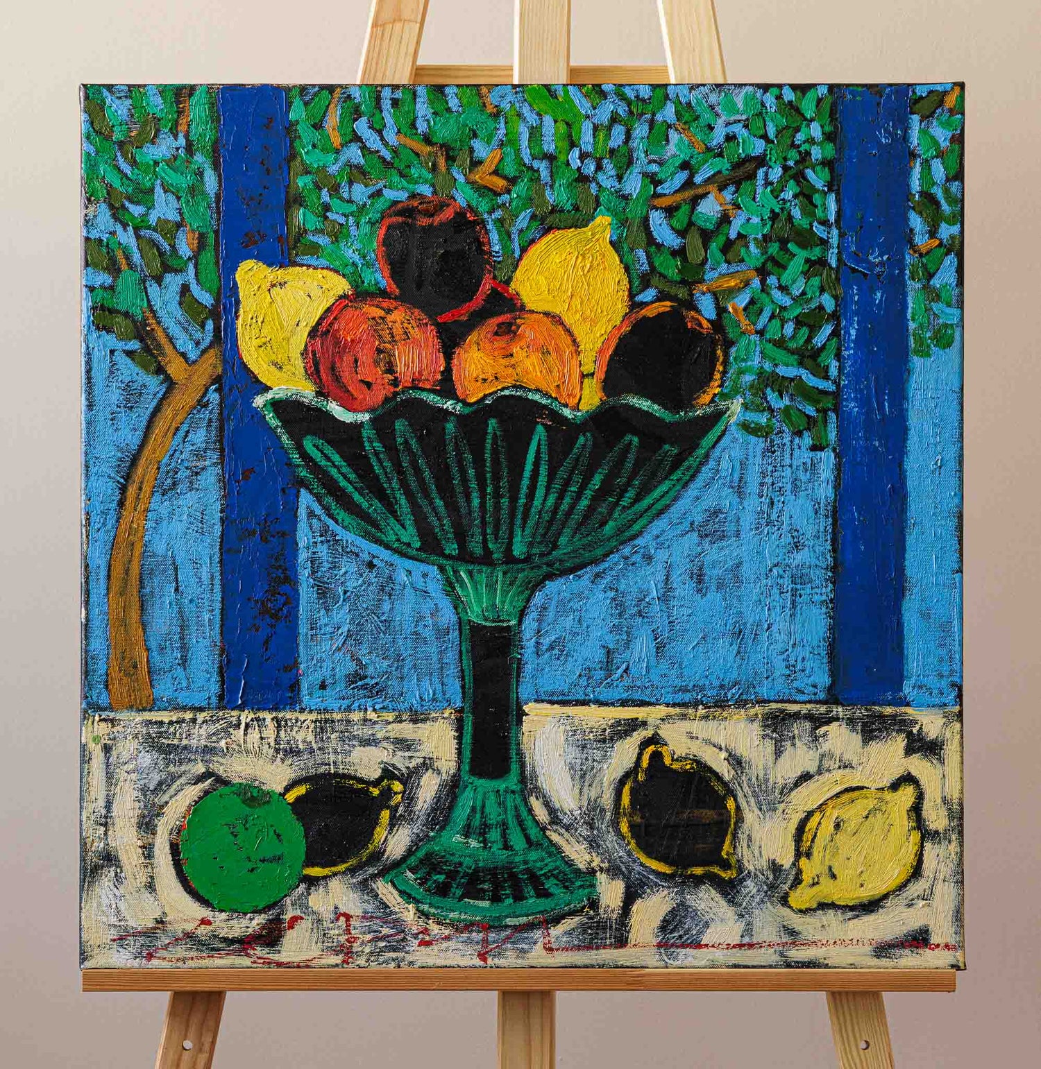 Фруктиерата с плодовете се издига като център на тежестта, около който пространството се разгръща в ясно структурирани цветни полета.