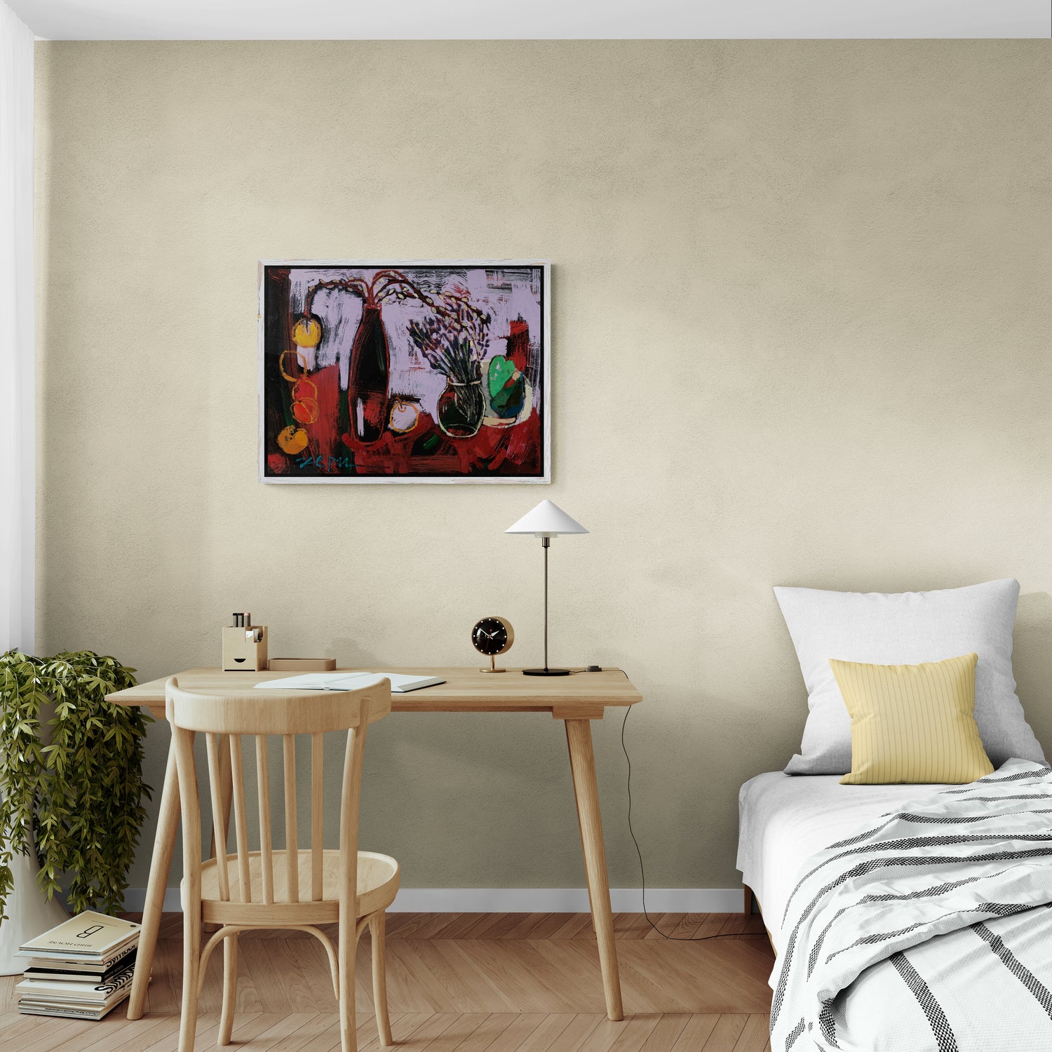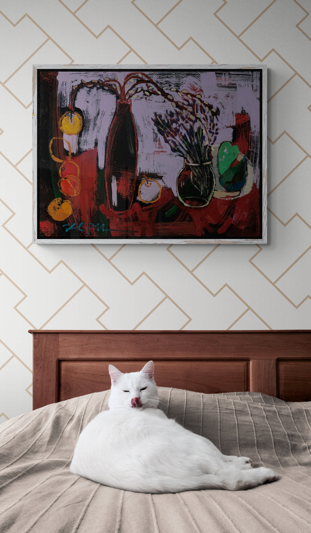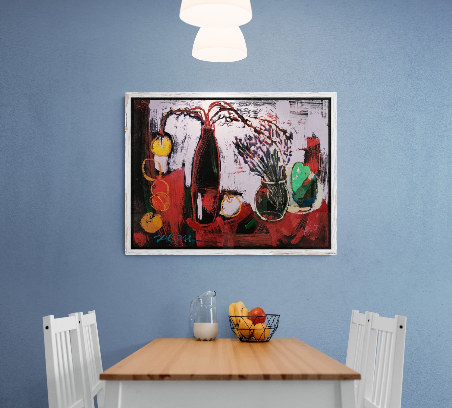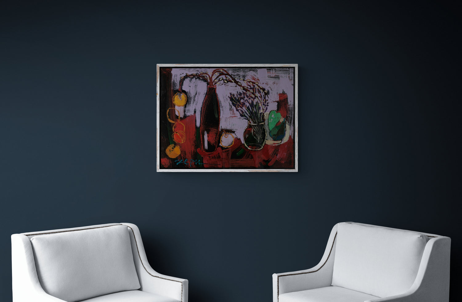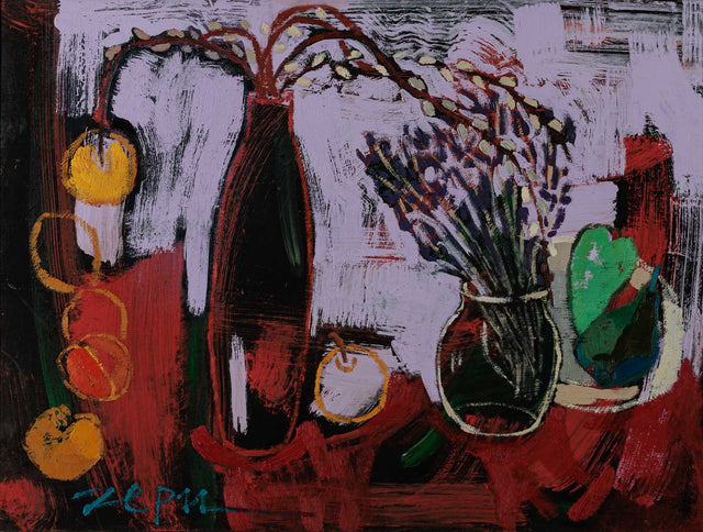 Смела експлозия от цвят и форма, която носи усещане за музикален ритъм и хармония. Лилавите и червени тонове се преплитат в динамична композиция с обобщени, но разпознаваеми предмети — вази с цветя, плодове и листа. Усеща се жестът на четката и свободата на движението, което придава живост и спонтанност. Сцената е едновременно натюрморт и емоционално изражение — „рапсодия“, която съчетава енергия и елегантност.