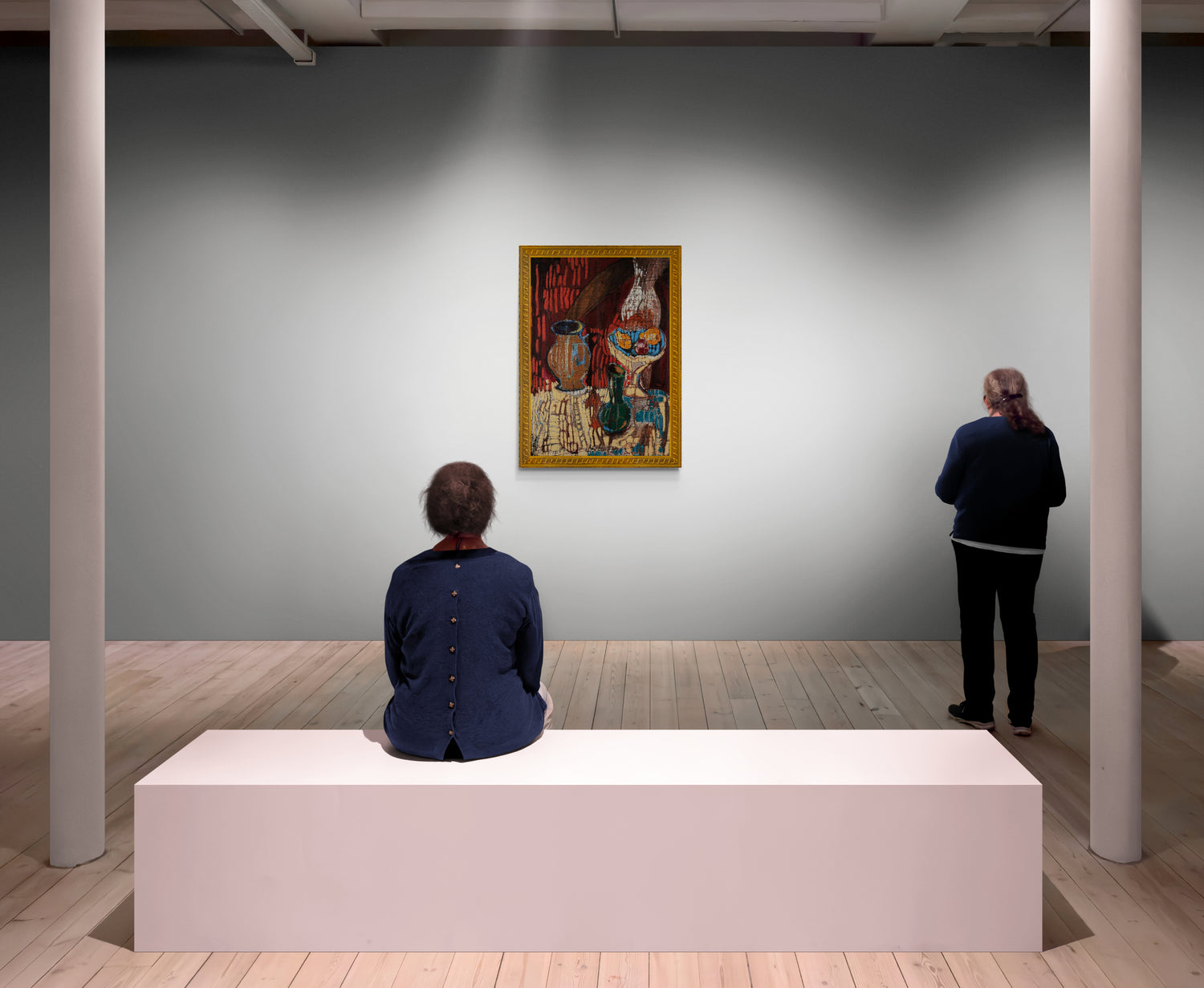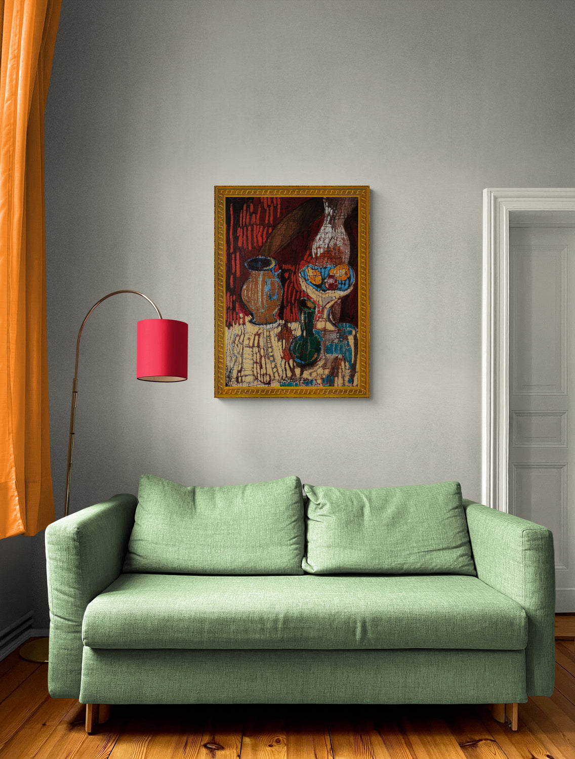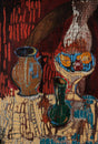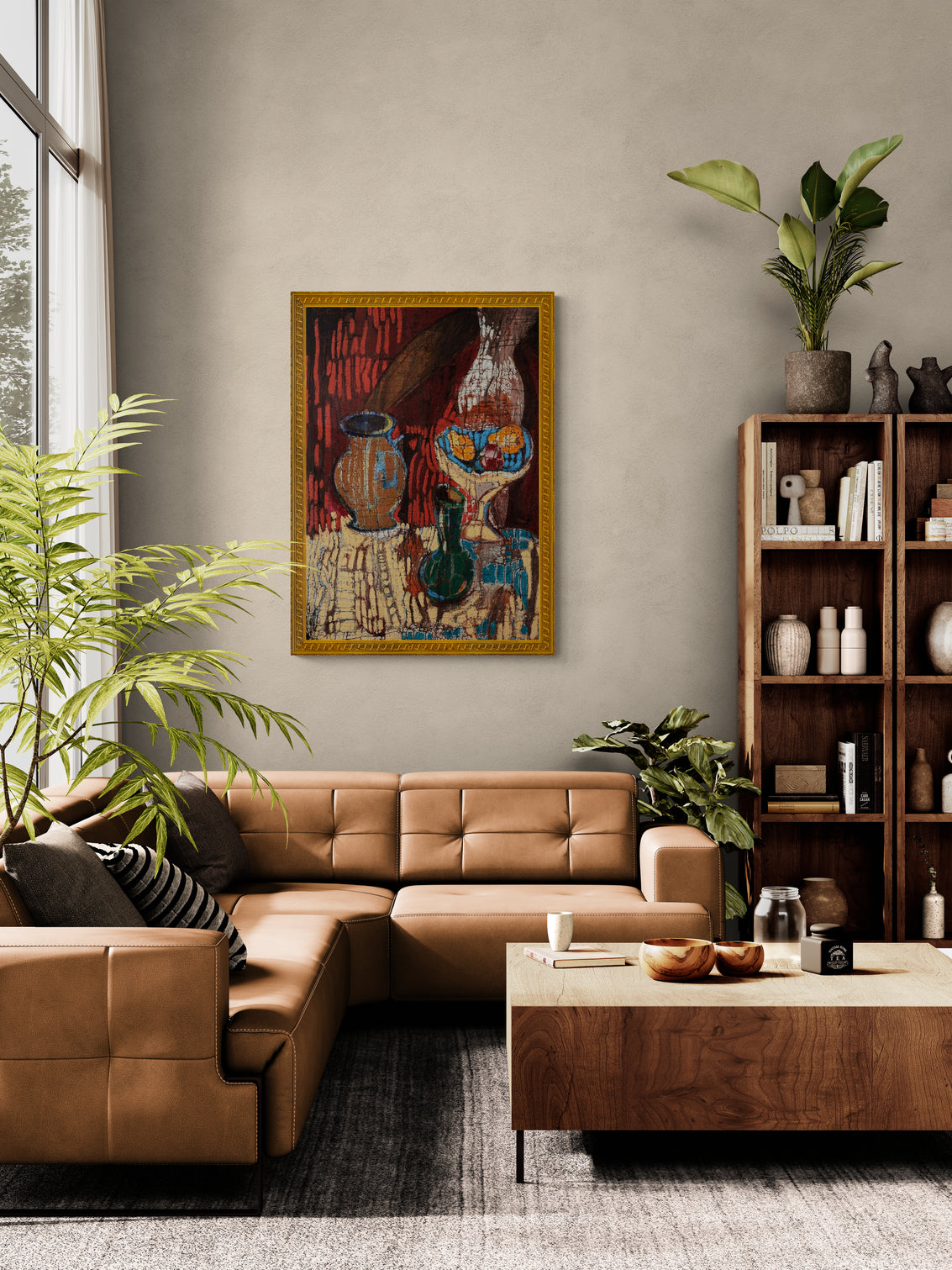 Композицията е изпълнена с жизнена експресия и текстурна плътност, характерна за стила на автора. Смелите цветови контрасти между охра, керемидено червено, синьо и зелено изграждат усещане за топлина и чувственост. Предметите — плодове, кана и вази — са разположени в богата, почти абстрактна среда, където линиите и текстурите вибрират и придават ритъм на цялата сцена. Това е натюрморт, който говори със своя вътрешен живот, отвъд обикновеното подреждане на предмети.