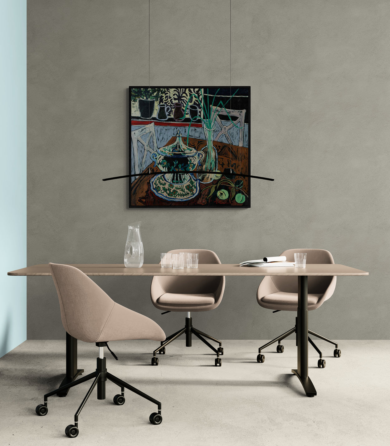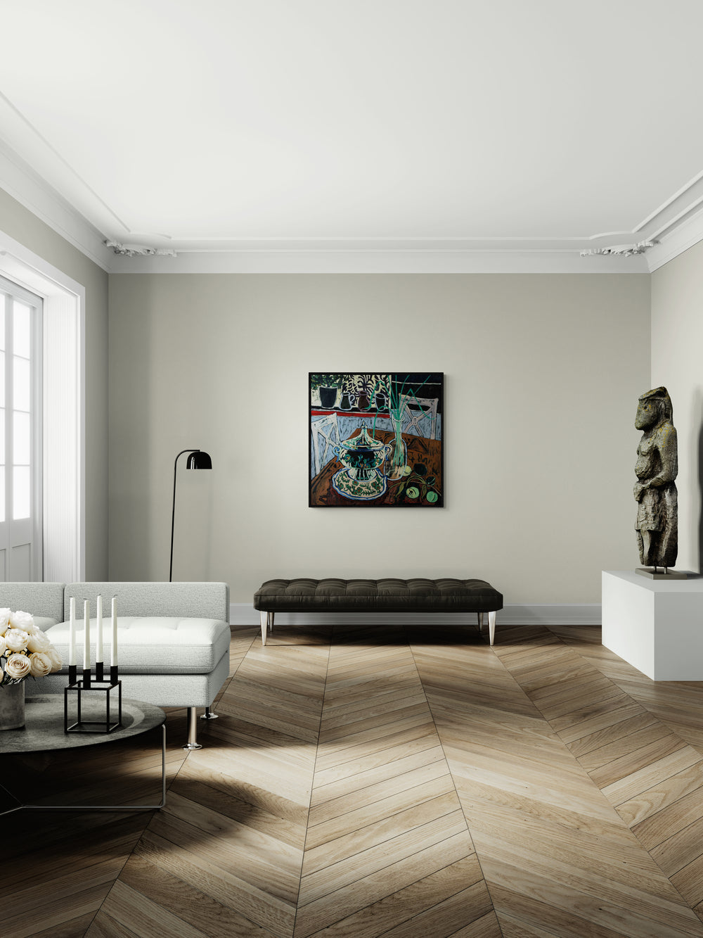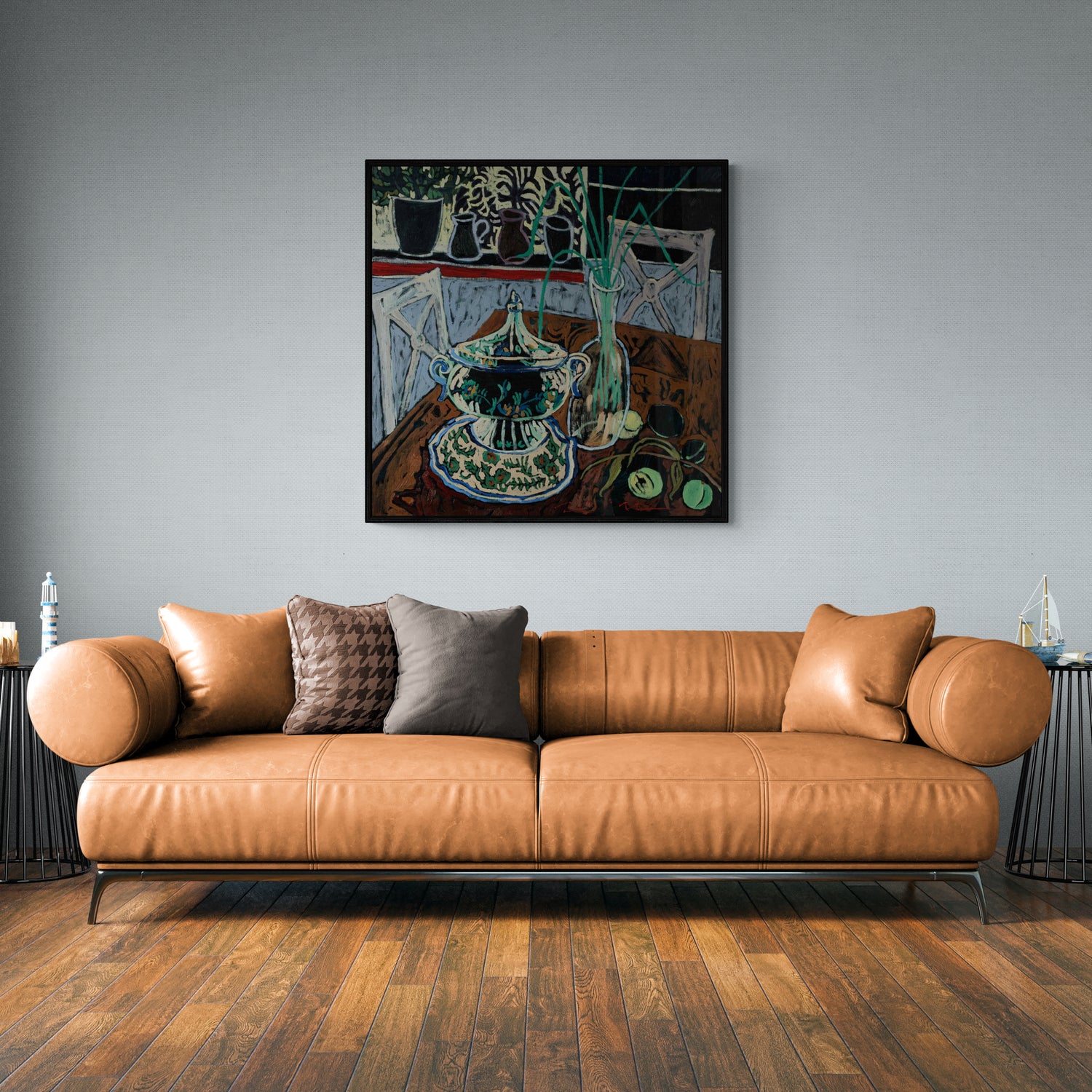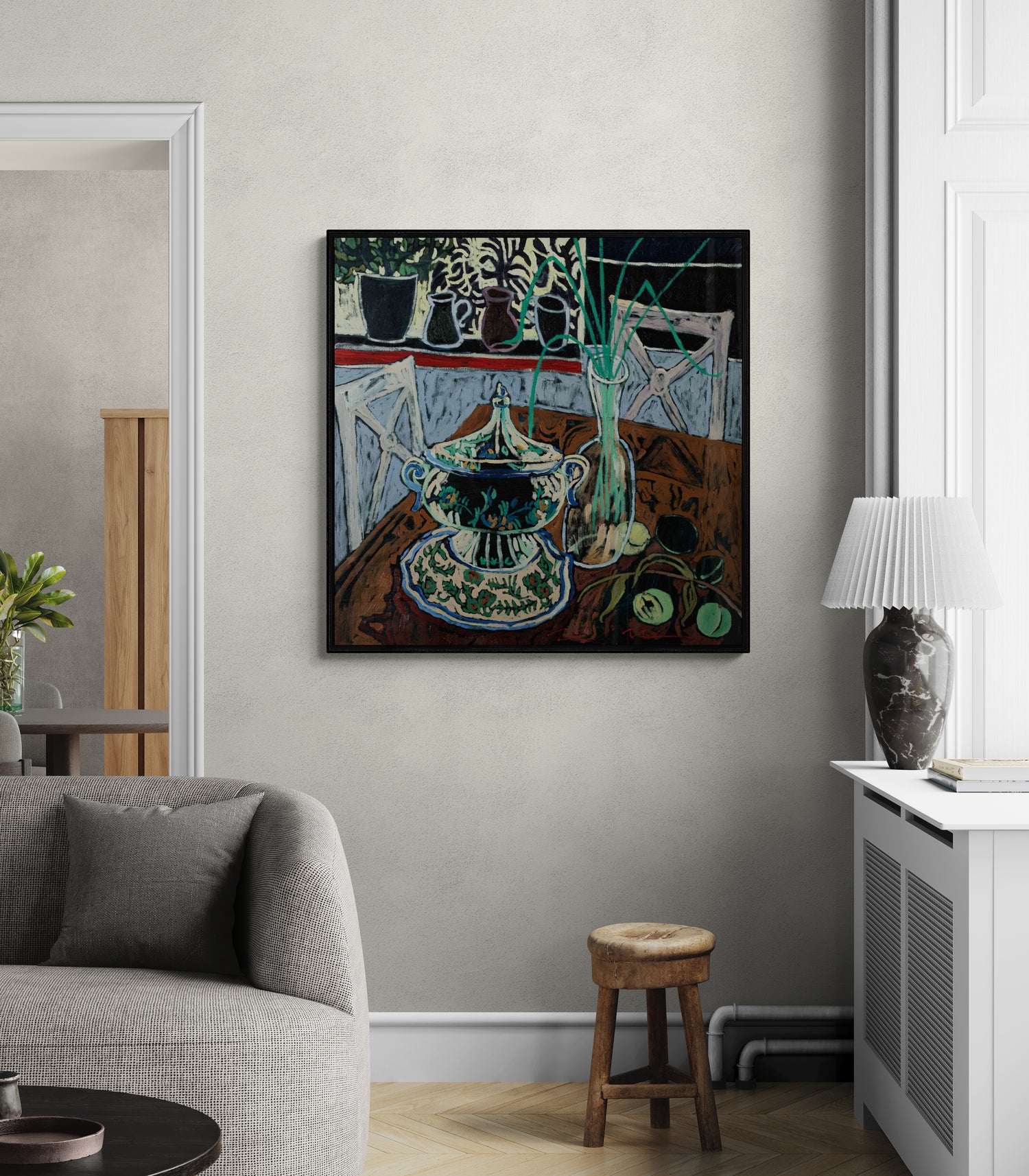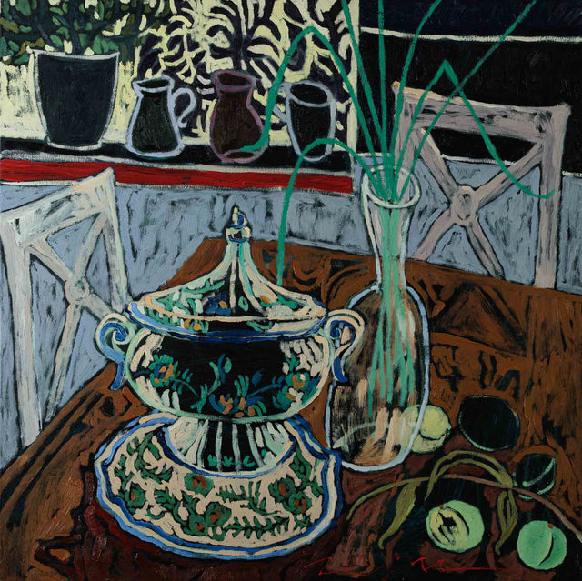 Ярка и богата на емоции композиция, която обединява декоративни елементи с характерен контур и стилизация. Изисканата супник със сложни флорални мотиви контрастира със семплите плодове и прозрачна ваза, докато задната стена и столовете добавят усещане за уютна вечерна сцена. Пастозната мазка и наситените тонове създават впечатление за изразителна ръчна работа, която балансира между реалността и декоративната условност.