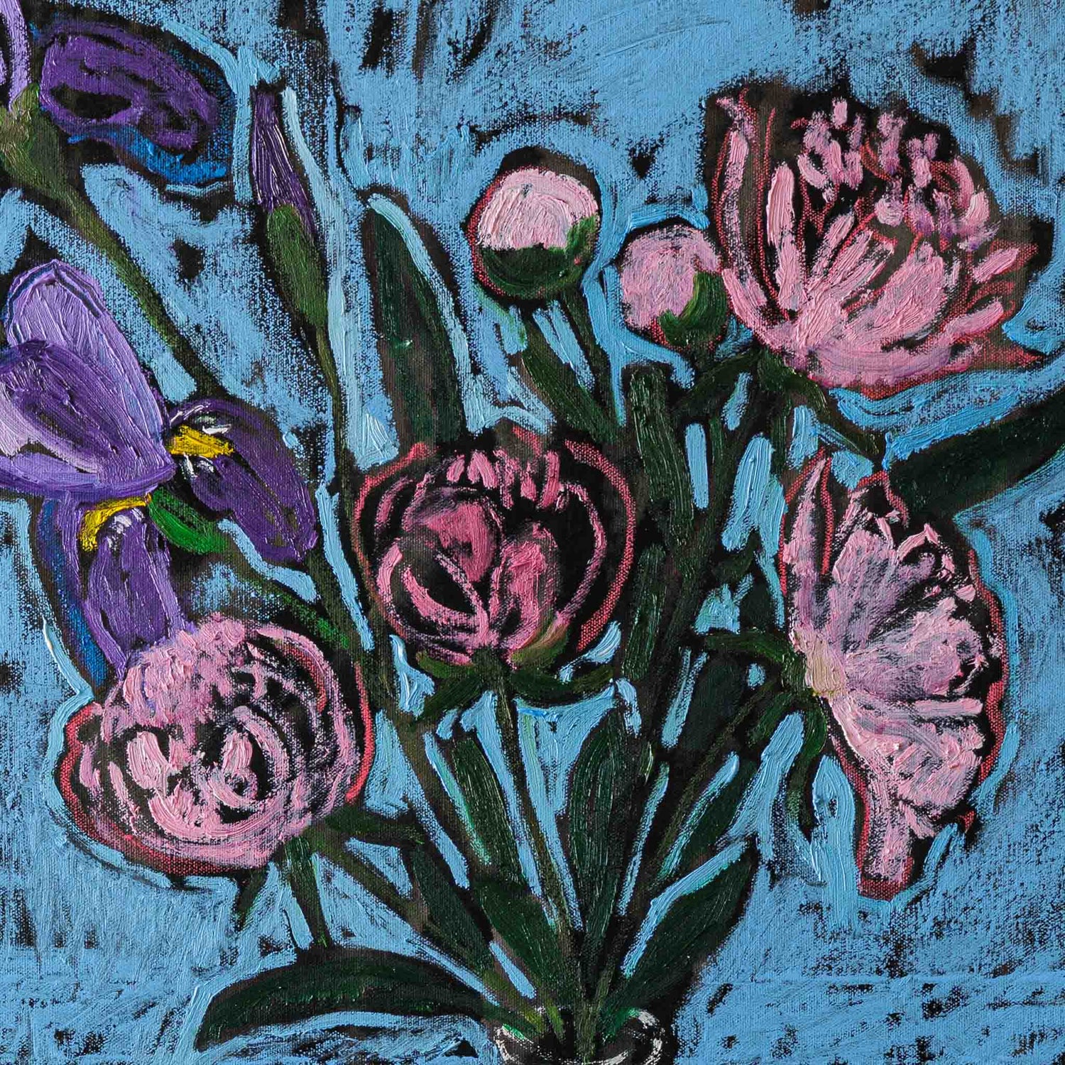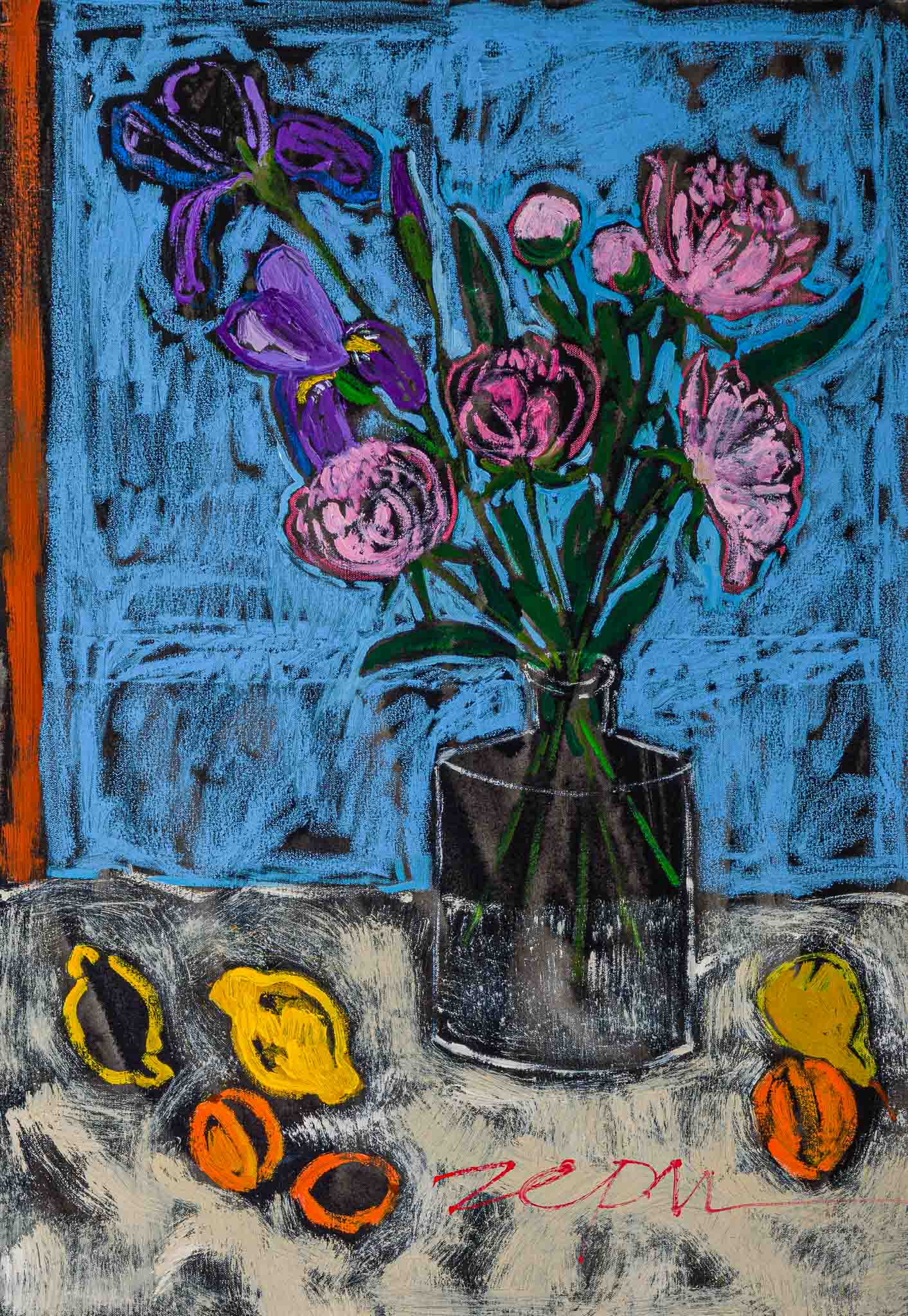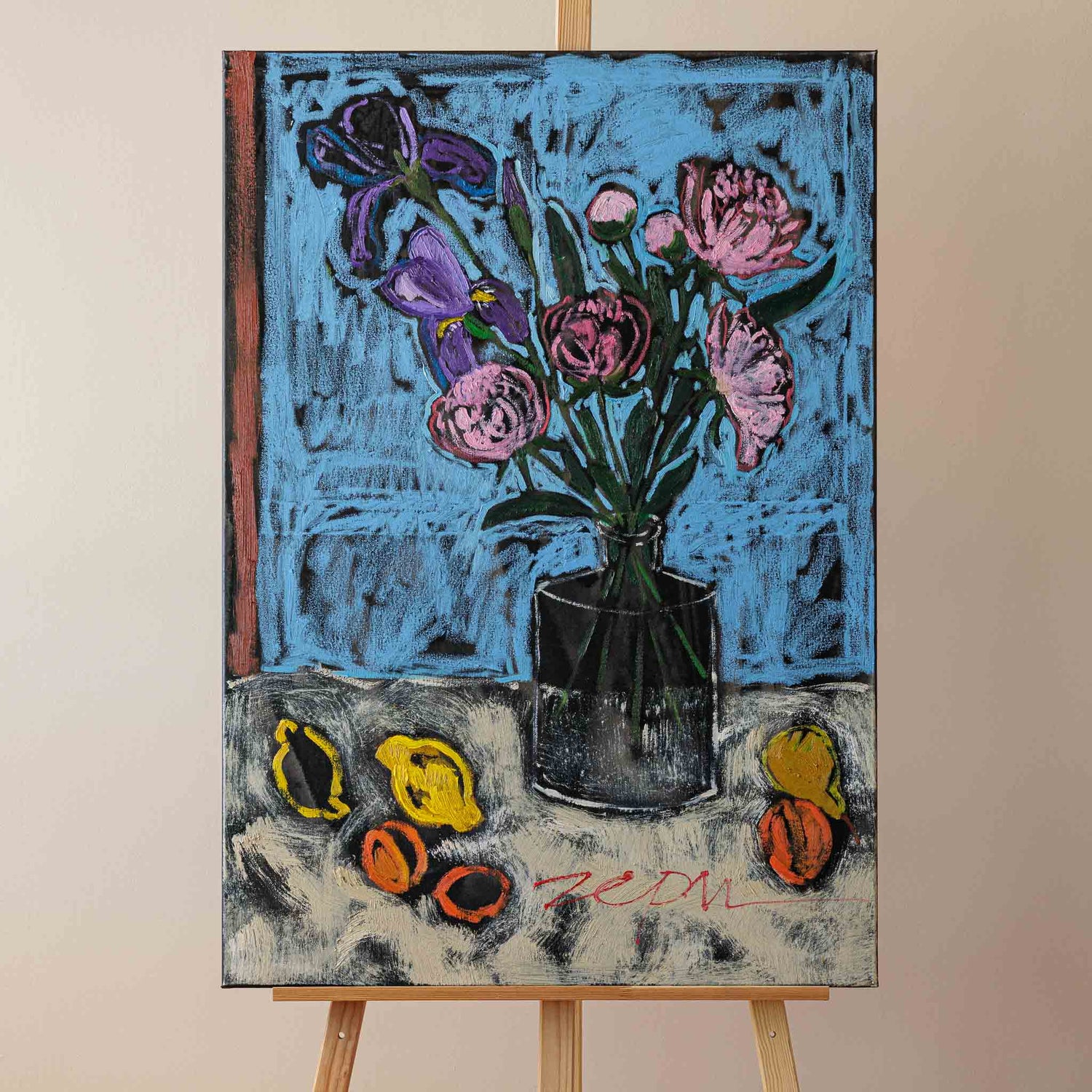 Синьото поле зад цветята служи като живописен фон, който подчертава контраста между студените и топлите тонове – пурпурните ивици на ирисите и божурите, жълтите плодове и приглушените сенки на вазата.