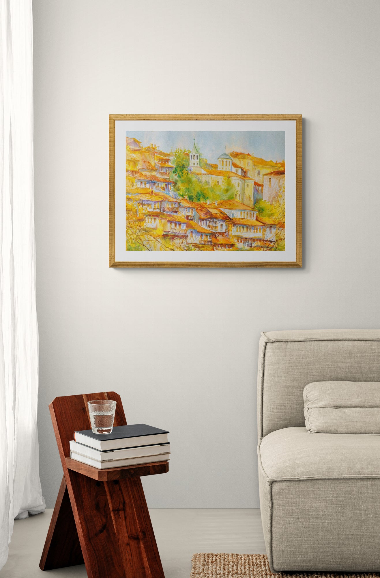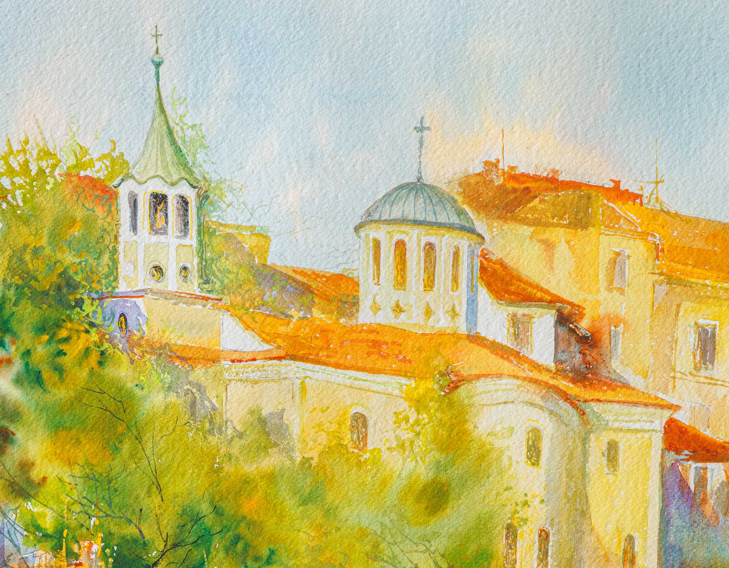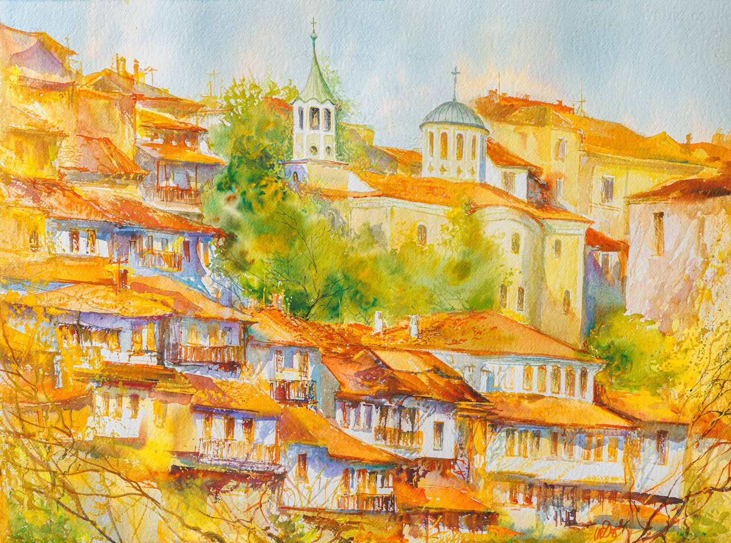 Тук слънцето прелива в керемидени покриви, а старите къщи се спускат по хълма като пъстър водопад. Архитектурата и природата се вплитат в хармония, която улавя духа на Велико Търново – града на спомените, гледките и времето, което тече по-бавно. Акварелната техника придава особена мекота и лекота на композицията, превръщайки я в жива поема за българското лято.