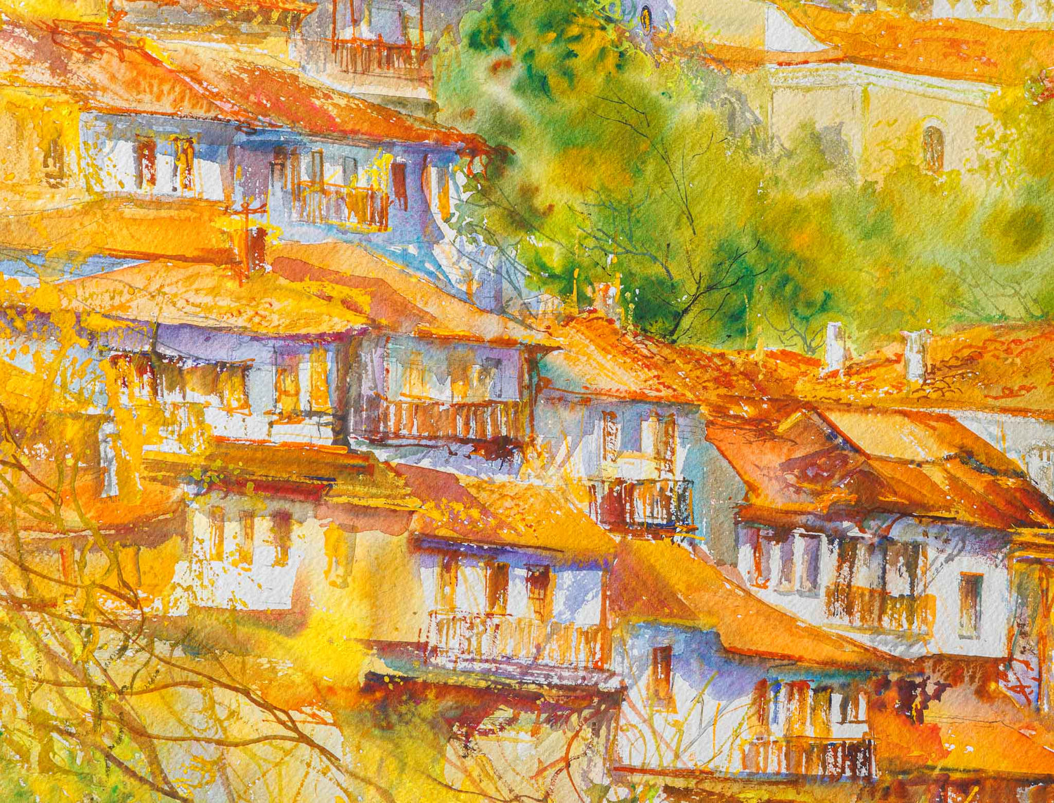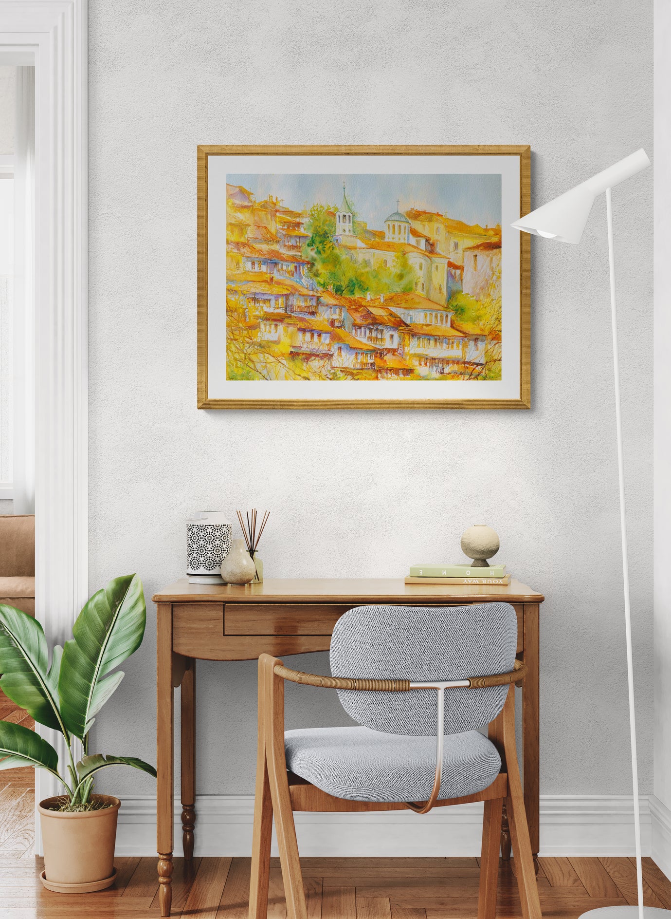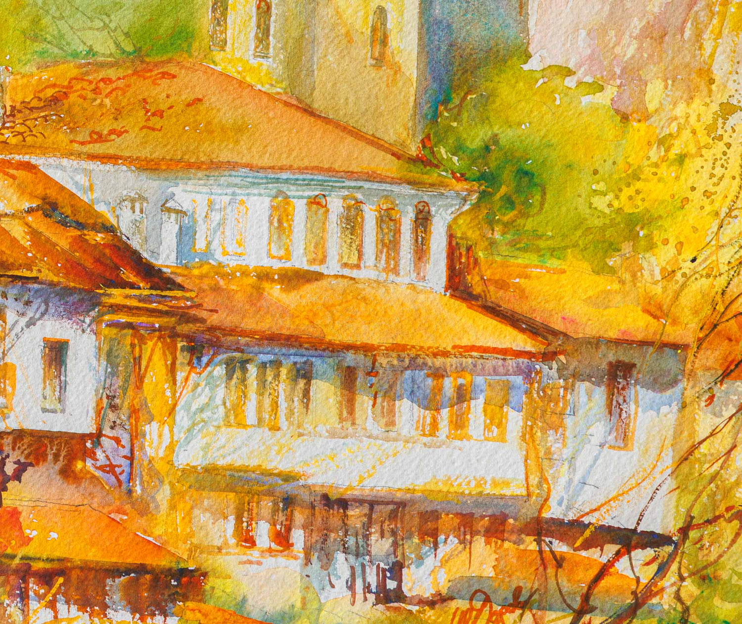 Тук слънцето прелива в керемидени покриви, а старите къщи се спускат по хълма като пъстър водопад. Архитектурата и природата се вплитат в хармония, която улавя духа на Велико Търново – града на спомените, гледките и времето, което тече по-бавно. Акварелната техника придава особена мекота и лекота на композицията, превръщайки я в жива поема за българското лято.