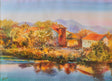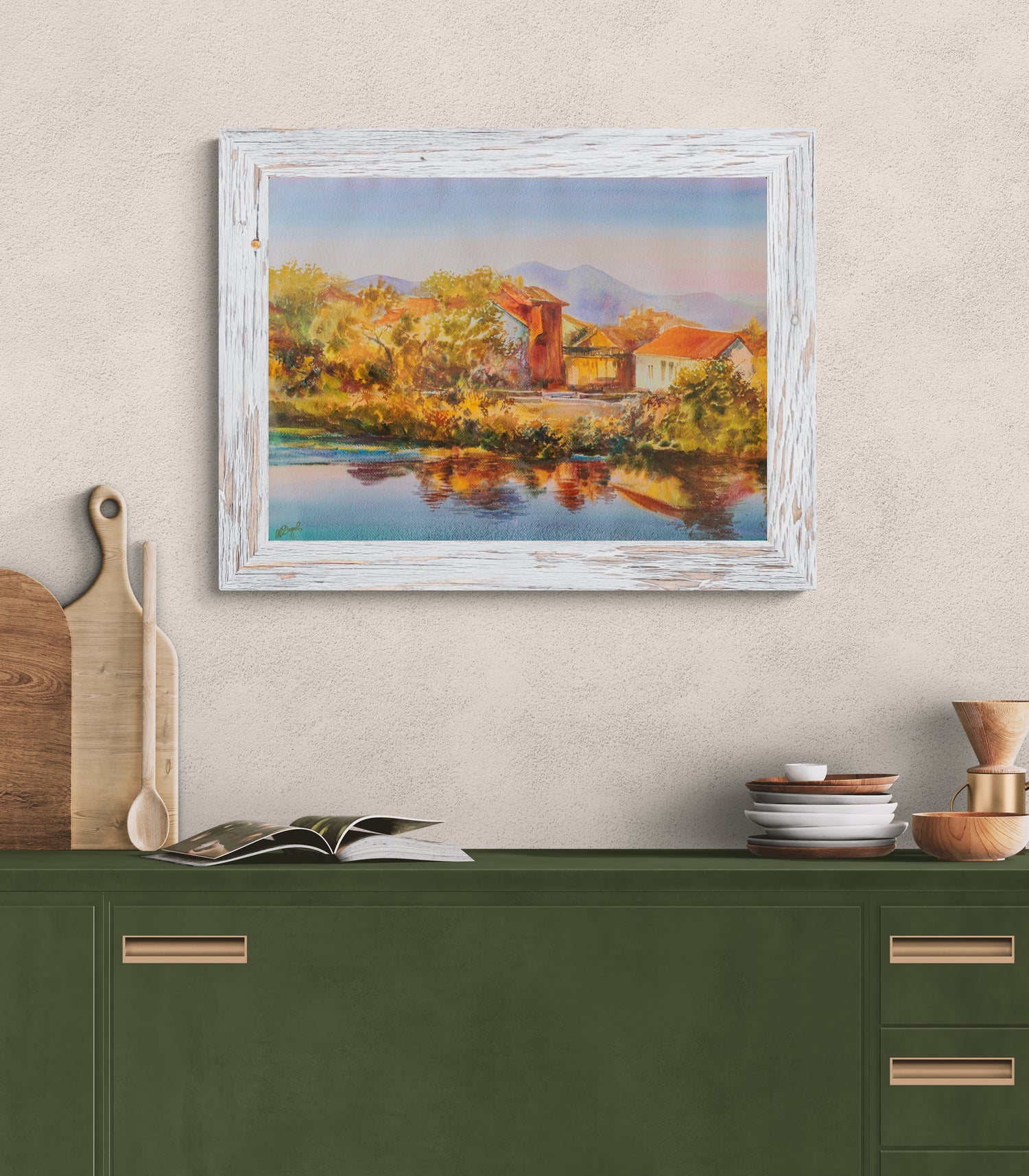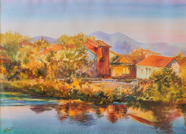 Къщи край езеро, обгърнати от меката светлина на следобеда. Дърветата и водата отразяват един и същ златист пулс, а линията между реалност и отражение почти се размива. В далечината – силуети на планини, които придават усещане за дълбочина и вечност. Пейзаж, в който времето е спряло, за да остави място на тишината.