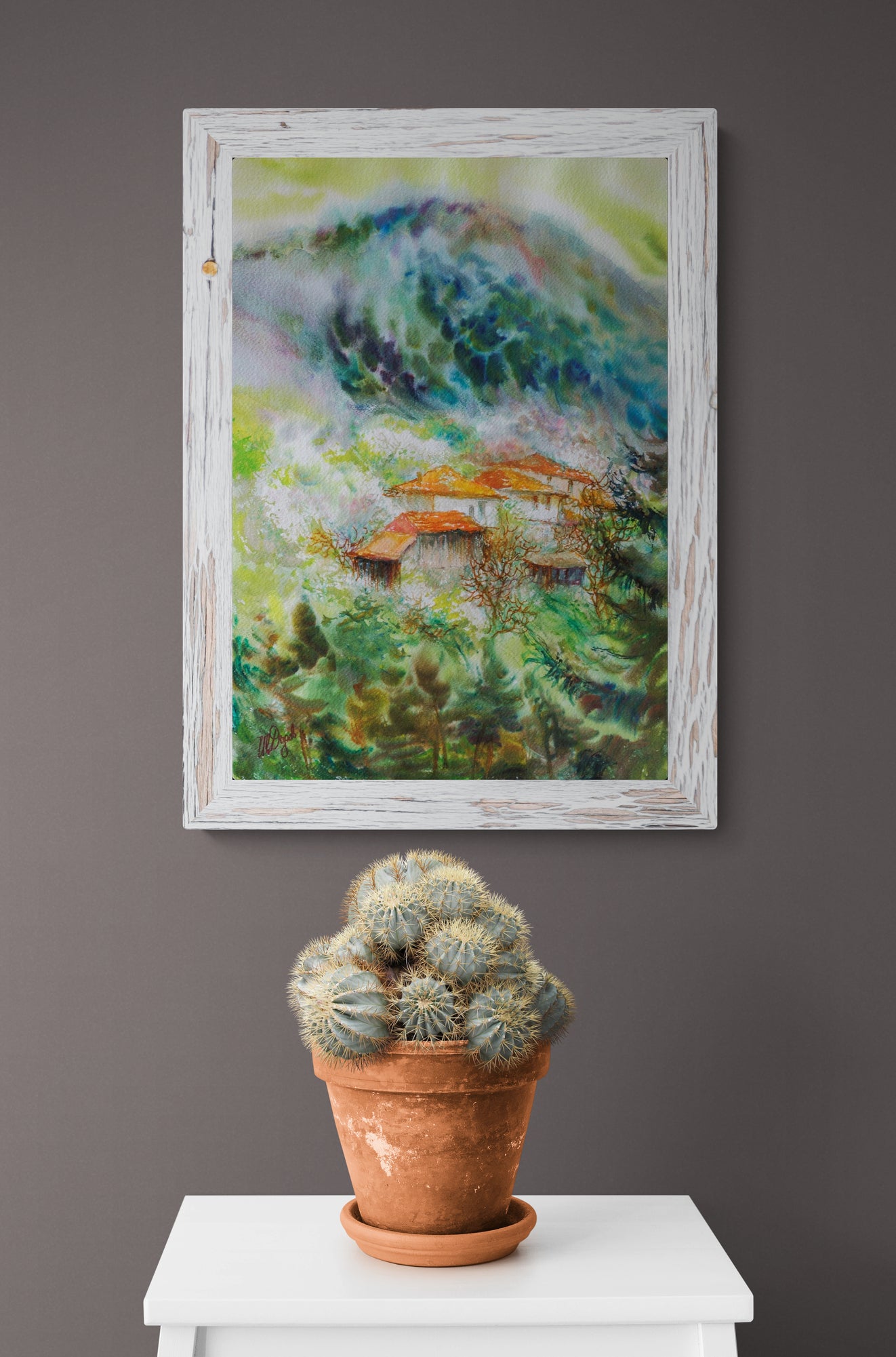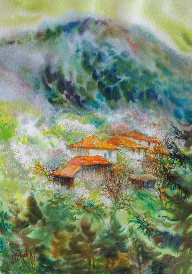 Пролет в Родопите – къщи с керемидени покриви, сякаш изникнали от мъглата на събуждащата се гора. Цветовете са приглушени, разтворени като спомен или сън, а планината – жива и пулсираща на заден план. Акварелът улавя не просто пейзаж, а дъха на пролетта, когато всичко се връща към живот.