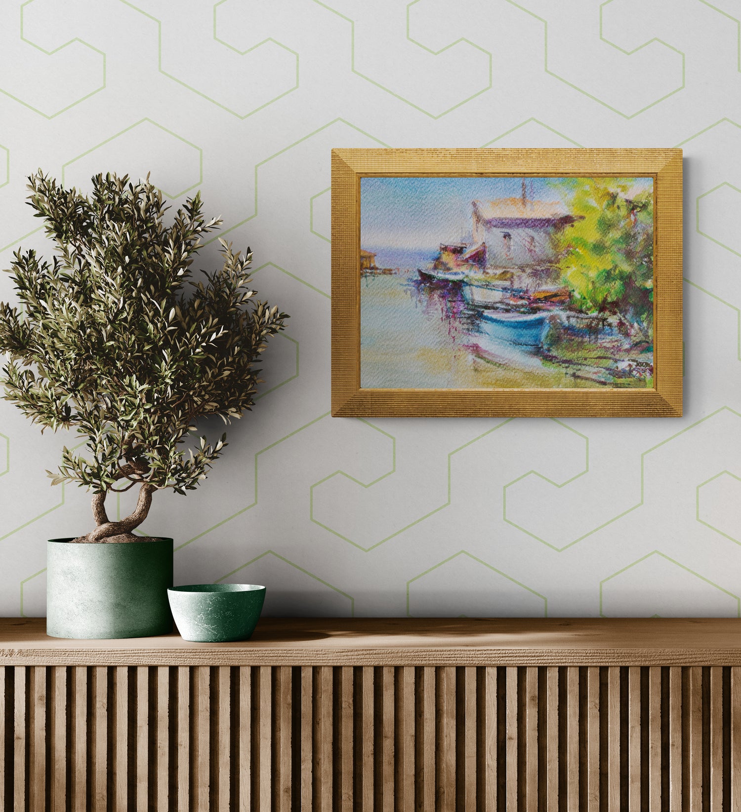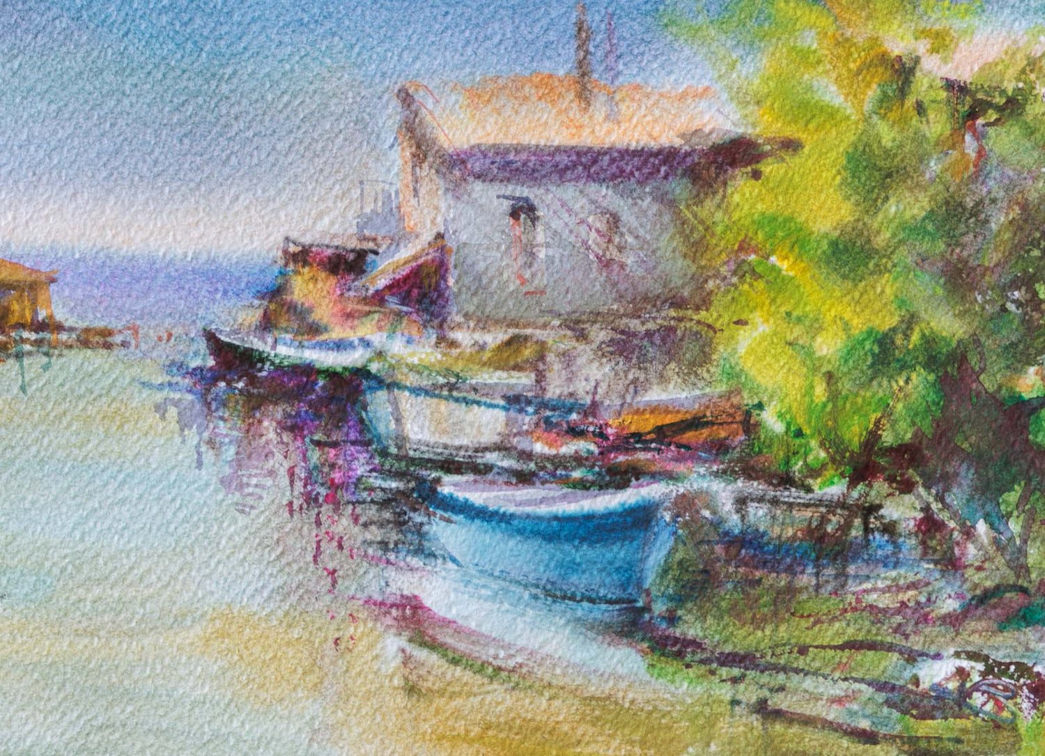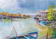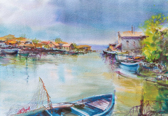 Рибарско селище, сгушено край тих канал, където лодките стоят неподвижни, а къщите сякаш нашепват спомени. Водата отразява небето в приглушени тонове, обгръщайки сцената в леко меланхолично спокойствие. Един ден без време – между ритъма на морето и простотата на човешкото присъствие.