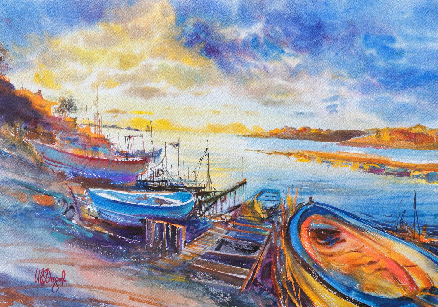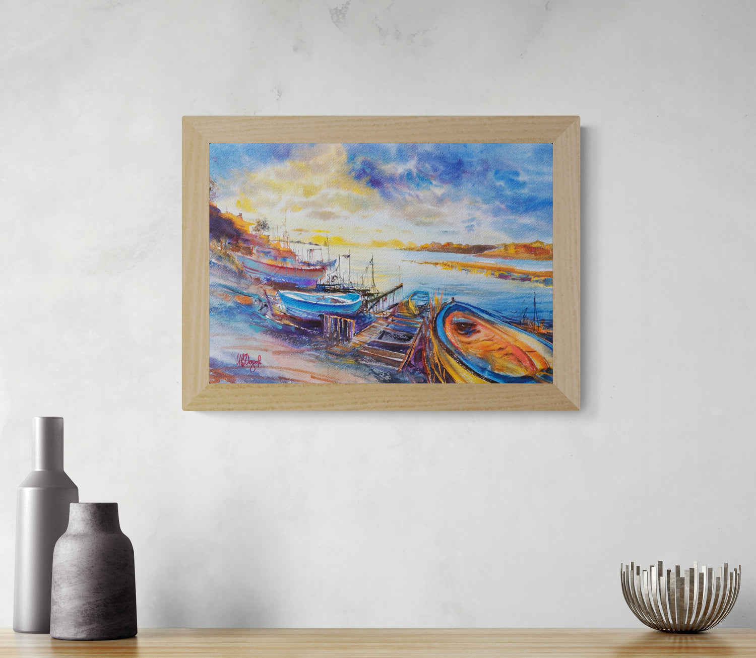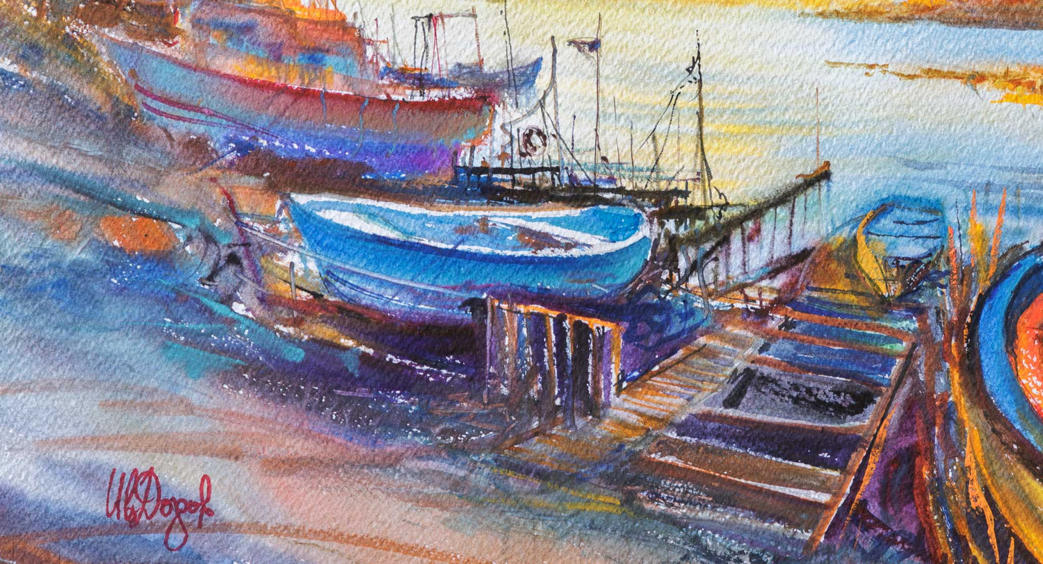 Сутрешна светлина огрява пристанище, където лодките почиват в тиха близост – сякаш са в разговор или нежно докосване. Цветовете са смели, наситени и живи – сякаш слънцето не просто изгрява, а рисува с четка. Морето и небето се сливат в хоризонт от емоции. Тази картина не просто изобразява – тя разказва за любовта към морето, в най-чистия ѝ вид.