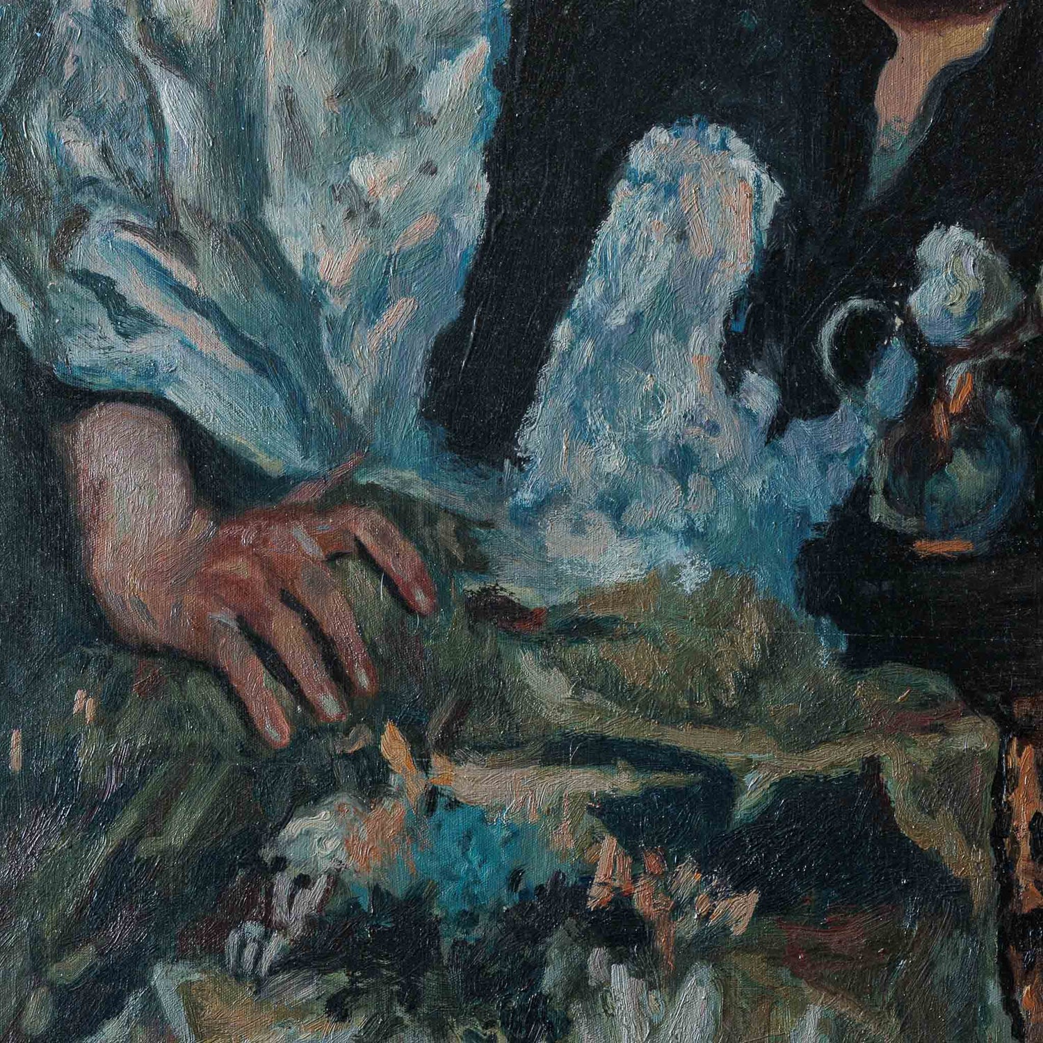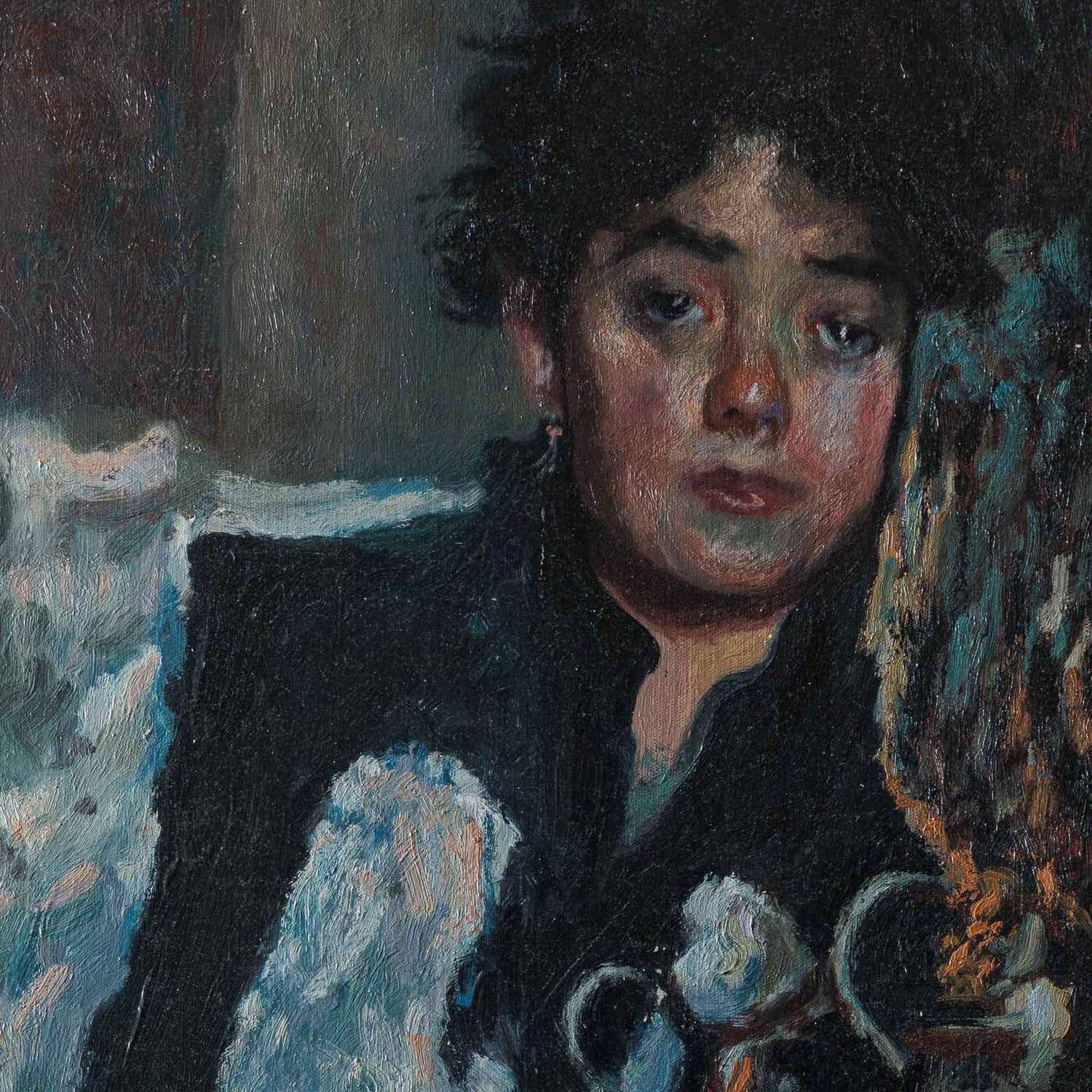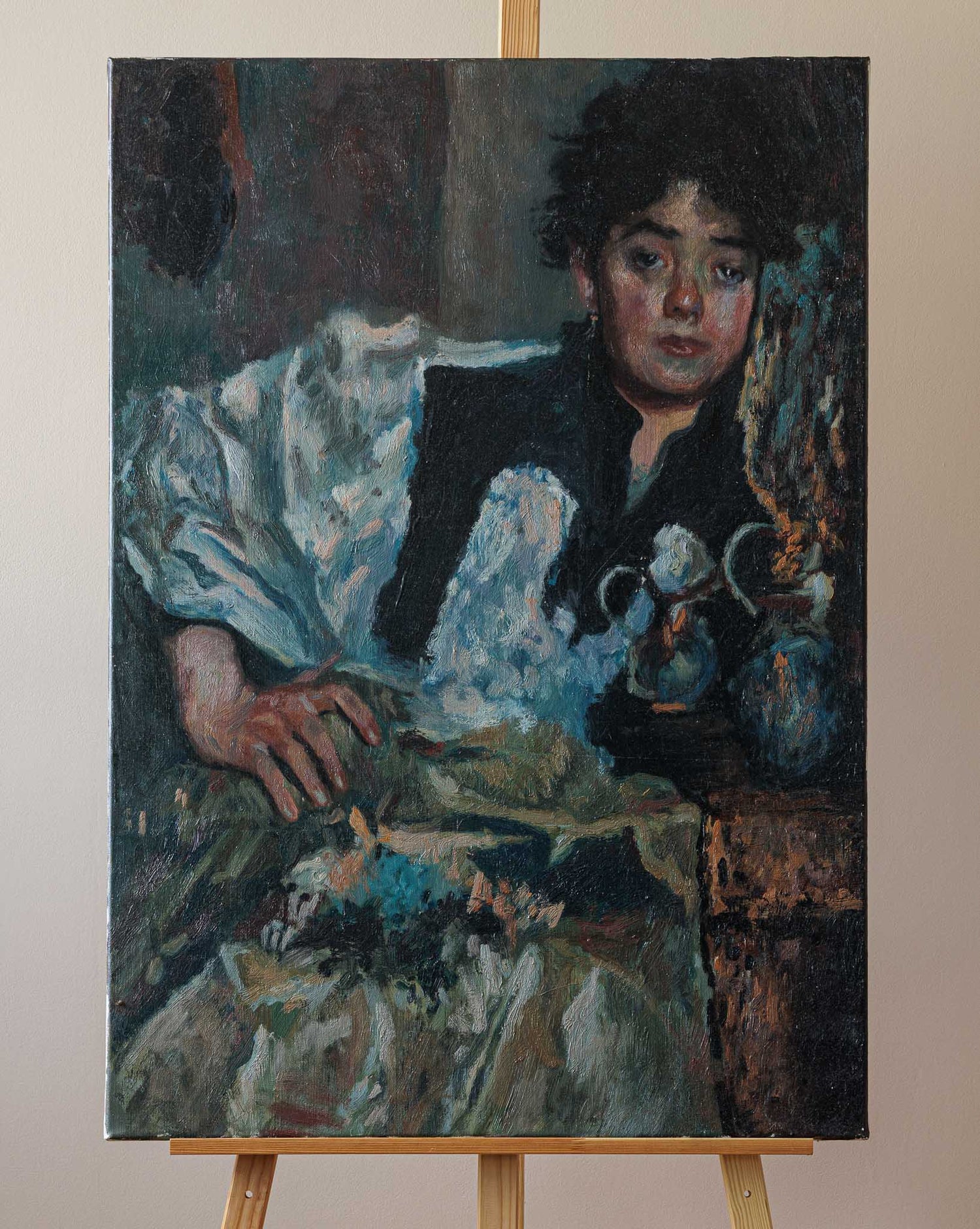 Художникът не просто преповтаря композицията, а я пречупва през собственото си усещане за човешка уязвимост и вътрешна сила. В погледа на модела и в експресивните мазки на четката се усеща напрежението между съзерцание и тъга, между плът и душа.