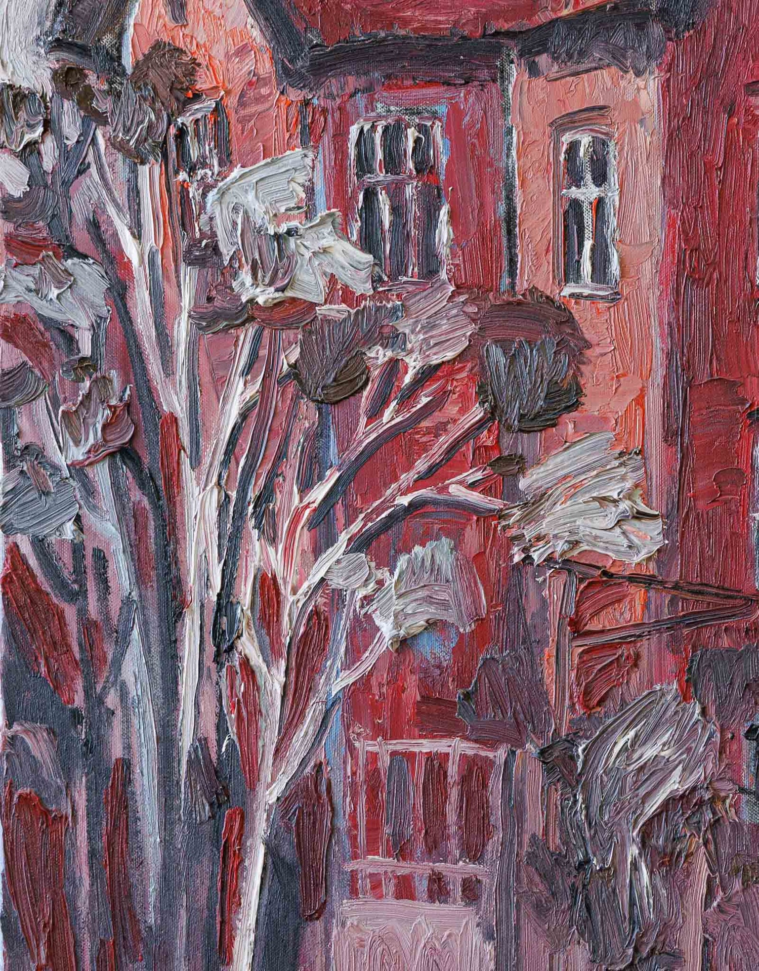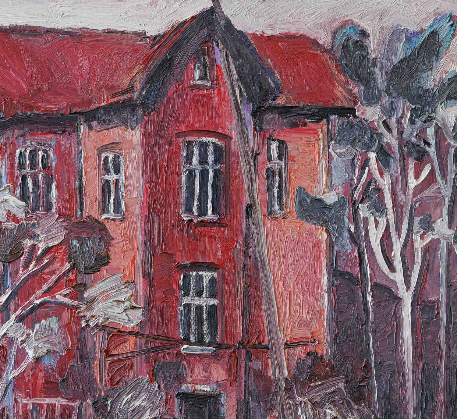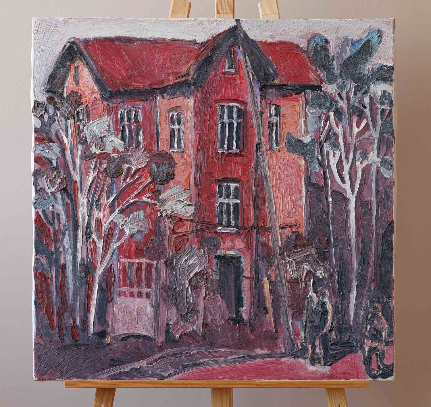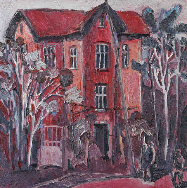 Картината представя фасадата на стара къща, изобразена с наситени червени тонове, които я превръщат в централна фигура на композицията. Контрастът с бледосивото небе и белите дървета придава драматичност и дълбочина. Силната текстура на четката създава усещане за движение и живот в иначе неподвижната сцена. Това е образ на архитектурното и културно наследство, пречупено през емоционалната енергия на автора.