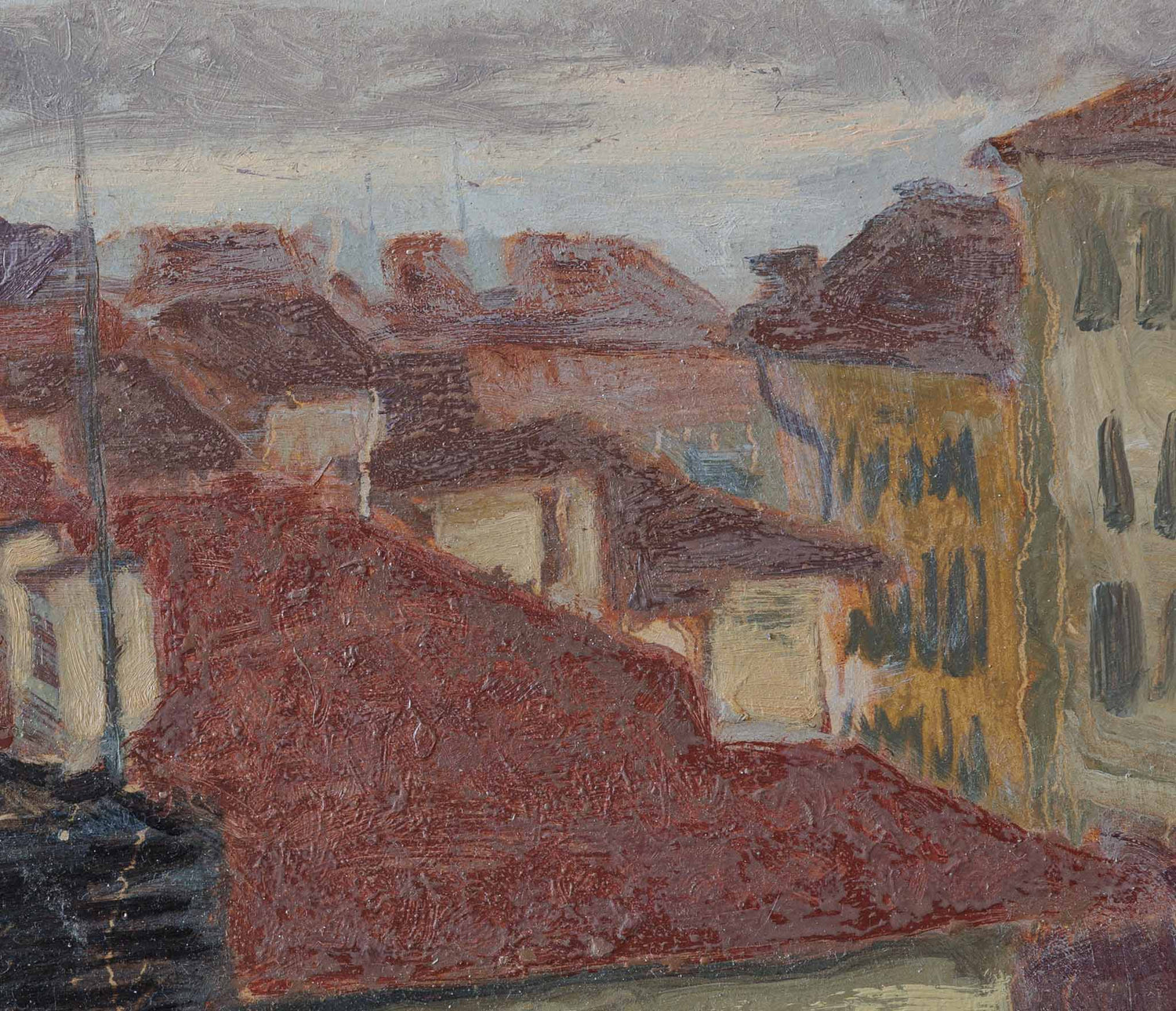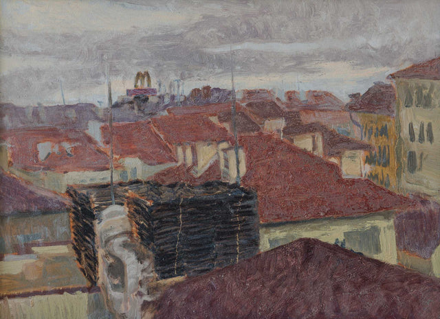 Погледът от високо разкрива плътна тъкан от покриви, където топлите керемиди се преливат с мъгливото сиво небе. Градът изглежда едновременно близък и недостижим — мрежа от форми, светлосенки и ритми, които се разгръщат отвъд тересата. Жеков превръща делничния градски мотив в поетична абстракция, уловена между тишината на утрото и пулса на ежедневието.