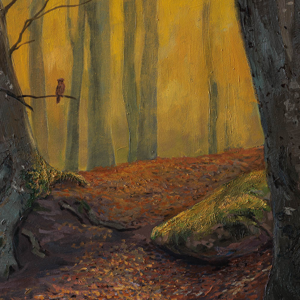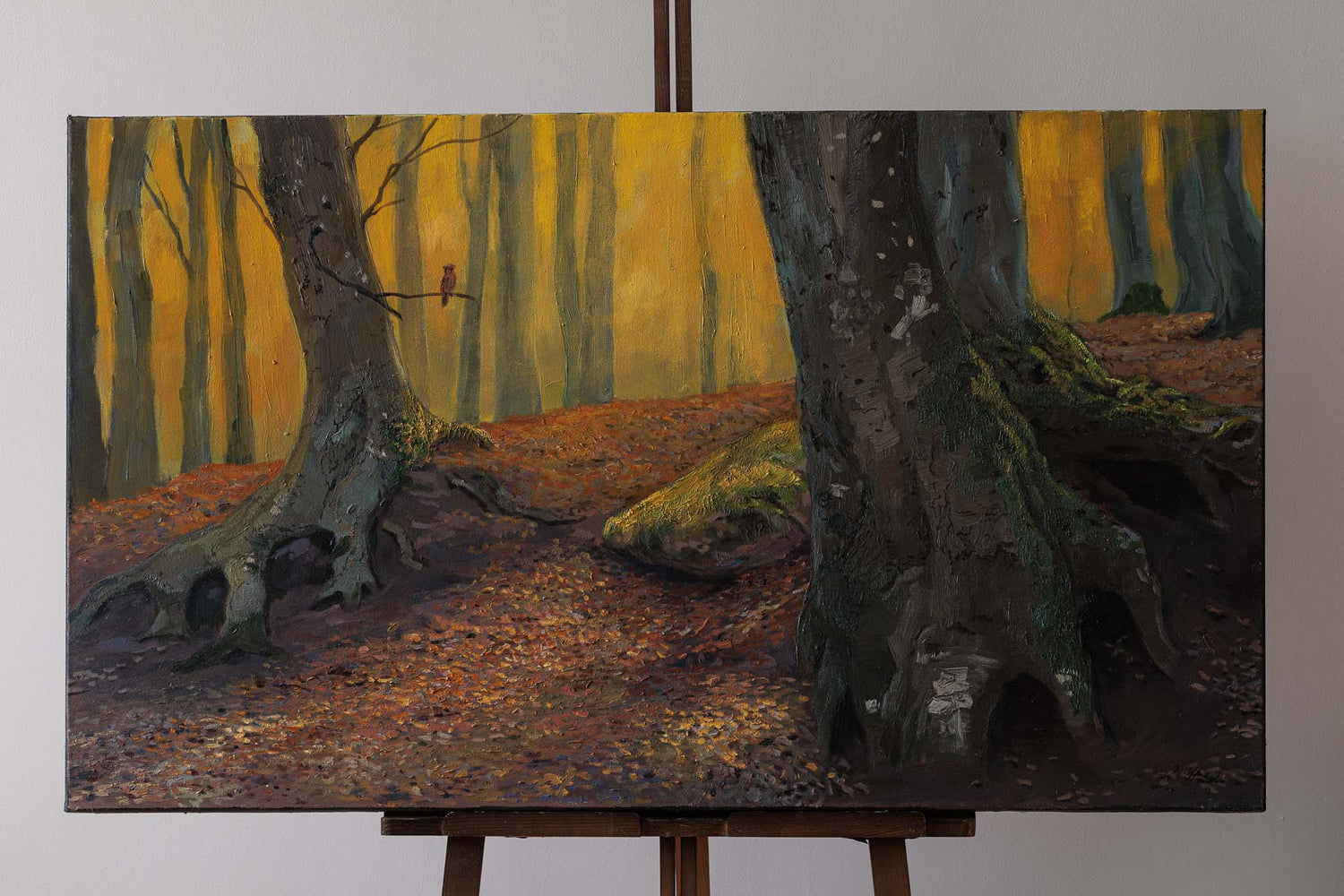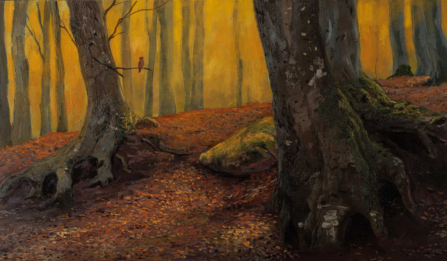 Дълбока тишина обгръща старата букова гора, където дебелите стволове и обагрената в кехлибарова светлина шума създават усещане за неподвижност и време, застинало в есенен покой. Една самотна птица на клона допълва сцената с нотка на живот и съзерцание, превръщайки гората в място на вътрешна тишина и почит към природната мъдрост.
