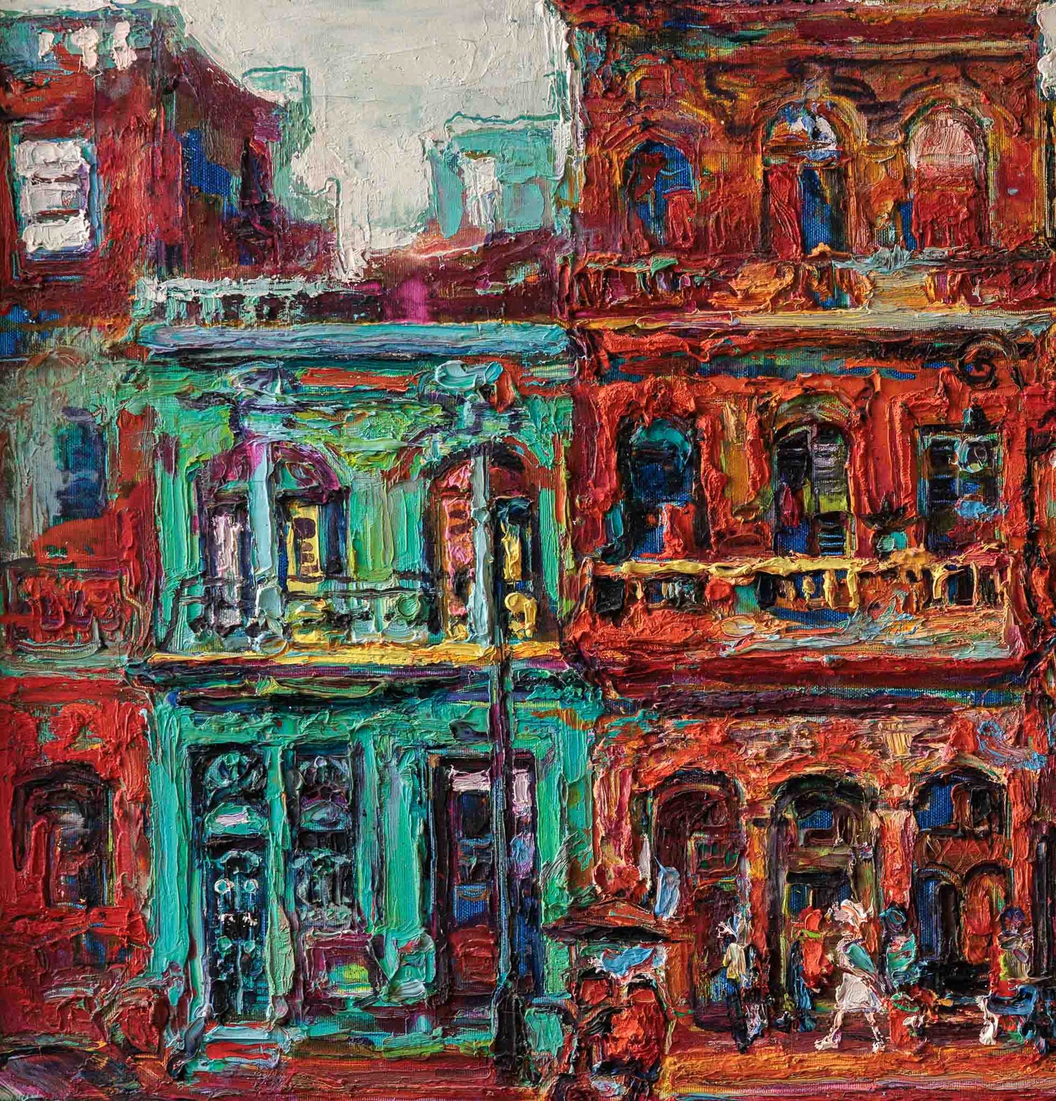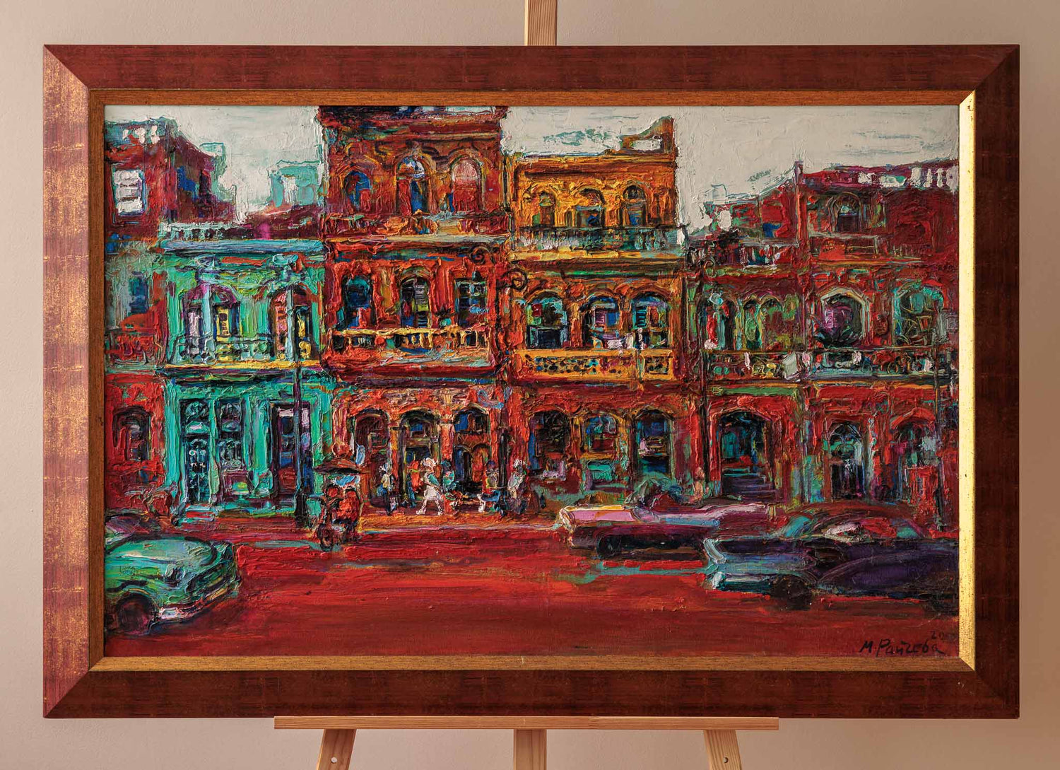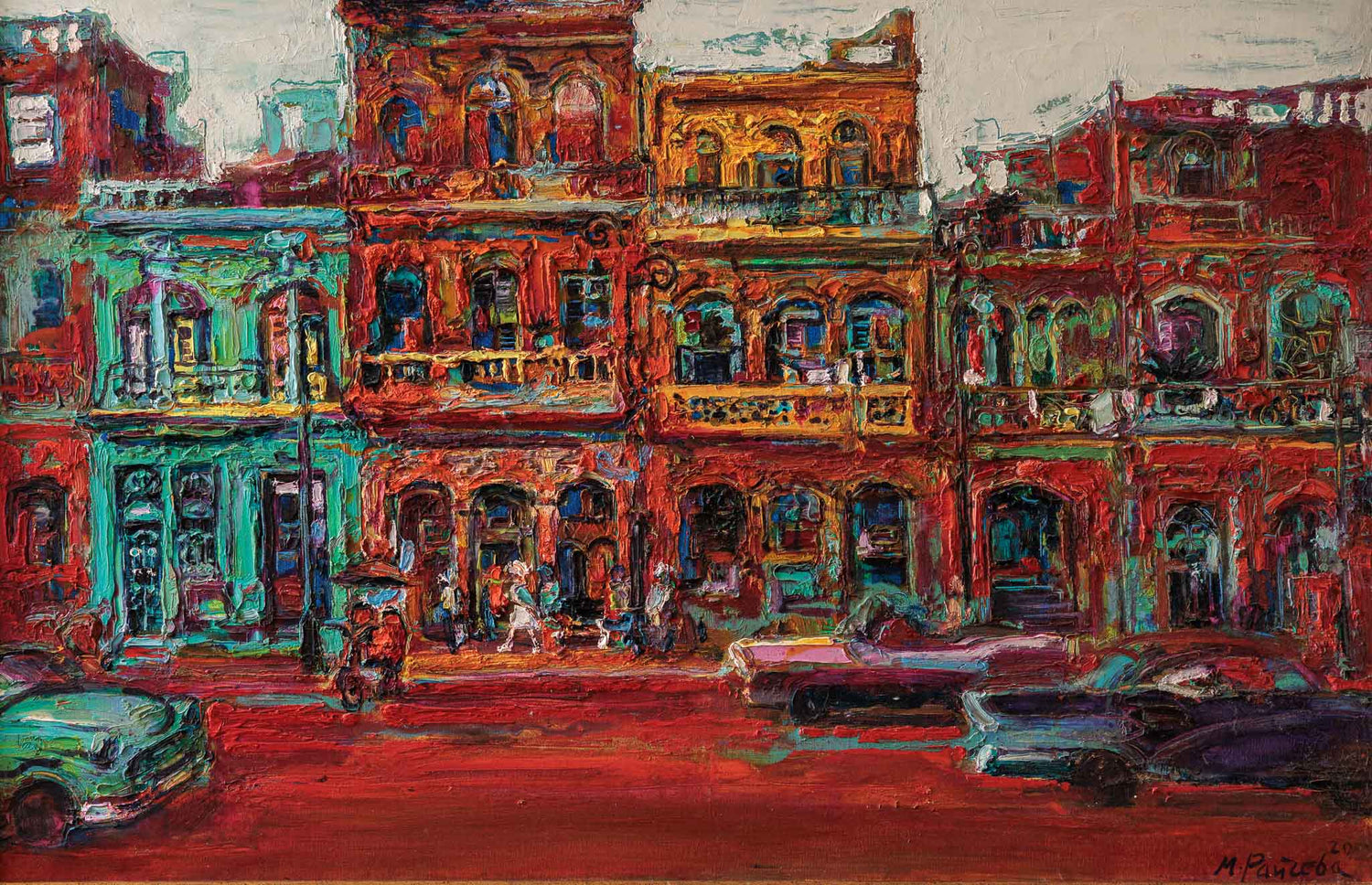 Фасадите по Малеконa се подреждат като плътна цветна мозайка, наситена с червени, тюркоазени и охрени тонове. Дебелият живописен слой и енергичните мазки придават на архитектурата ритъм и живот, а човешките фигури и автомобилите се разтварят в пулса на улицата. Картината носи усещане за топлина, движение и градска памет, уловена в непрекъснато променящ се кадър.
