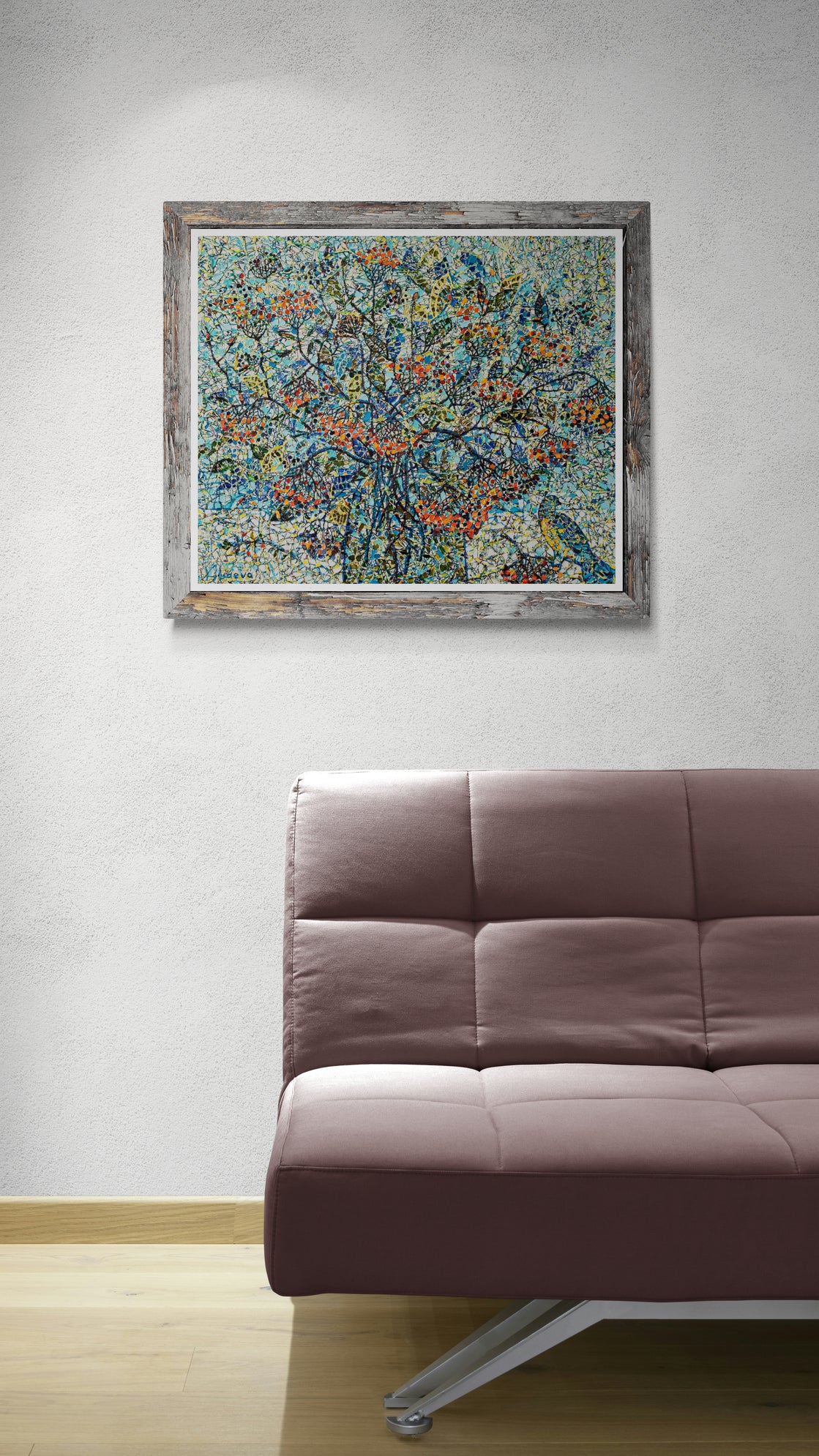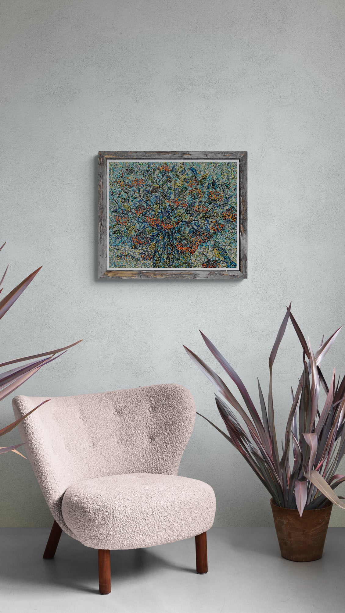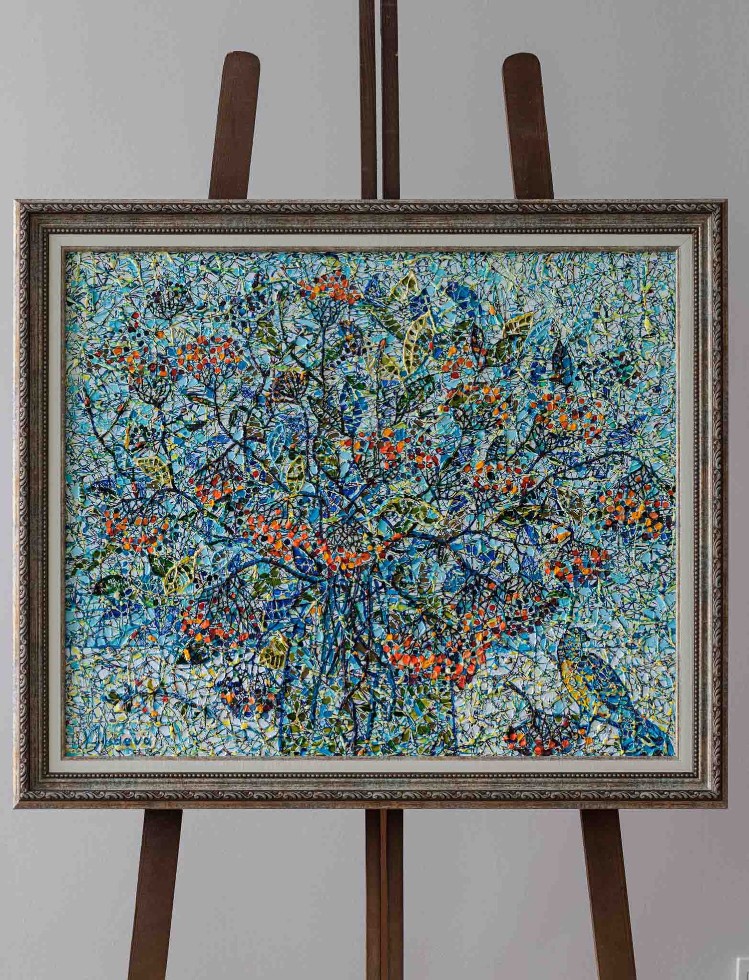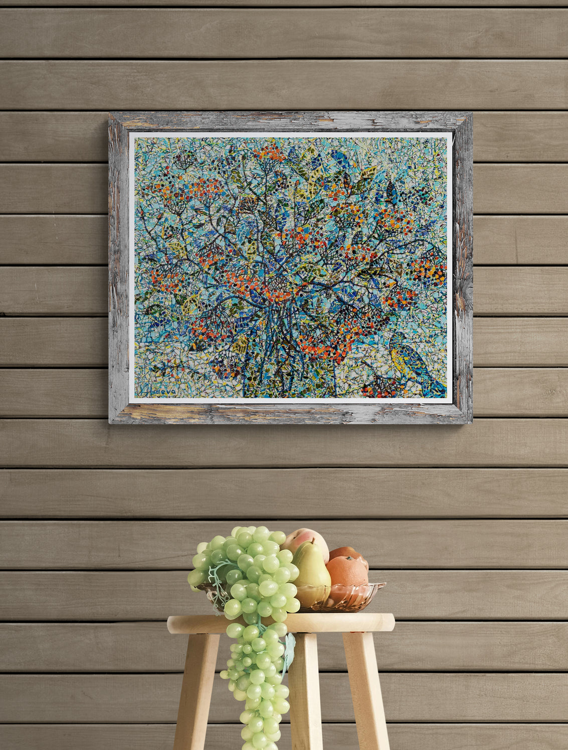 Изключително детайлен и динамичен свят, където клонки, листа и плодове се преплитат в пищен танц от цветове и форми. Наситената синя гама създава усещане за хладен въздух и дълбочина, докато топлите акценти от червено-оранжеви плодове внасят жизненост. Композицията вибрира със спонтанност и енергия – едновременно абстрактна и ботаническа. „Флора“ е картина, която придава характер на всяко пространство и приковава погледа с богатството на текстури и нюанси.