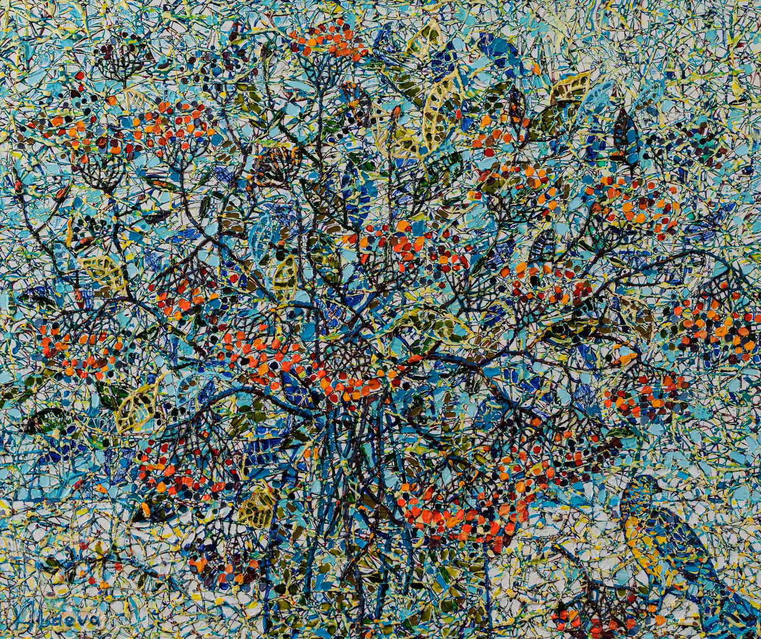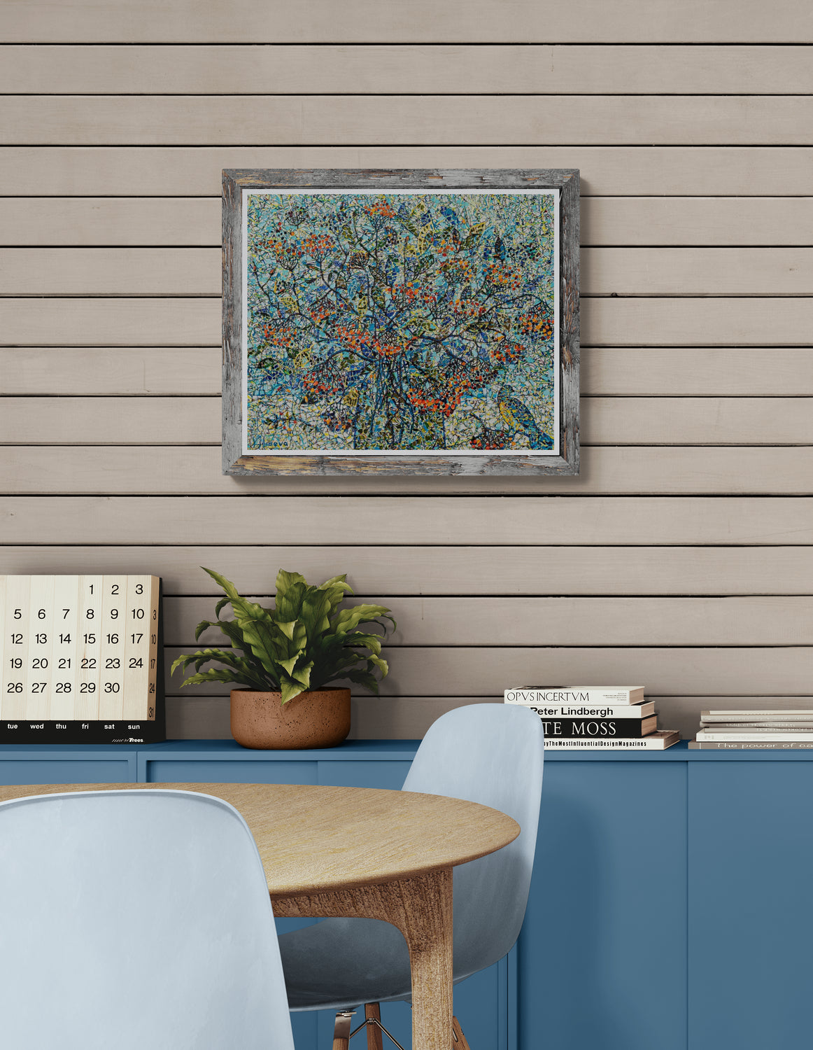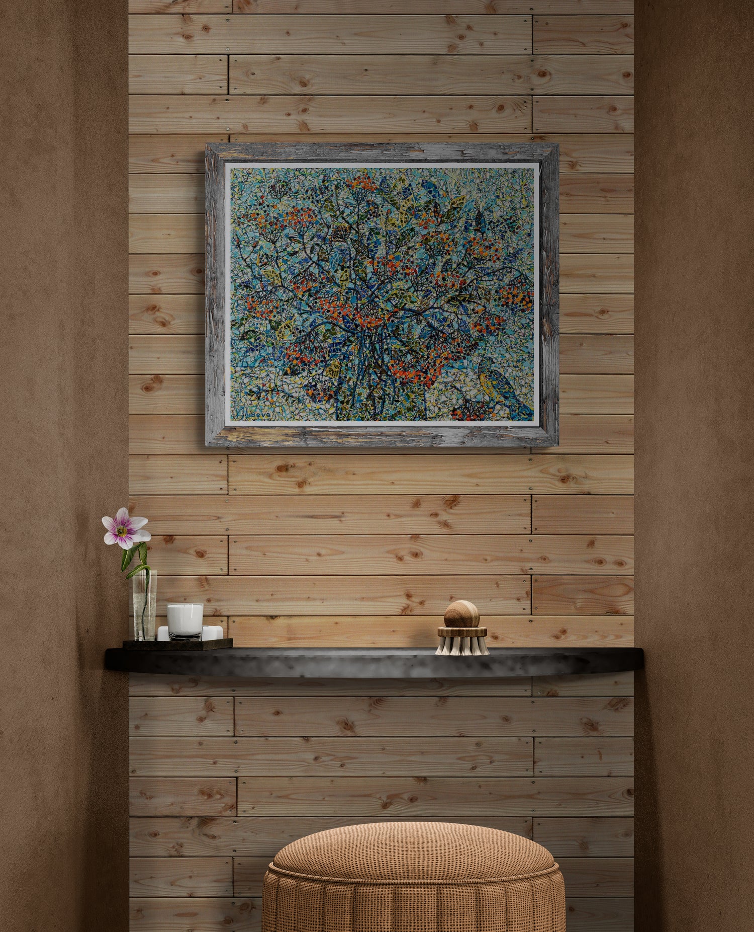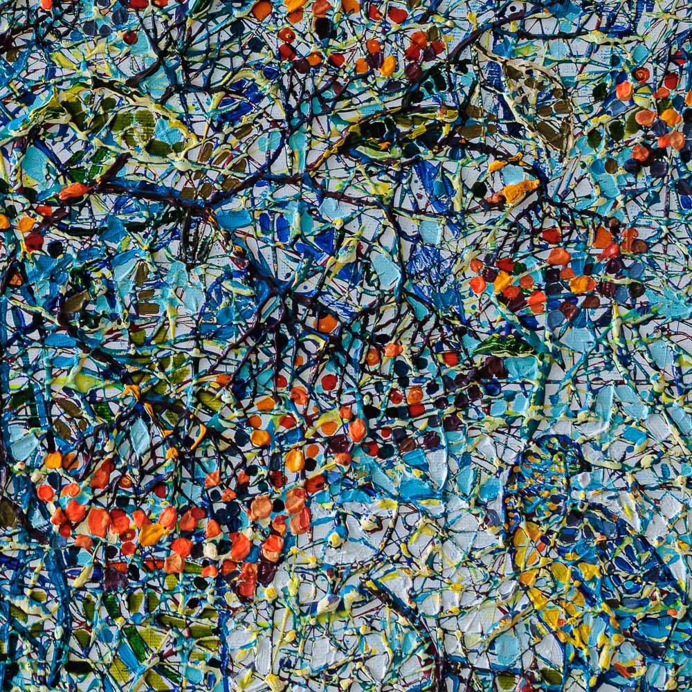 Изключително детайлен и динамичен свят, където клонки, листа и плодове се преплитат в пищен танц от цветове и форми. Наситената синя гама създава усещане за хладен въздух и дълбочина, докато топлите акценти от червено-оранжеви плодове внасят жизненост. Композицията вибрира със спонтанност и енергия – едновременно абстрактна и ботаническа. „Флора“ е картина, която придава характер на всяко пространство и приковава погледа с богатството на текстури и нюанси.
