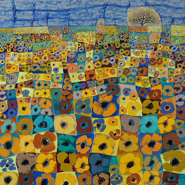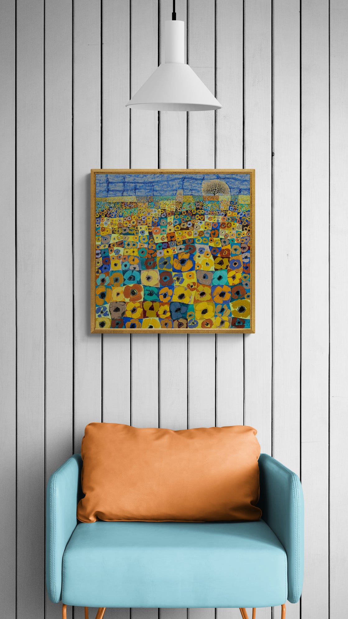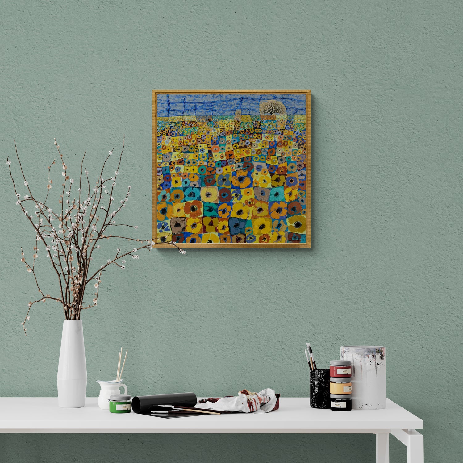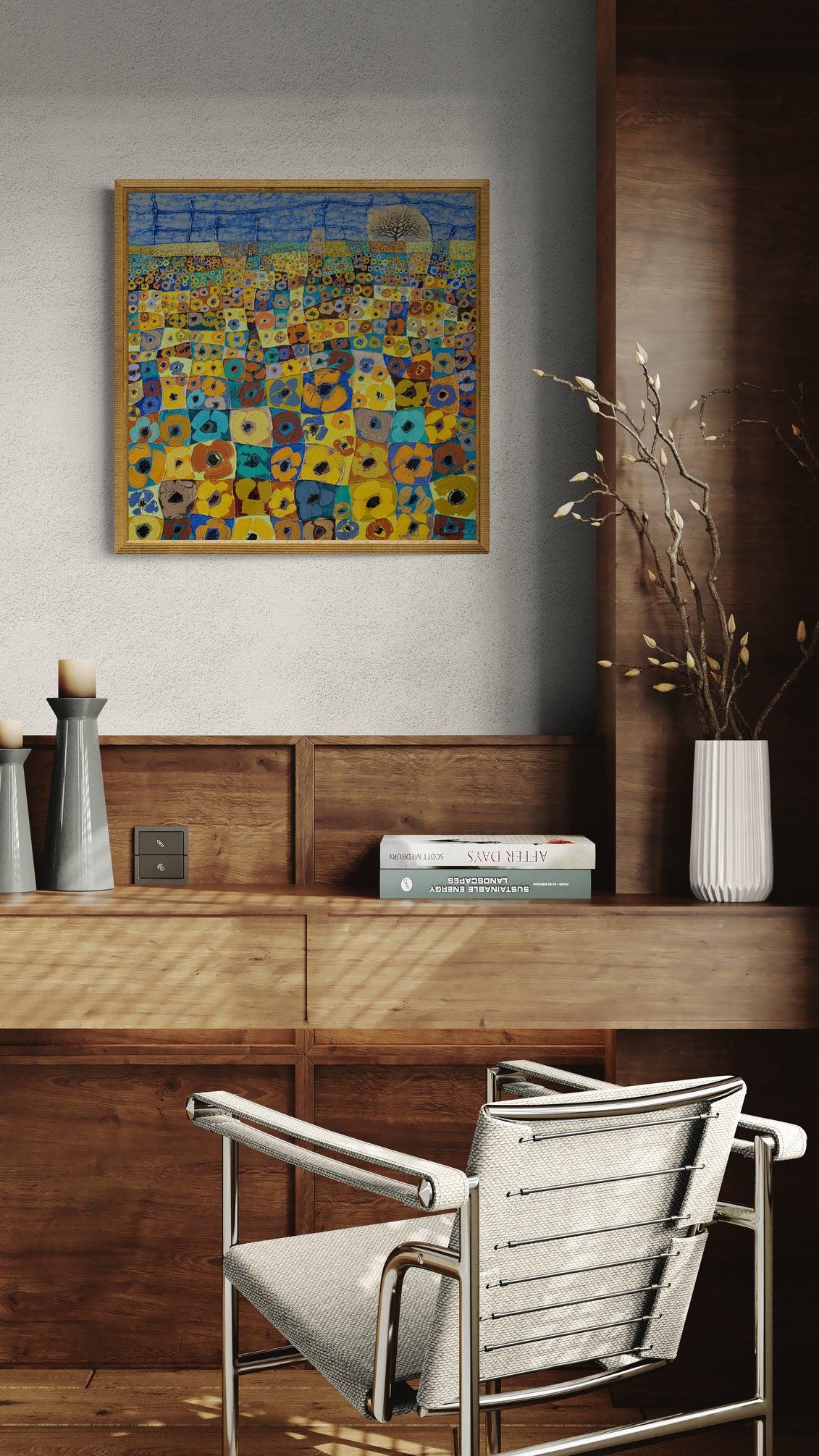 Живописна мозайка от цветове и ритмични форми, в която слънчогледите преливат в оранжево, синьо и златисто под покрова на ярко небе. Композицията улавя пулса на природата чрез повтарящи се елементи и деликатна текстура. Дървото на хоризонта внася усещане за покой и дълбочина – като котва в тази пъстра феерия. Изразителна, съвременна и хармонична, картината носи светлина и ведрост – чудесно решение за интериор с вкус към изкуството.