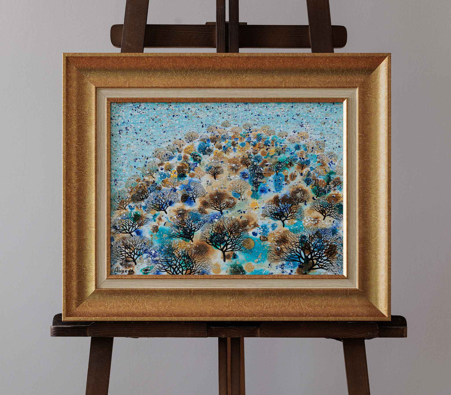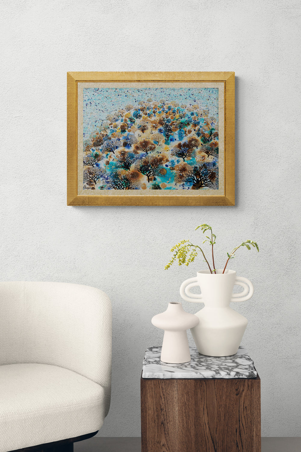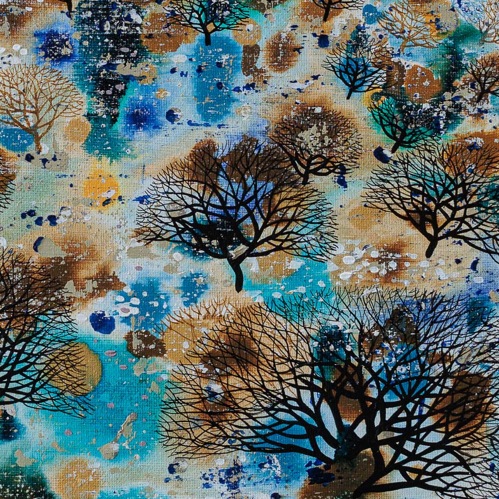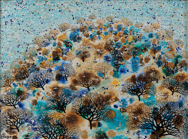 Деликатна и ефирна картина, която улавя тишината и магията на първия сняг. В композицията се преплитат топли земни тонове и свежи сини акценти, а стилизираните дървета създават усещане за ритъм и дълбочина. Абстрактната техника на Наталия Абаева придава мечтателен характер на зимния пейзаж – чудесен избор за почитателите на поетичната атмосфера в съвременното изкуство.