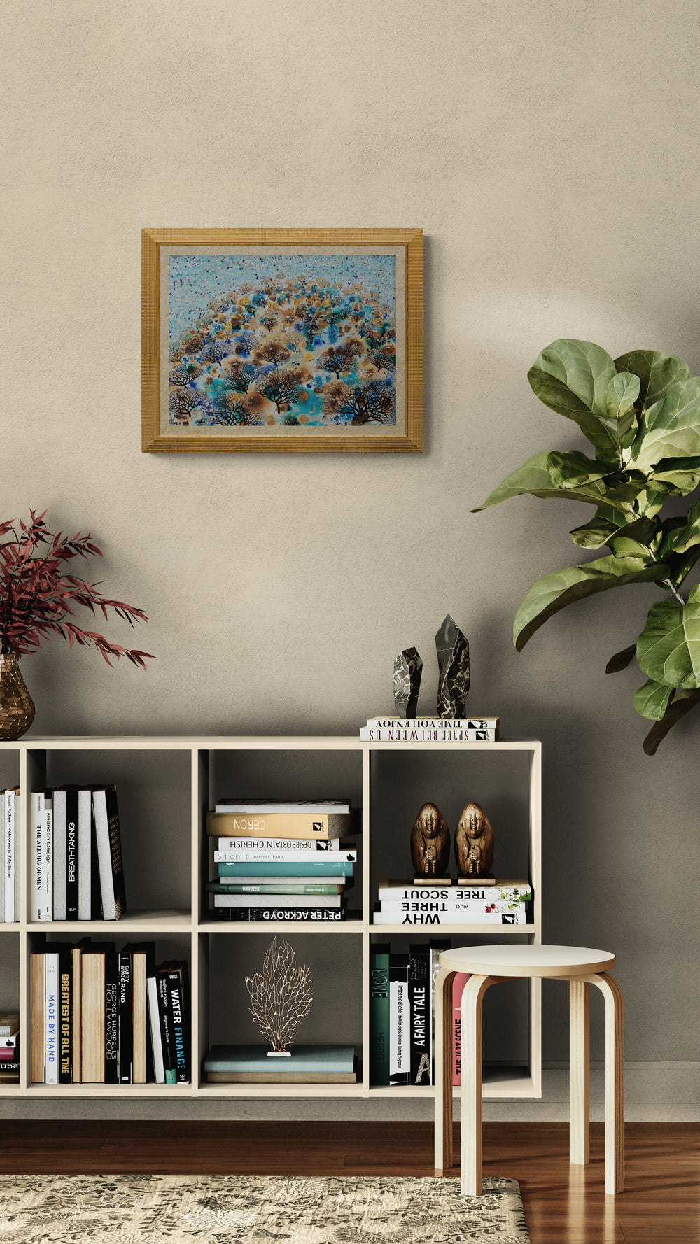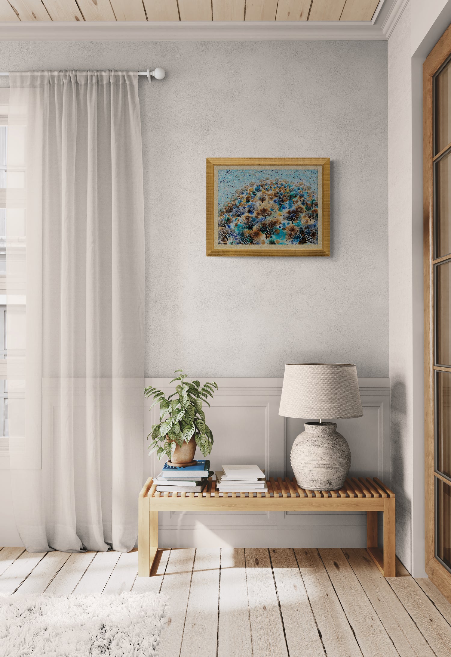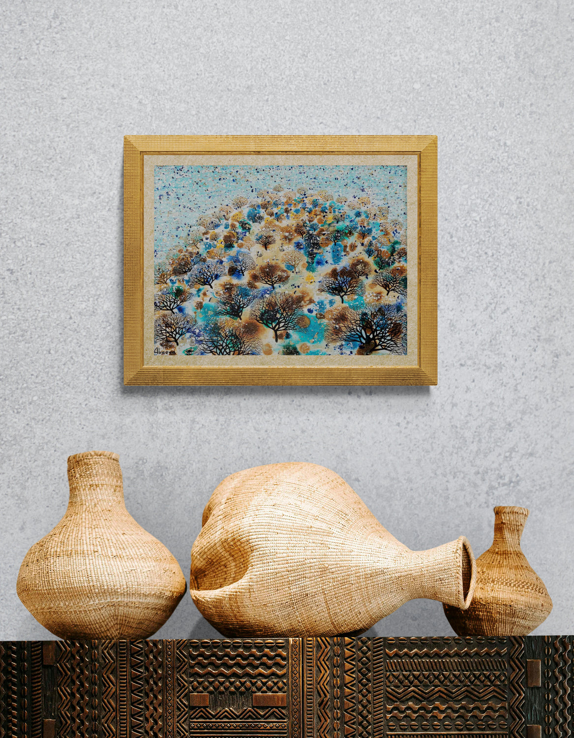 Деликатна и ефирна картина, която улавя тишината и магията на първия сняг. В композицията се преплитат топли земни тонове и свежи сини акценти, а стилизираните дървета създават усещане за ритъм и дълбочина. Абстрактната техника на Наталия Абаева придава мечтателен характер на зимния пейзаж – чудесен избор за почитателите на поетичната атмосфера в съвременното изкуство.