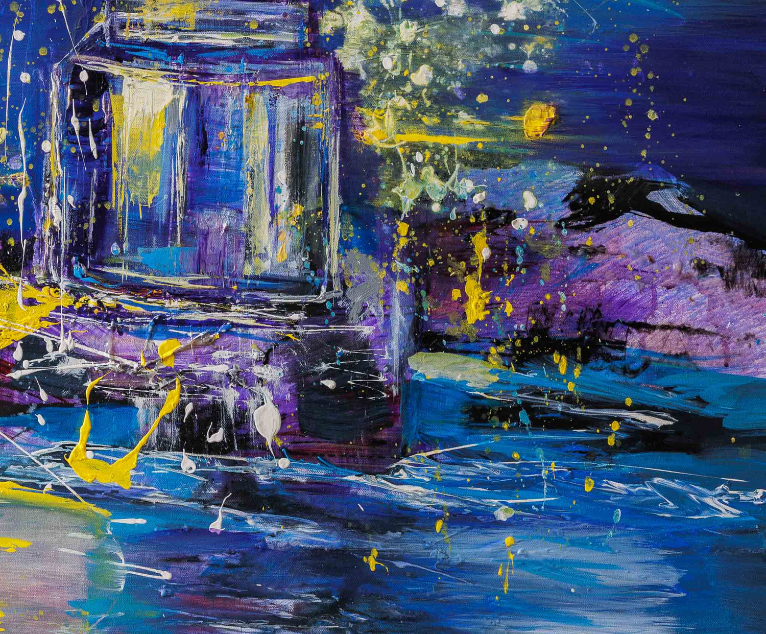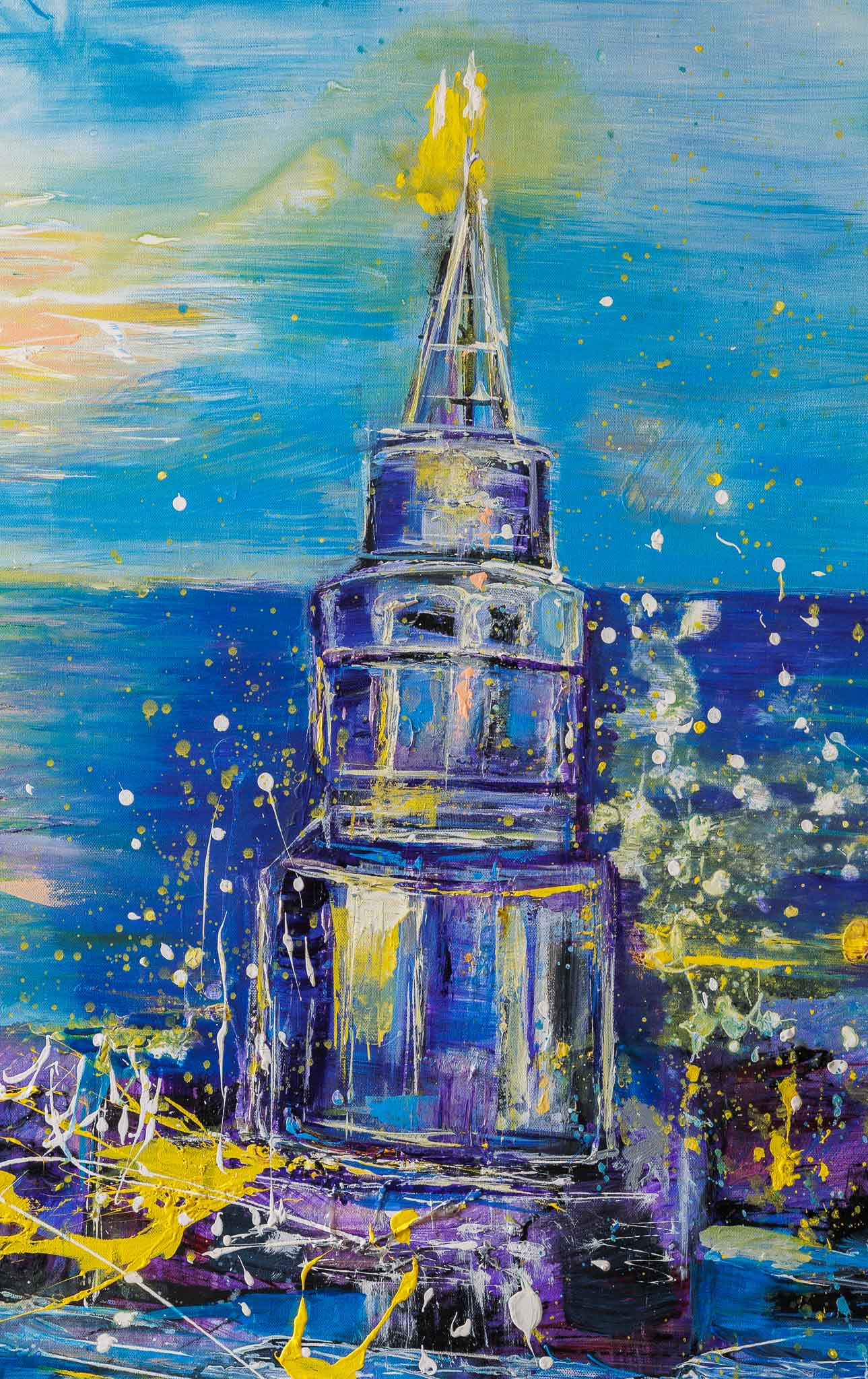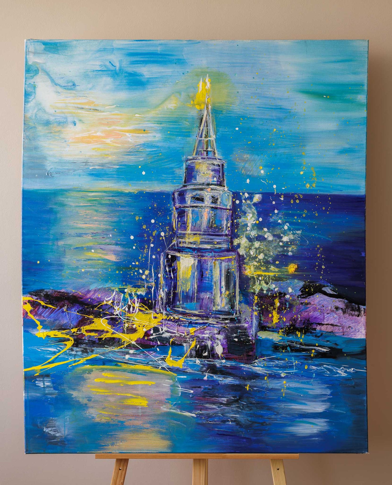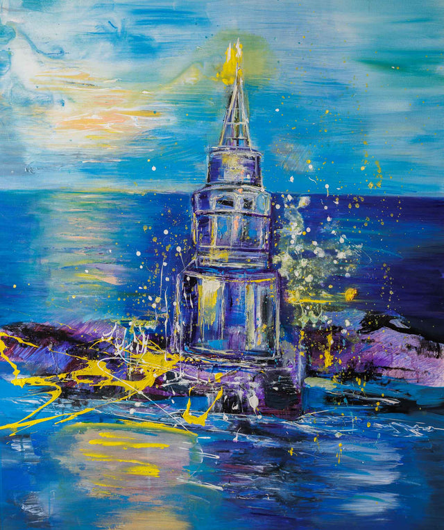 Ярка и динамична морска композиция, в която фарът се извисява като символ на надеждата и ориентацията. Сини и тюркоазени нюанси пресъздават дълбочината на морето, а златистите акценти от светлината носят топлина и увереност. Свободните мазки и цветните пръски създават усещане за движение и енергия, напомняйки, че винаги има светлина, която показва пътя.