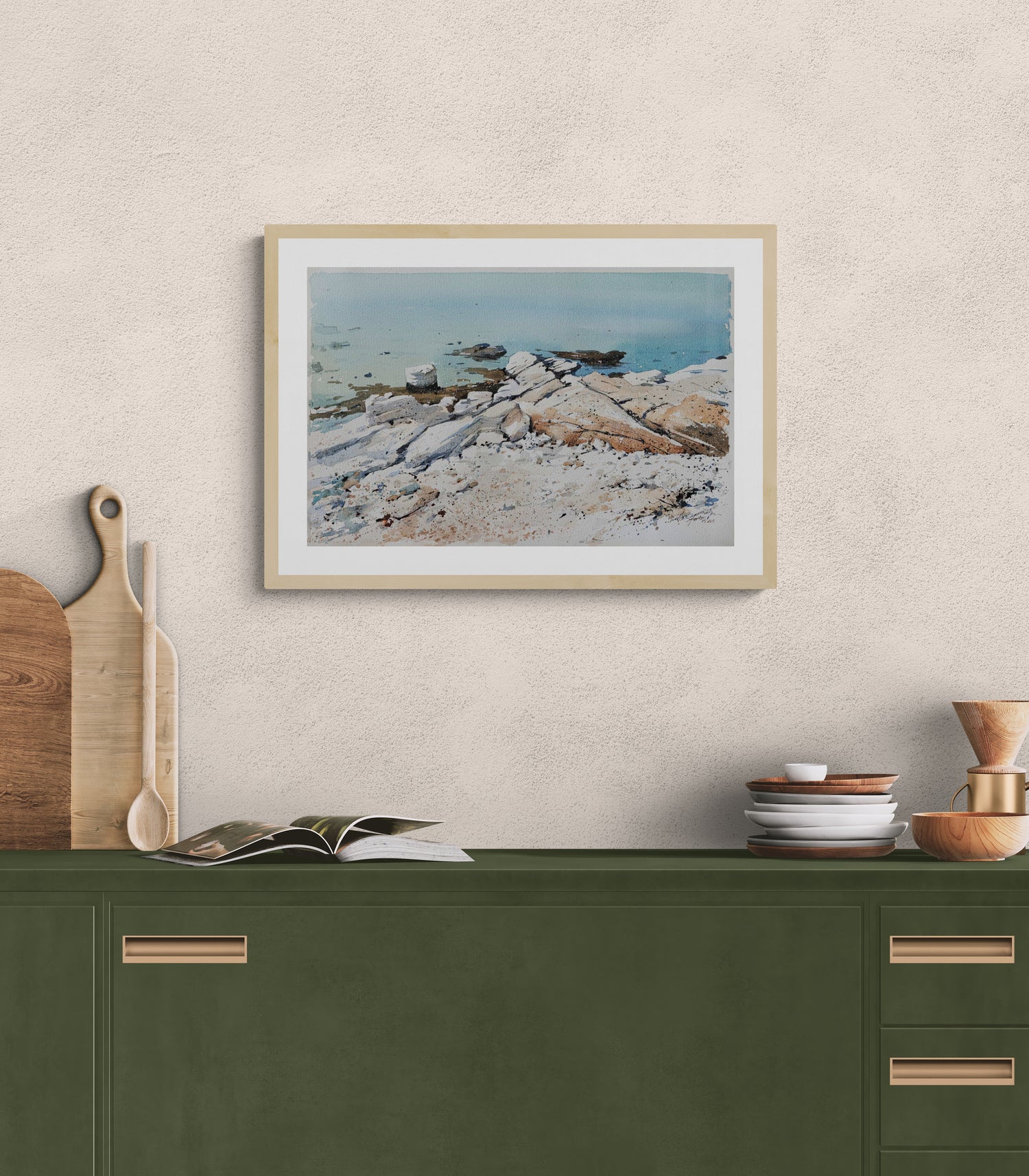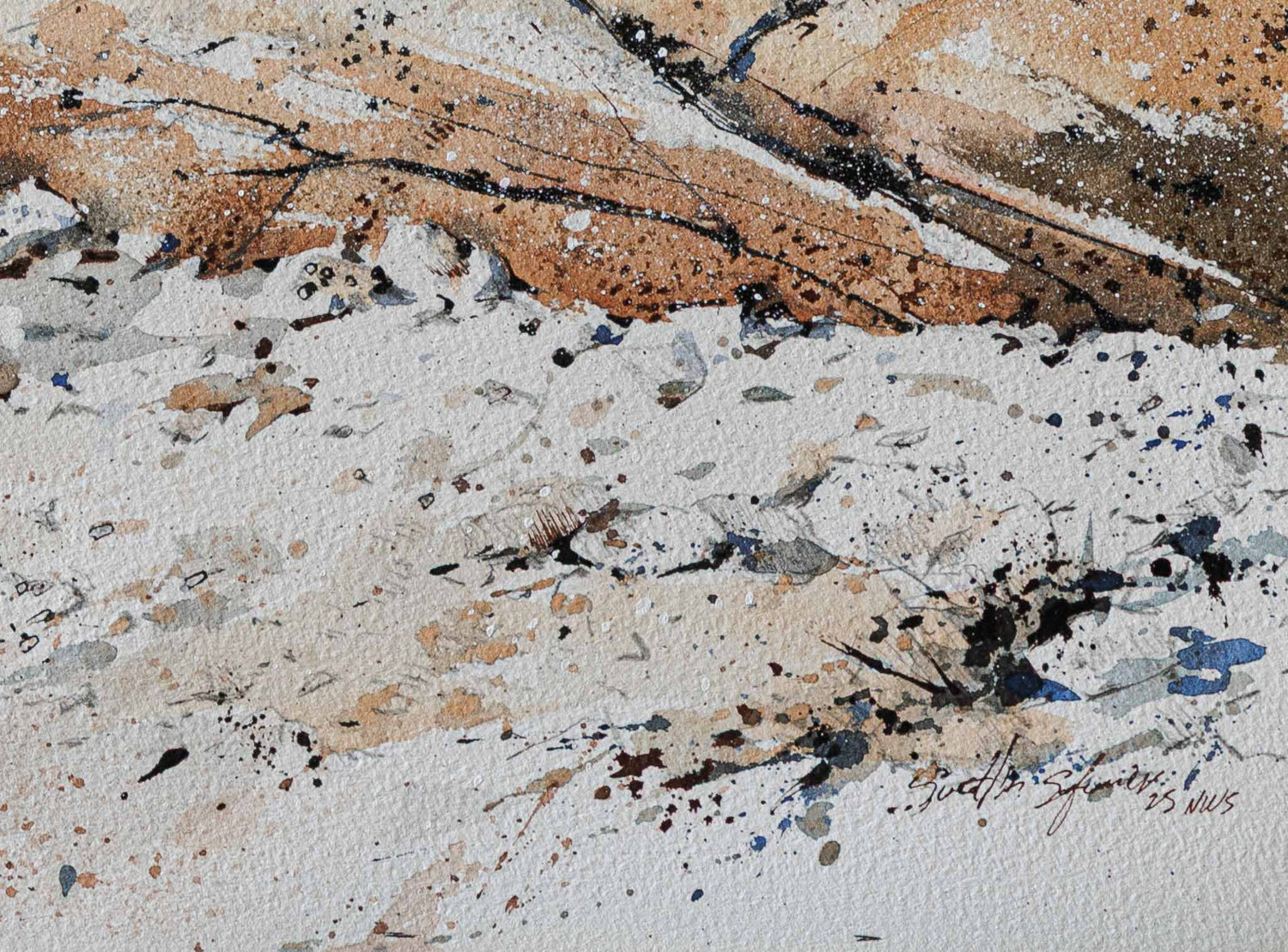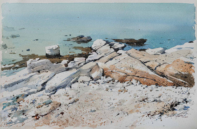 Слънчева скална ивица, застинала в тишина пред необятното море. Светлината разлива цвят по камъните, а пръските от четката подсилват усещането за живо, променливо пространство. Място, където брегът не е просто граница – а състояние на покой и наблюдение.