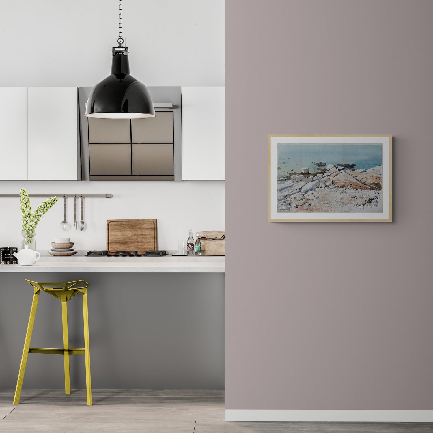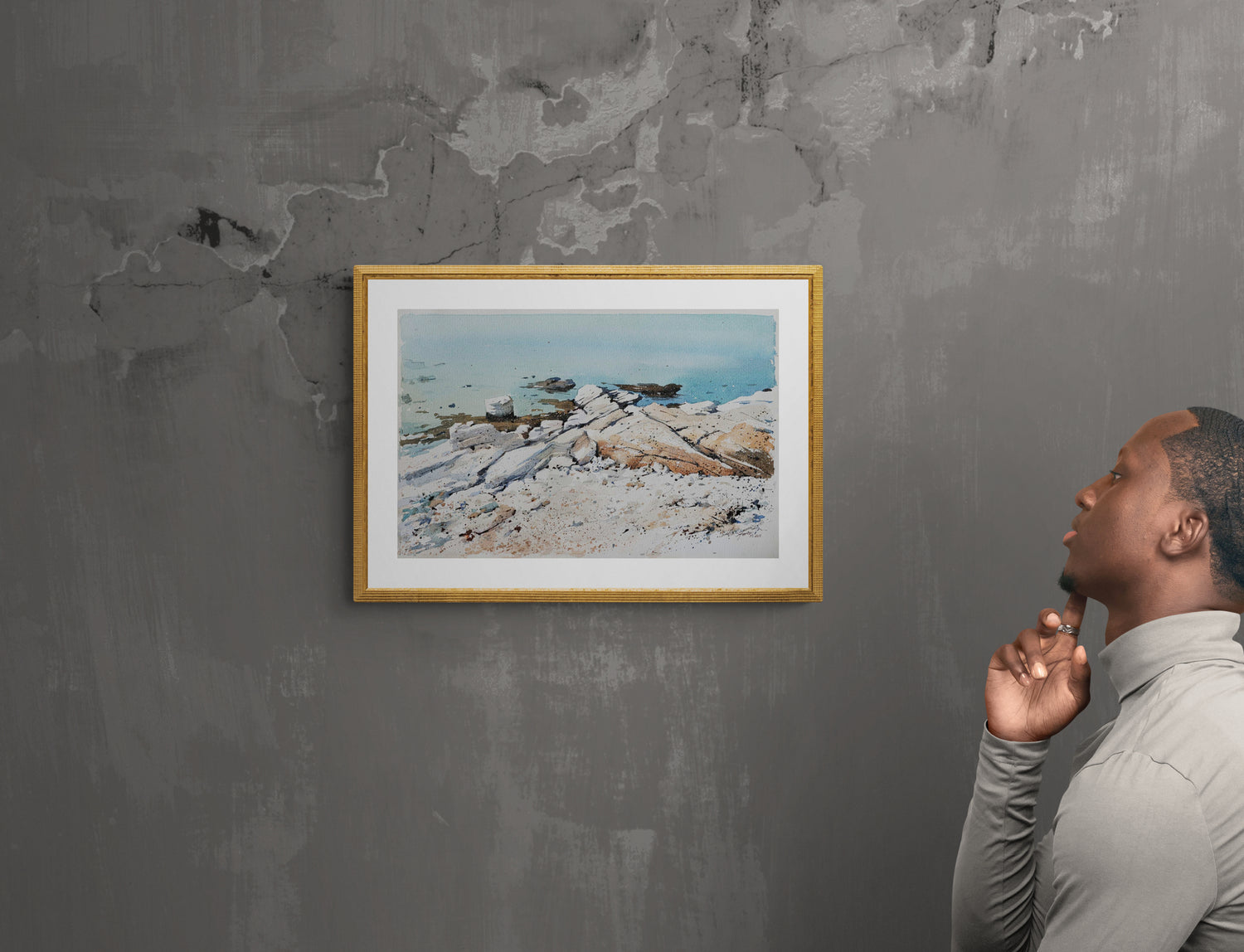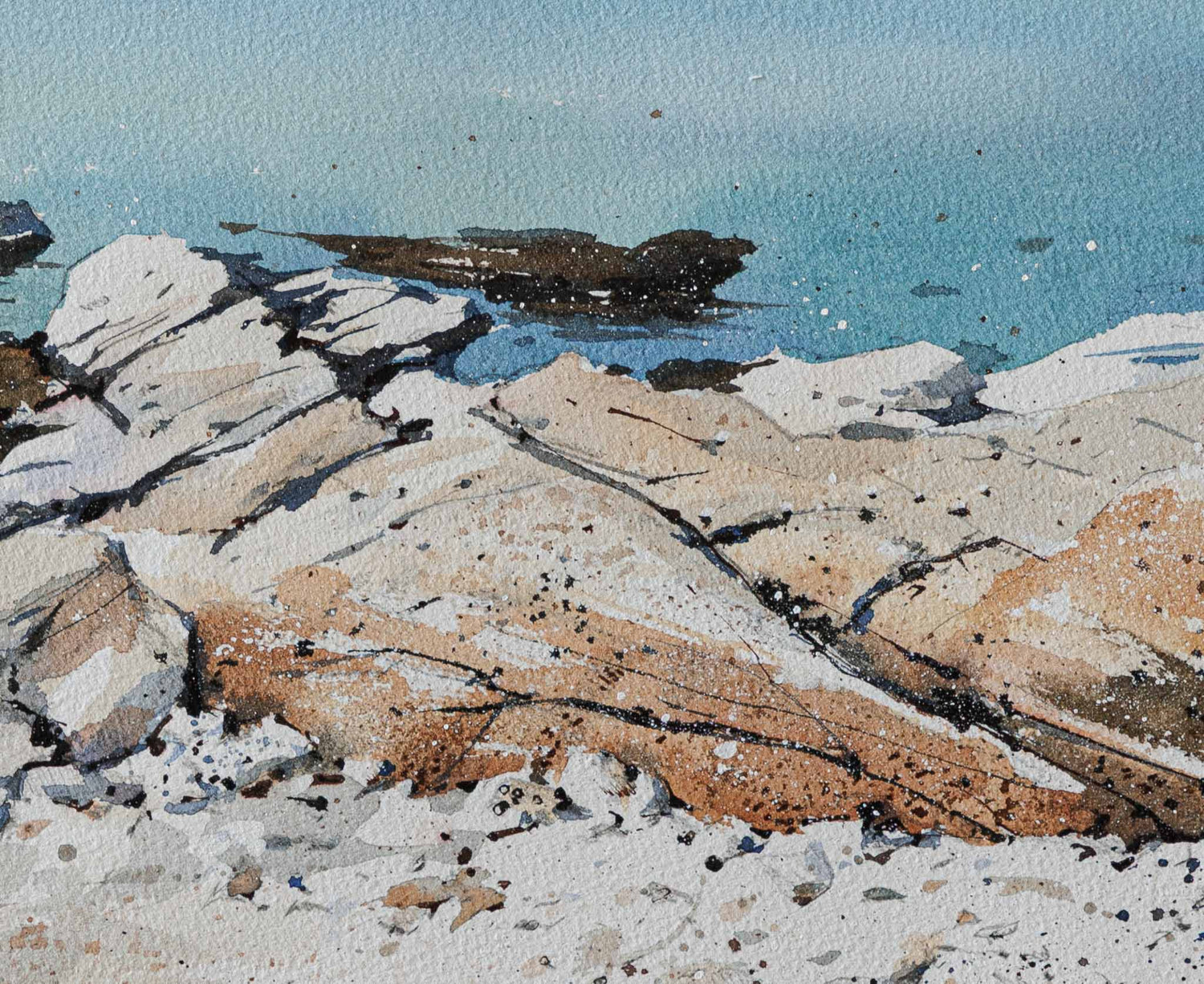 Слънчева скална ивица, застинала в тишина пред необятното море. Светлината разлива цвят по камъните, а пръските от четката подсилват усещането за живо, променливо пространство. Място, където брегът не е просто граница – а състояние на покой и наблюдение.