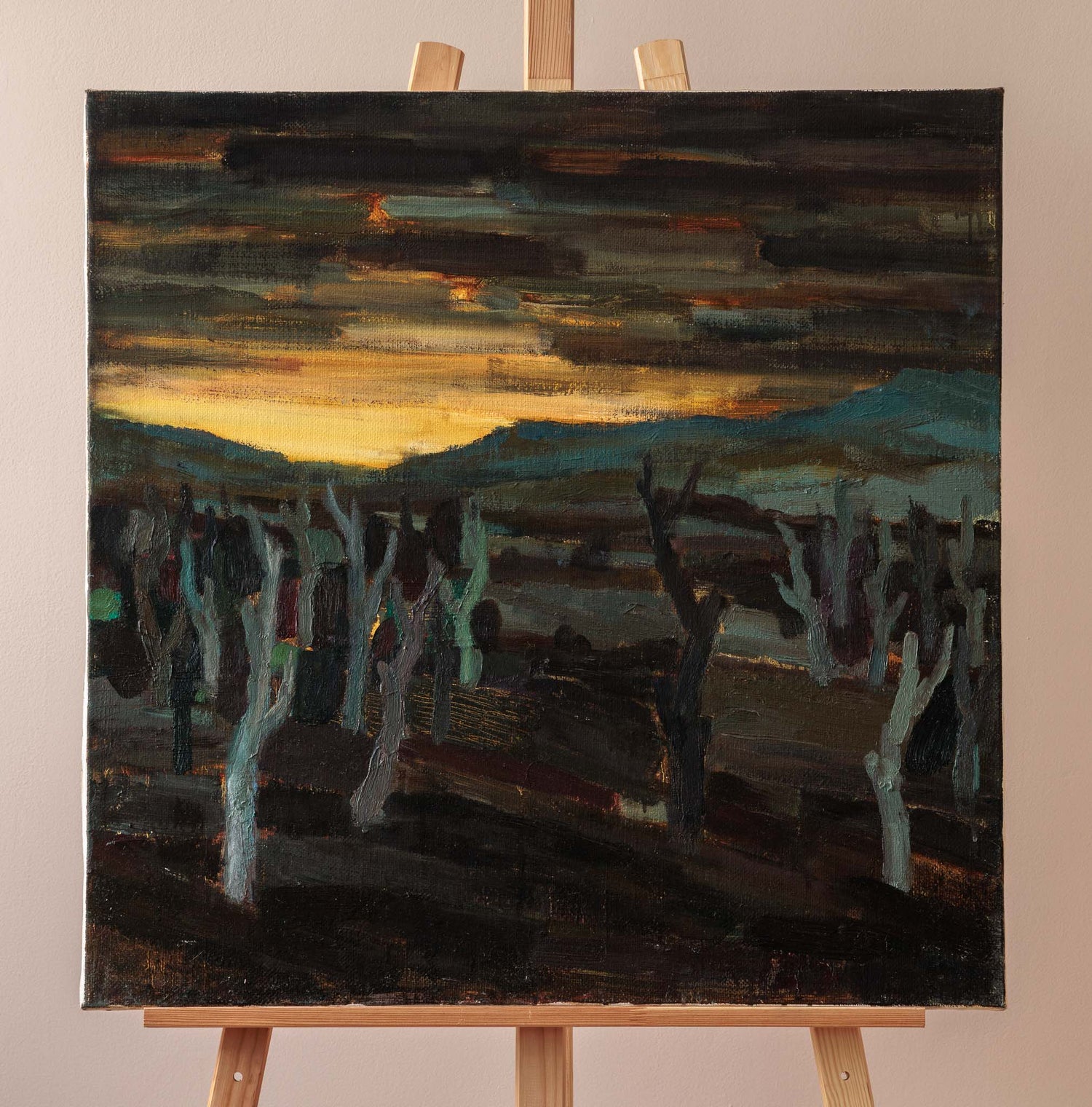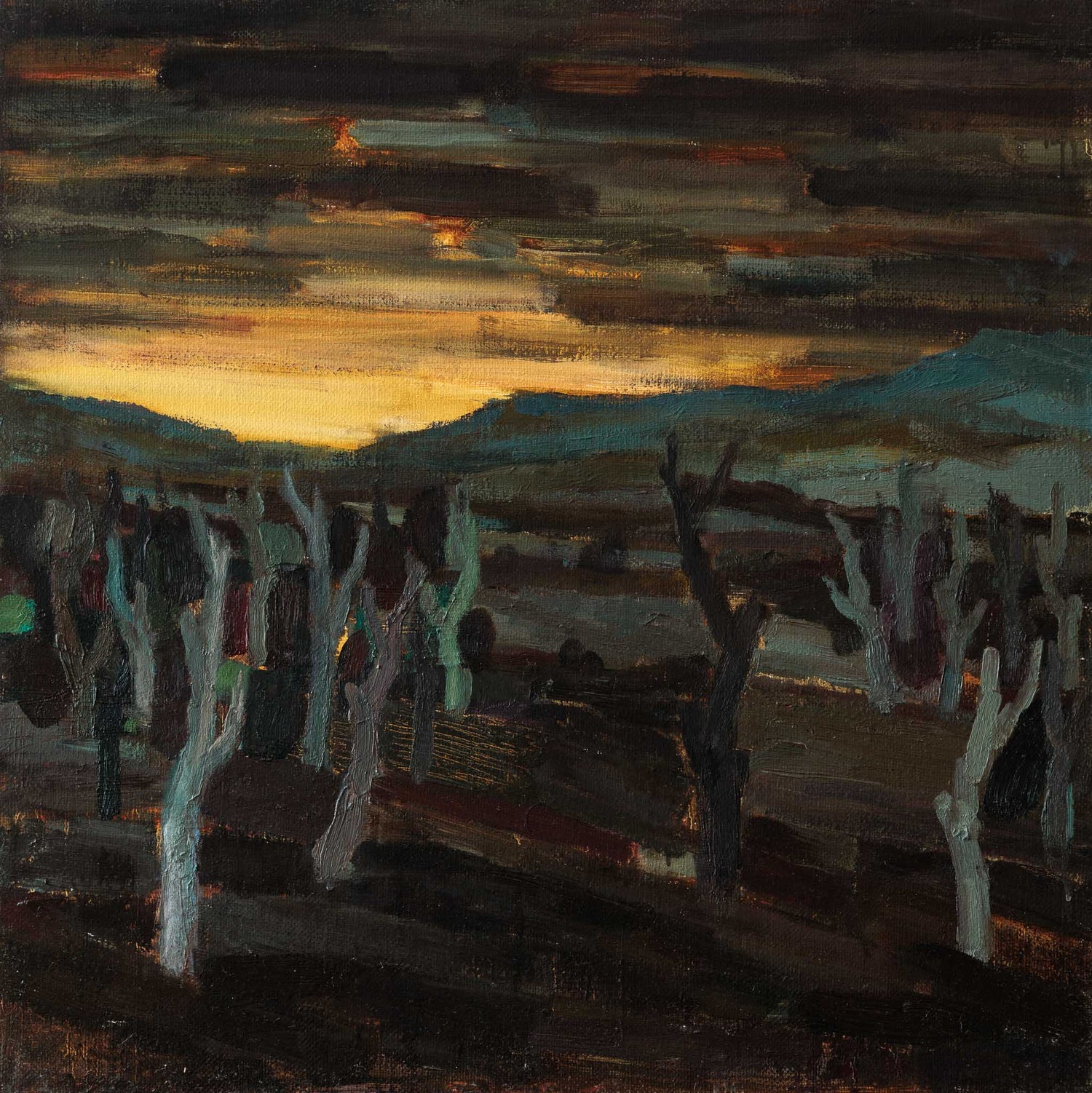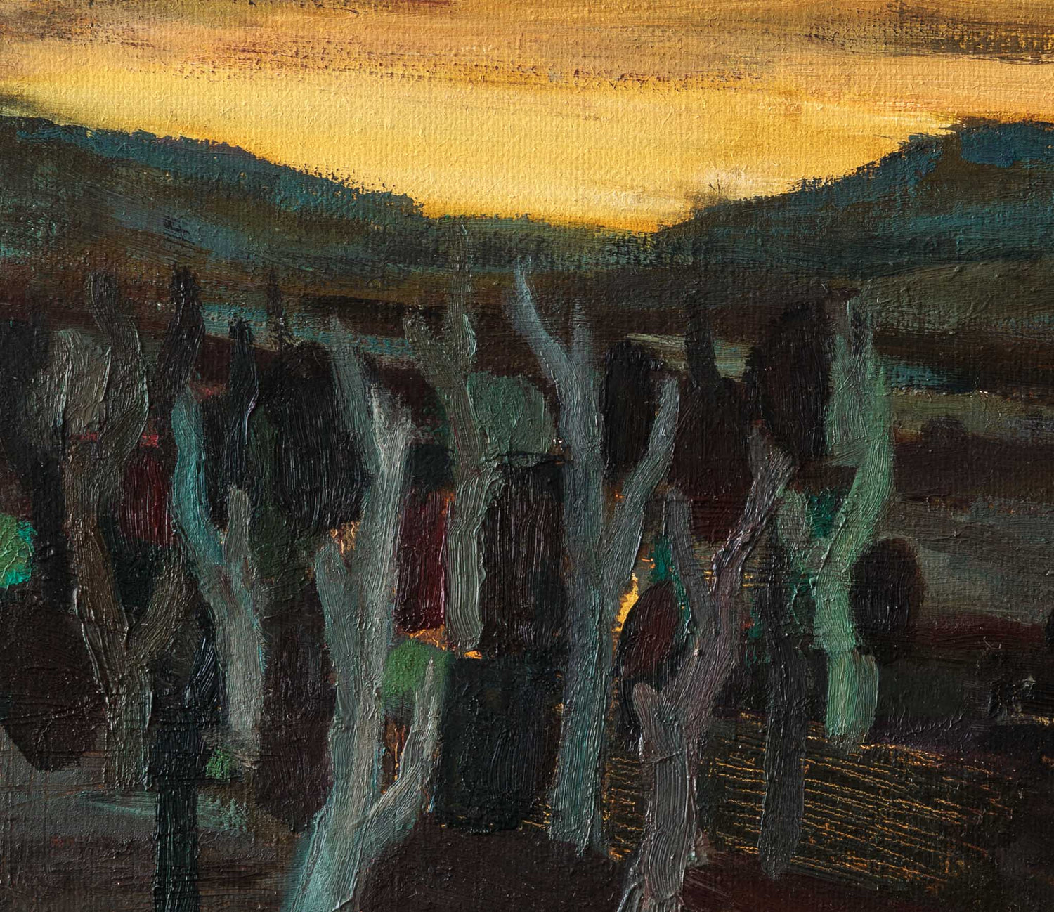 „Край пътя“ улавя момента на притихване в края на деня. Оголените дървета се открояват като силуети на фона на залязващата светлина, а пейзажът носи усещане за преход, тишина и дълбочина, в която времето сякаш се забавя.
