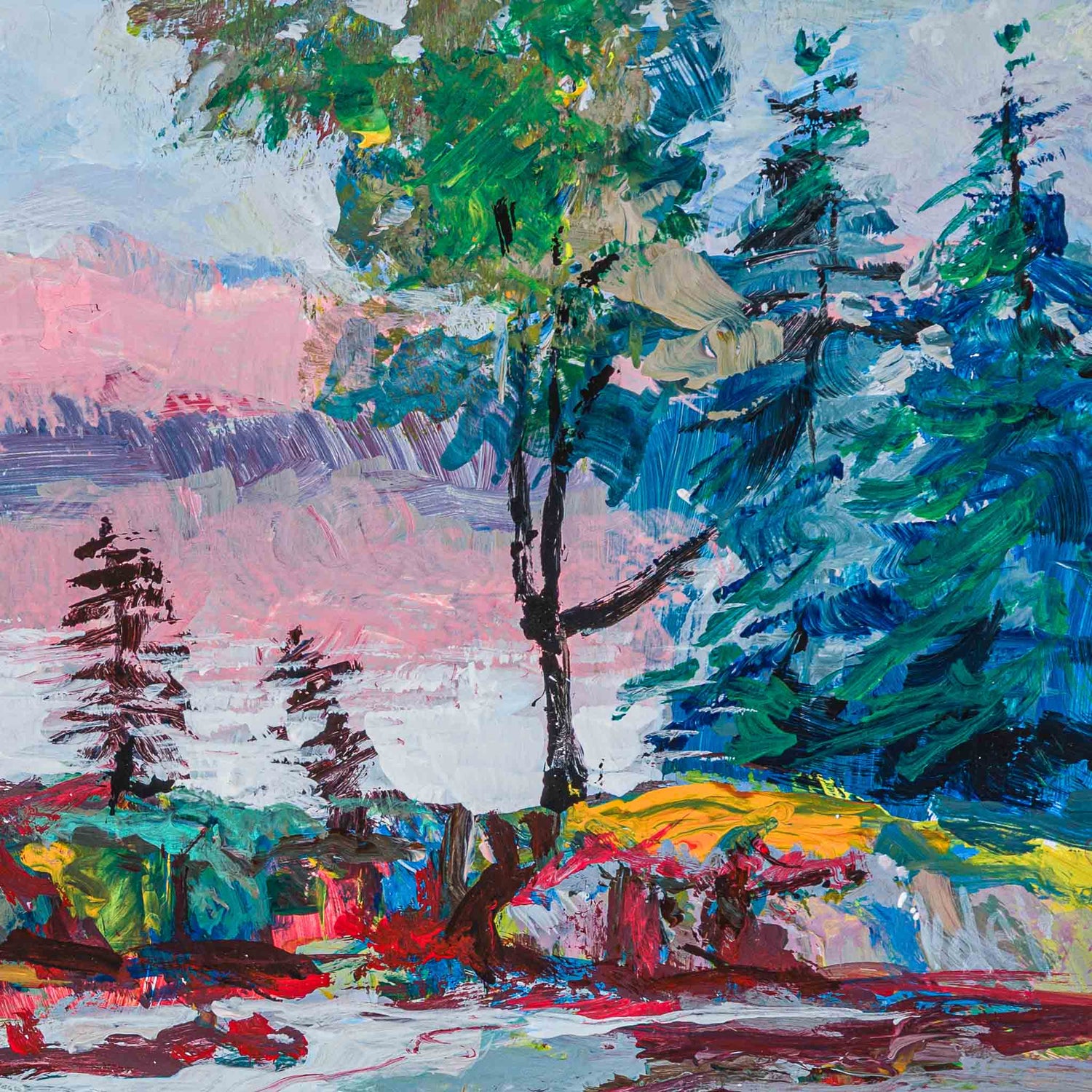 Розовите планини в далечината придават усещане за нереалност, а живописната енергия на мазката превръща природата в емоционално преживяване.
