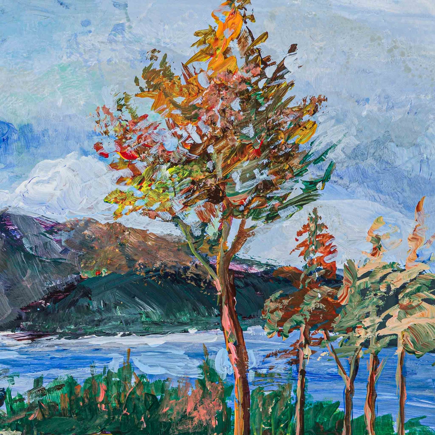 В тази творба Васко Делев улавя миг на движение и покой — дърветата се полюшват от вятъра, а водата и планините се разтварят в прозрачна светлина.