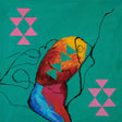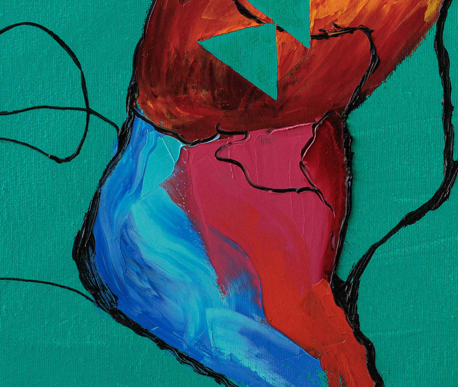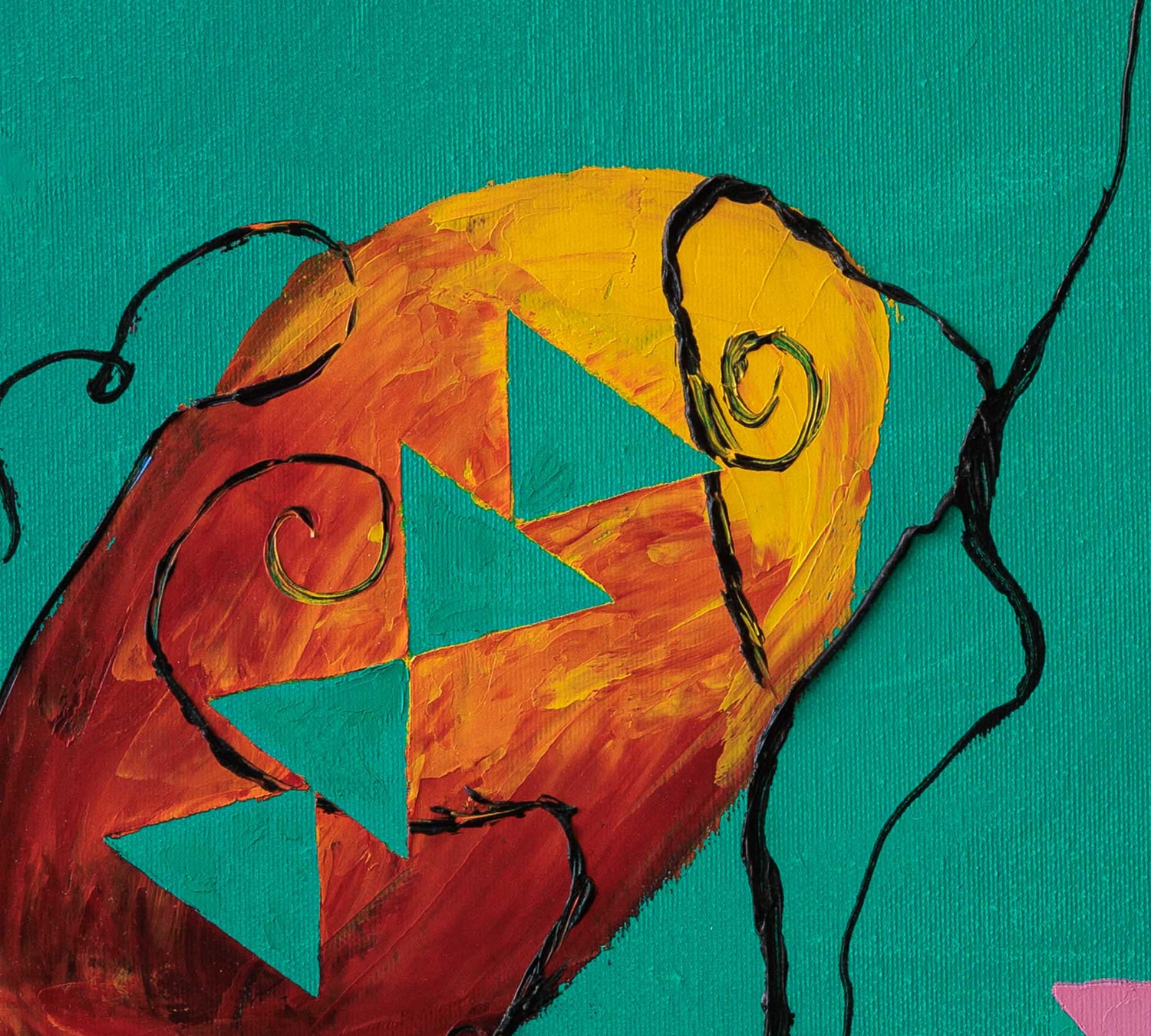 Композиция от органична форма и геометрични знаци, в която цветът и линията се преплитат в свободен, почти игрови ритъм. Контрастът между меките очертания и строгите триъгълници създава усещане за движение и вътрешно напрежение.