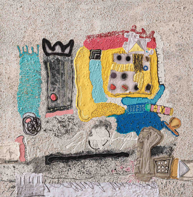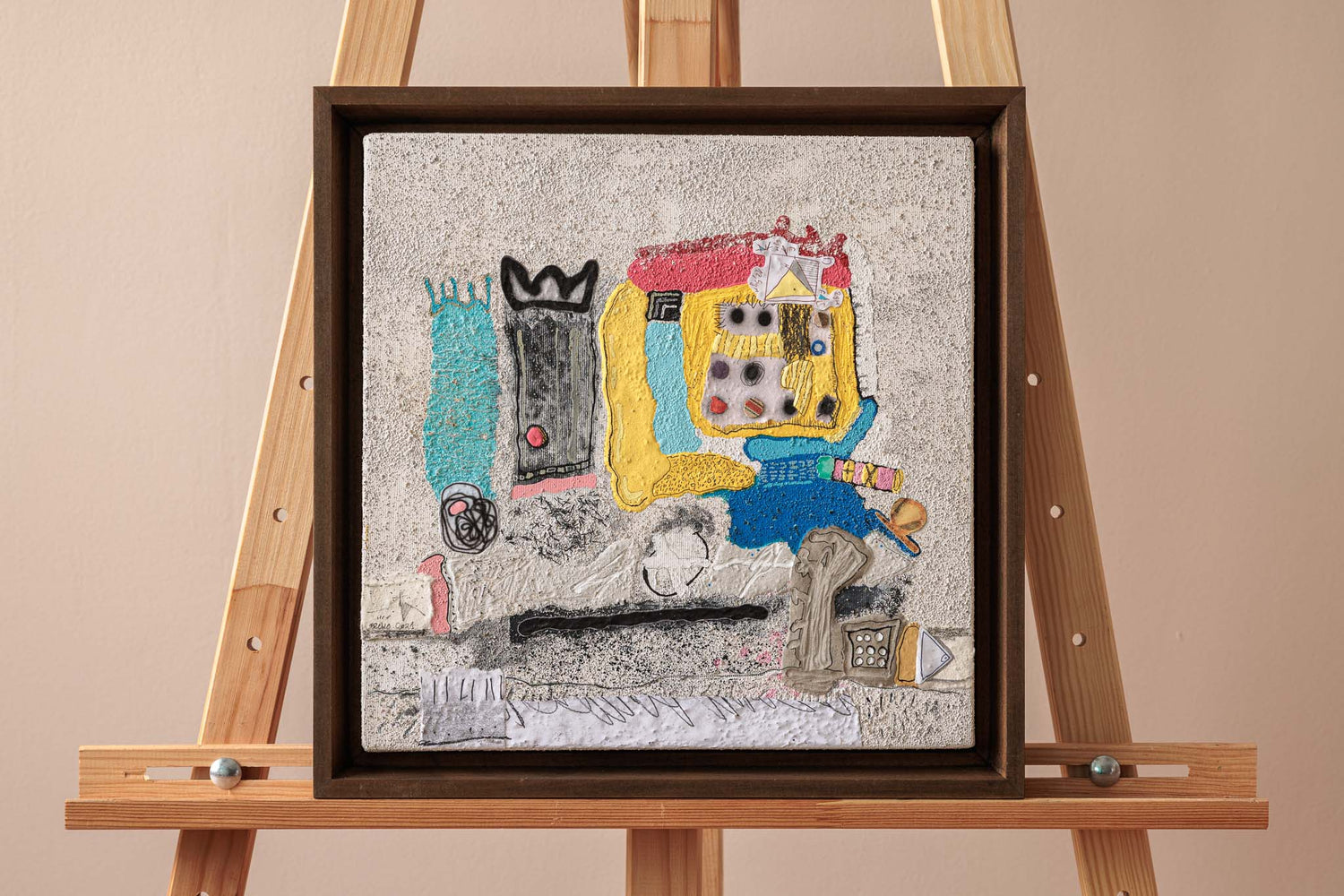„Малко кралство“ изгражда свой собствен свят от форми, знаци и текстури. Фигурите напомнят детска рисунка – с корона, символи и загадъчни предмети, подредени като сцена от въображаем разказ. Цветовете са ярки и контрастни, а релефната повърхност придава усещане за игра и експеримент. Картина за личната територия на фантазията, където правилата се създават наново.