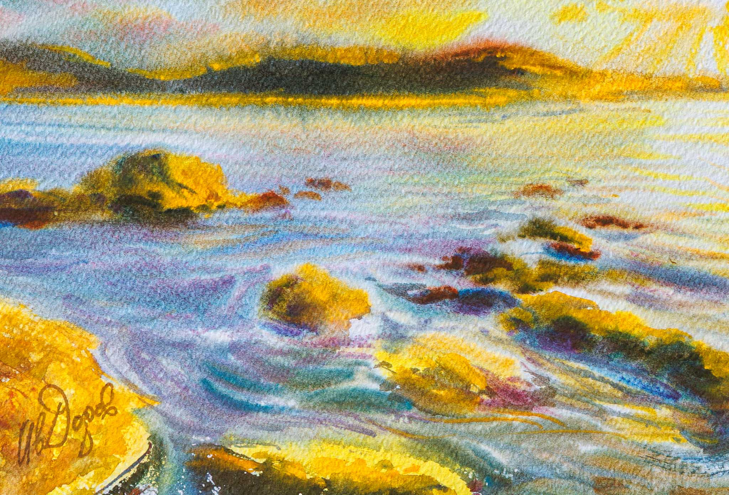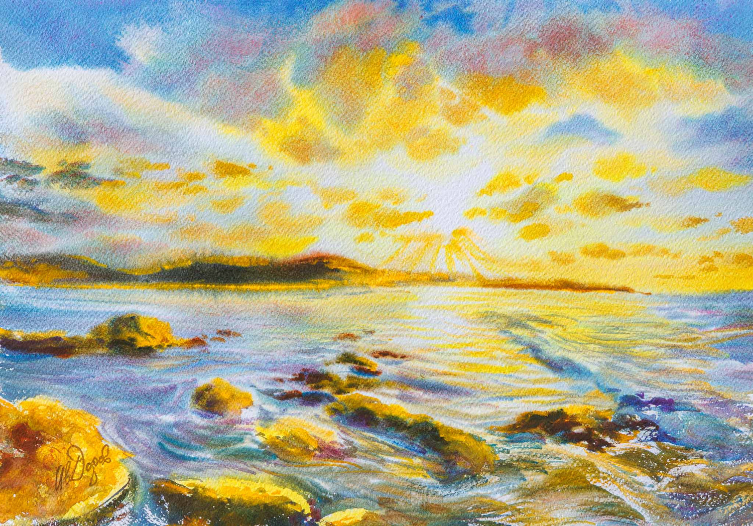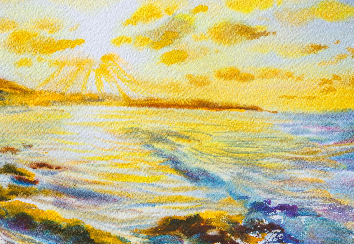 В тази картина Иван Додов улавя един от онези кратки, магични моменти, в които нощта отстъпва пред деня. „Черноморски изгрев“ е пейзаж, в който светлината се разлива като злато върху вълните и камъните по брега. Меките преходи на акварела придават на морето дълбочина и движение, докато слънцето разгръща първите си лъчи над хоризонта.
