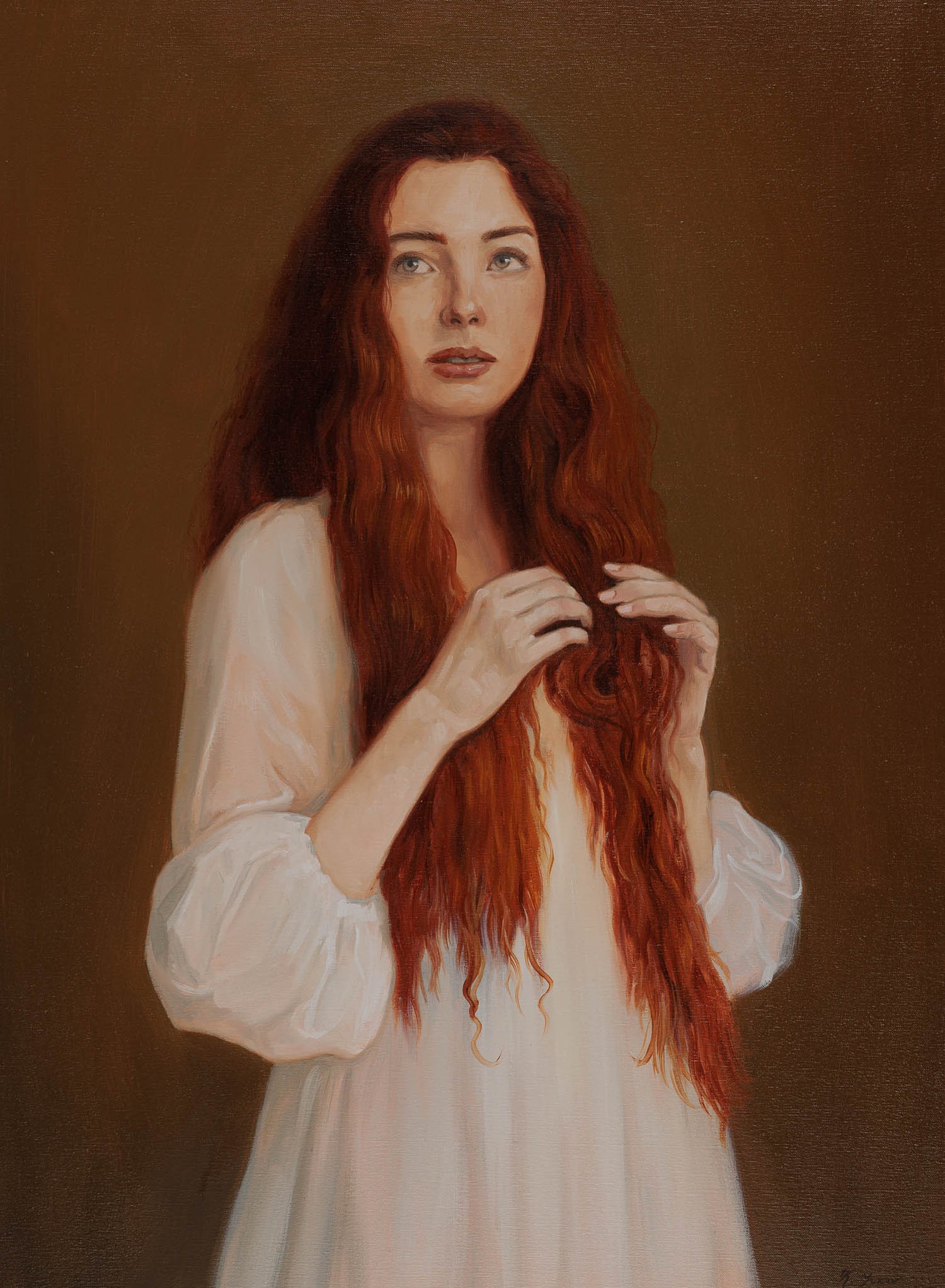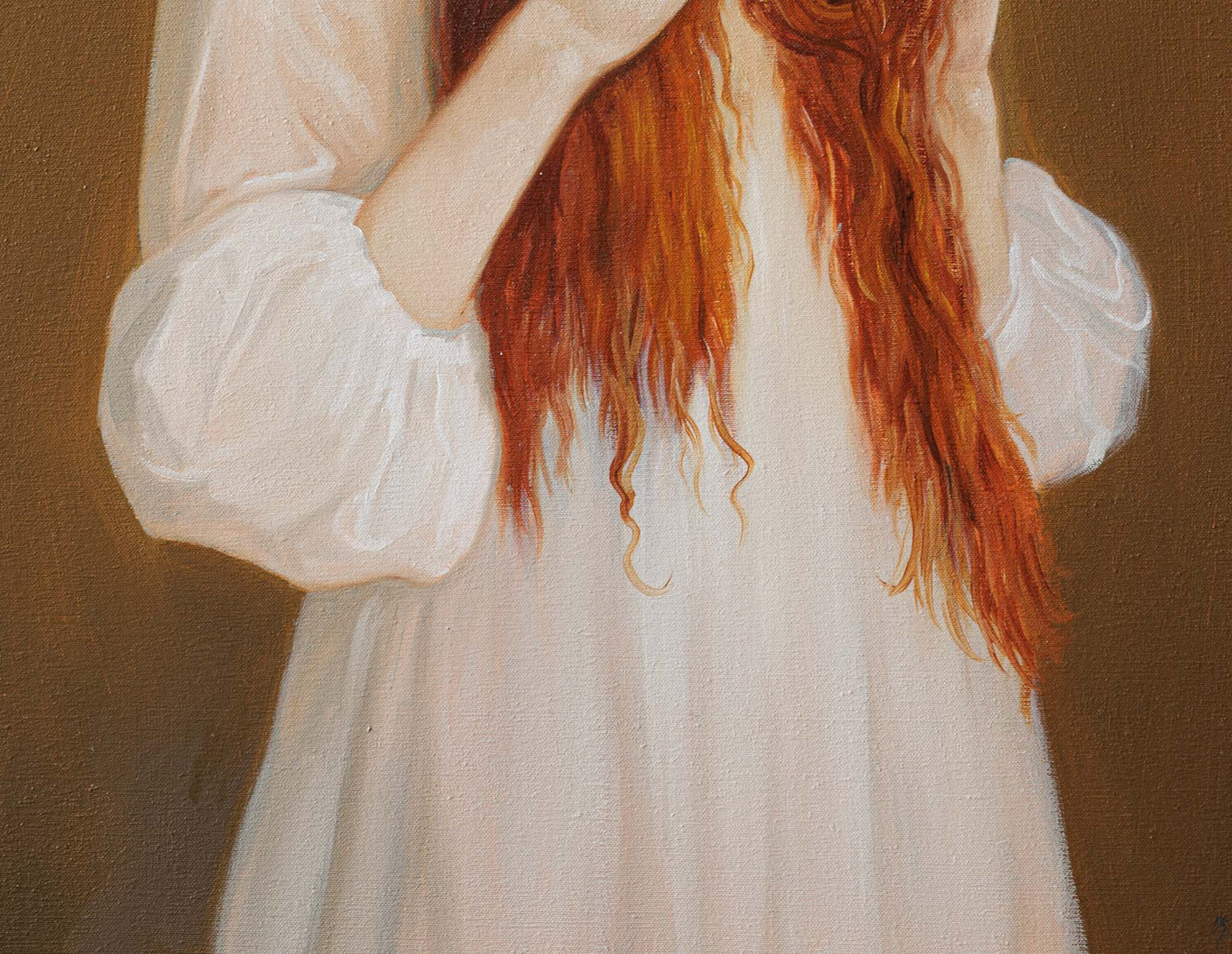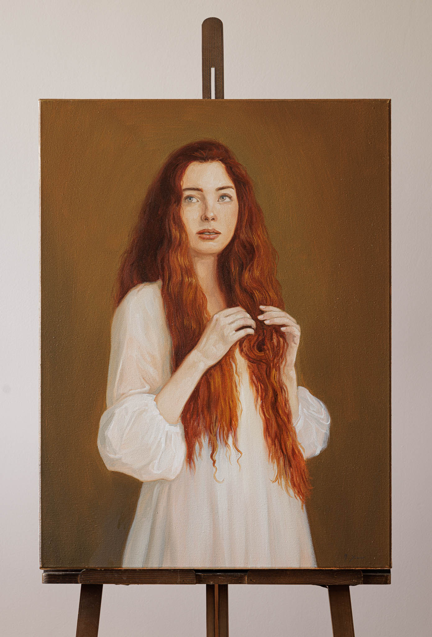 Младо женско присъствие, изпълнено с тиха увереност и ефирност. Погледът – леко отклонен, почти мечтателен, носи усещане за вътрешен свят. Дългата червена коса е акцент – символ на живост и индивидуалност, подчертана от меките тонове на светлата рокля и топлия фон. Портрет на крехка сила и деликатна грация.