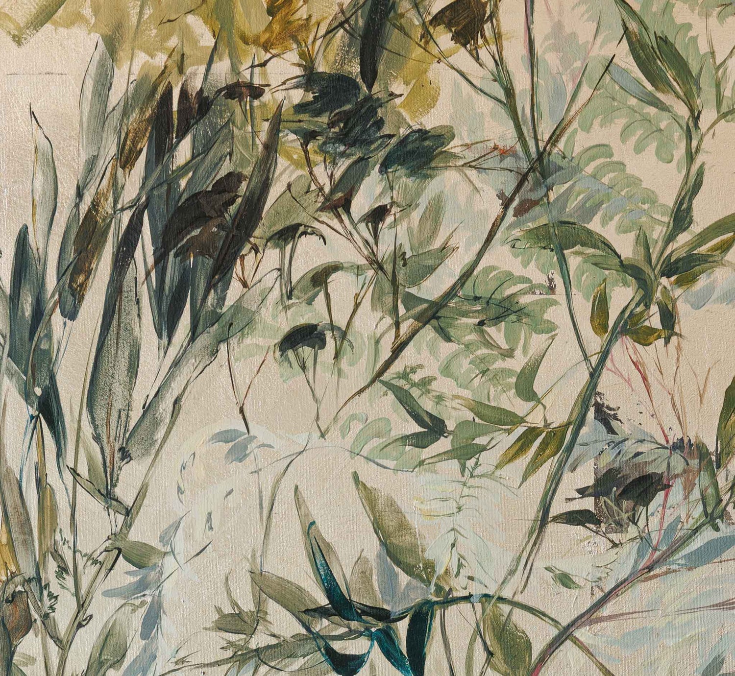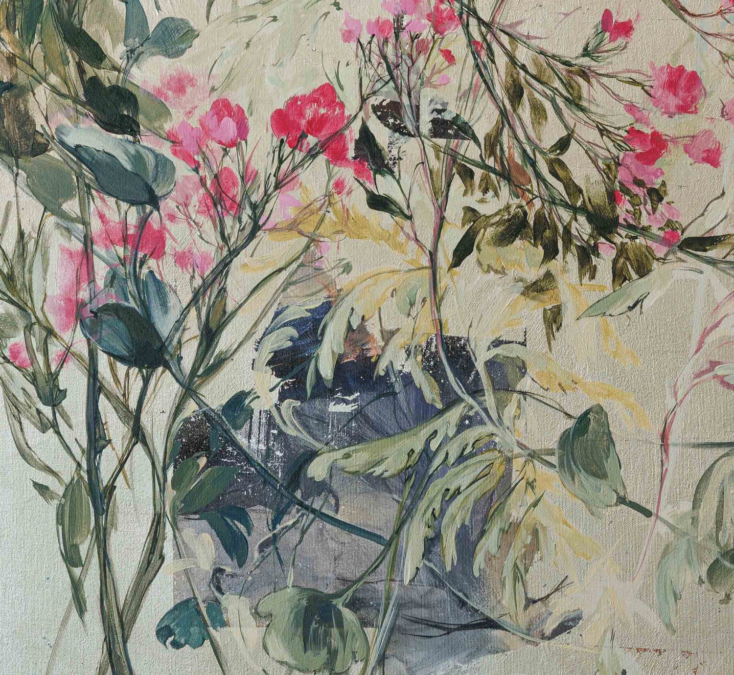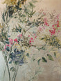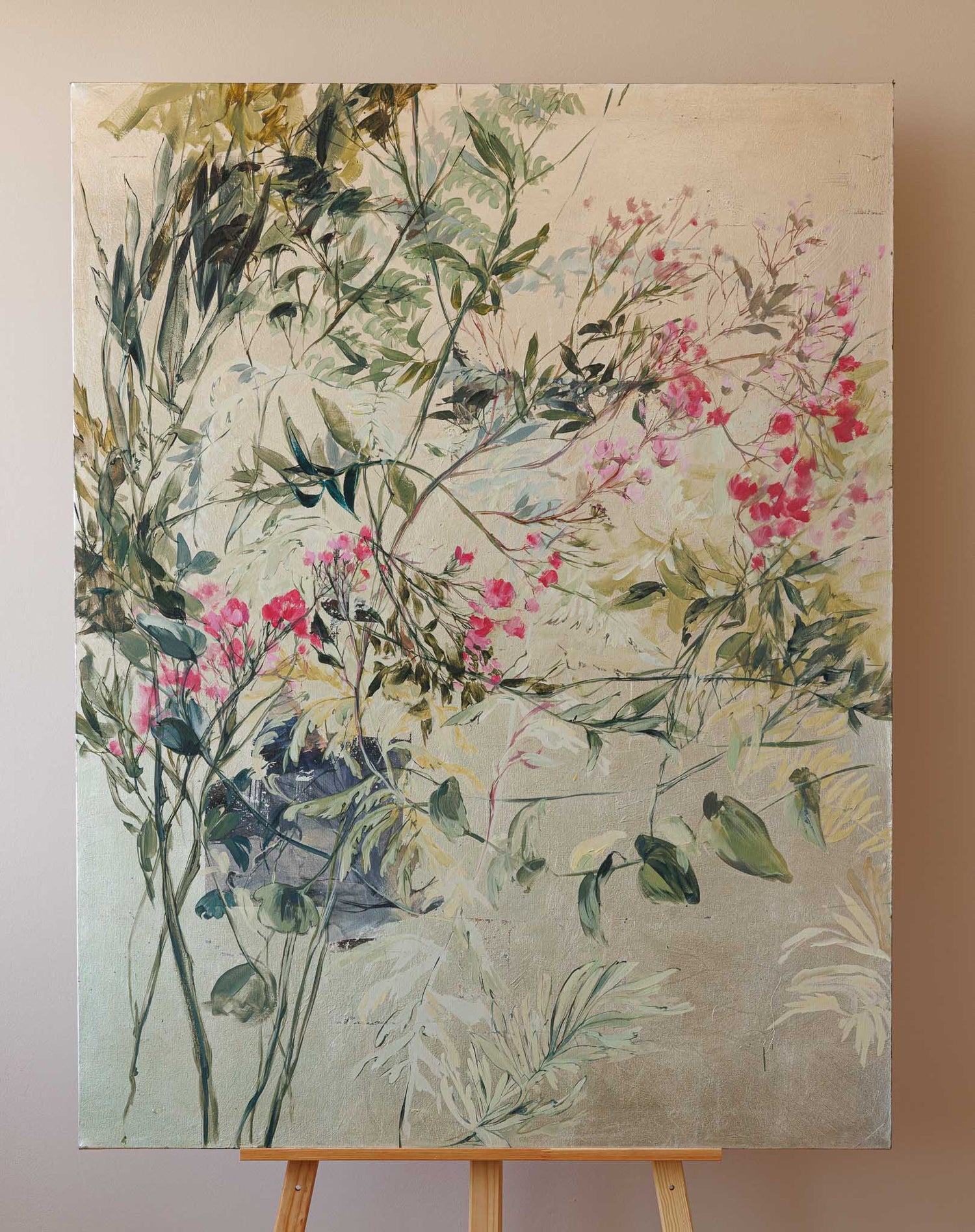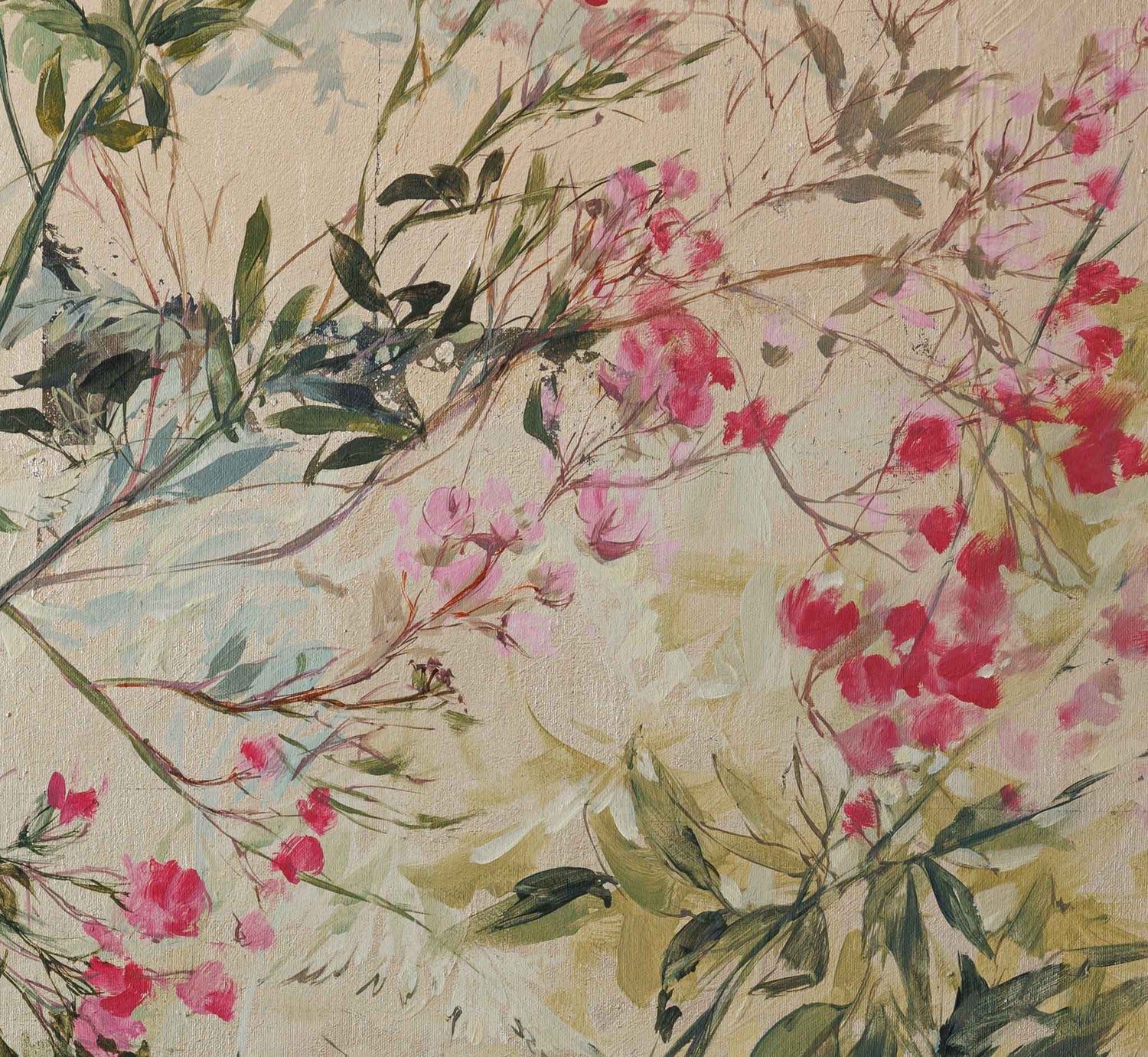 Изящна композиция, в която деликатни клонки и розови цветове изпълват платното с лекота и ефирност. Полупрозрачният фон подчертава усещането за движение и живост, сякаш гледаме през прозорец към градина, озарена от светлина.