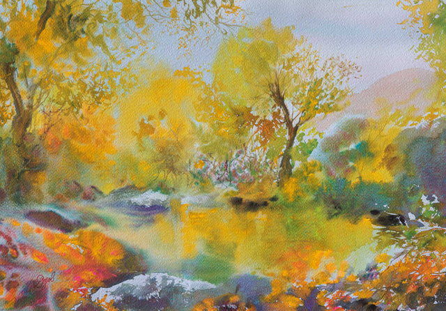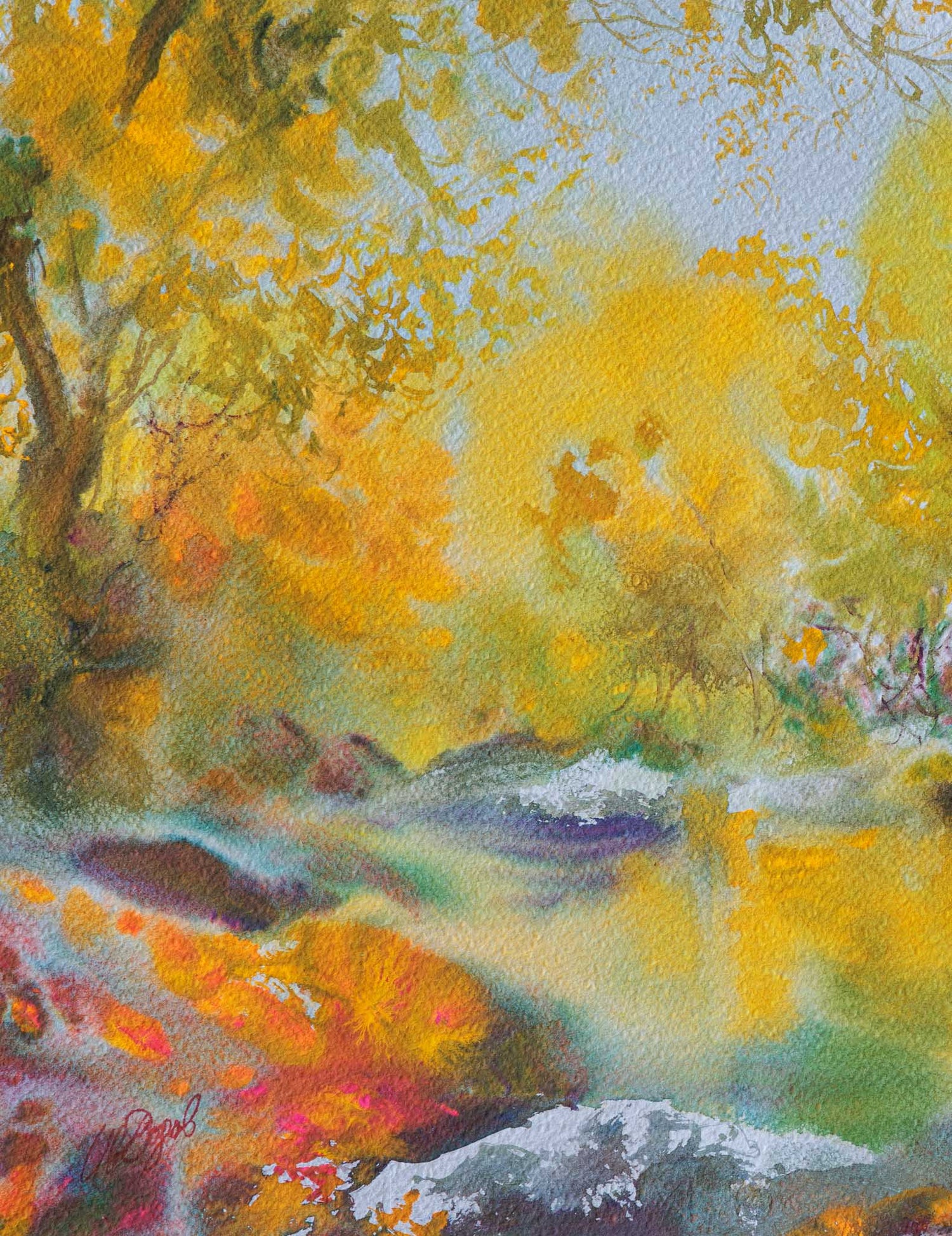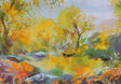 Есенният пейзаж се разлива в златисти и зелени нюанси, които се преливат като отражения във вода. Дърветата са уловени с ефирни, почти разтворени контури, а цветът се движи свободно между форма и настроение. Композицията носи усещане за мекота и тишина — като кратка пауза в природата, в която светлината говори по-силно от детайла.