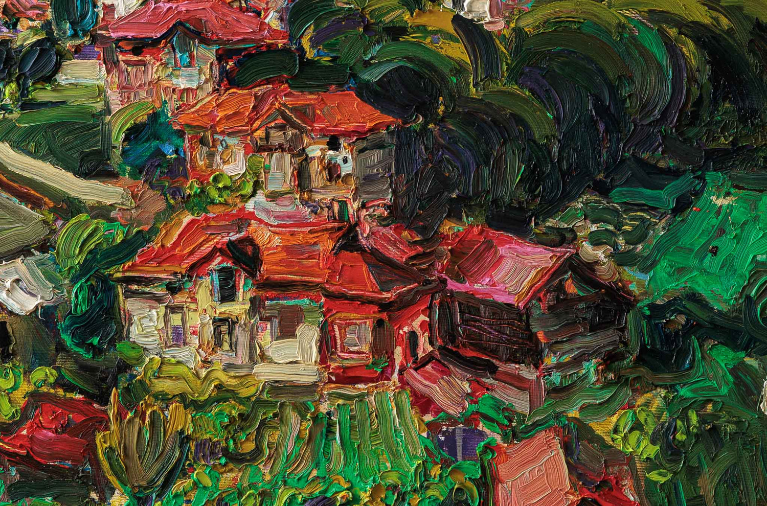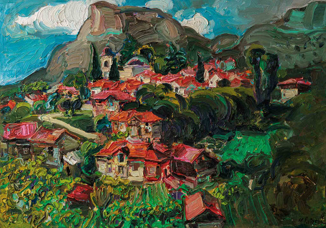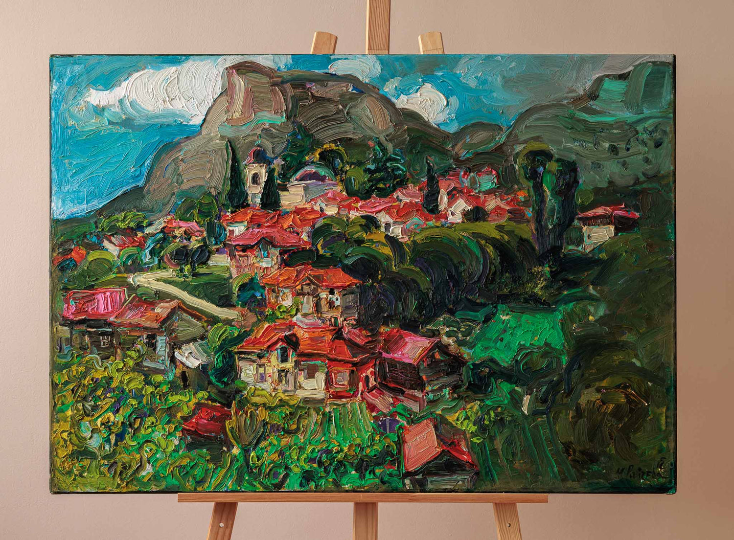 Селото се разстила по хълма като плътна жива тъкан от червени покриви и зелени маси. Енергичните, пастозни мазки моделират пейзажа в ритъм, където къщите и природата се сливат в едно цяло. Композицията носи усещане за жизненост и устойчивост — място, вкоренено в земята, но изпълнено с движение и цвят.