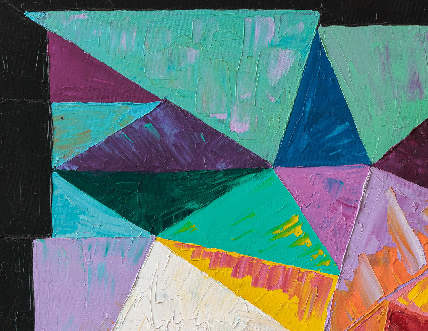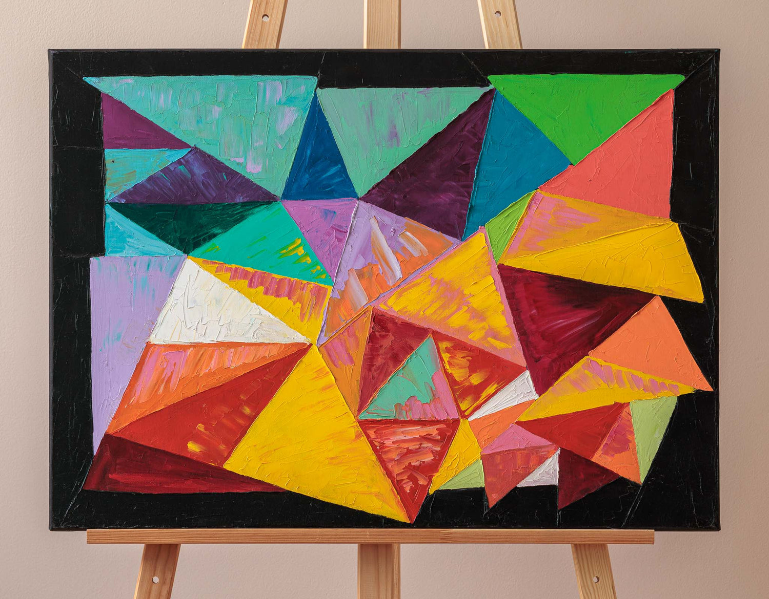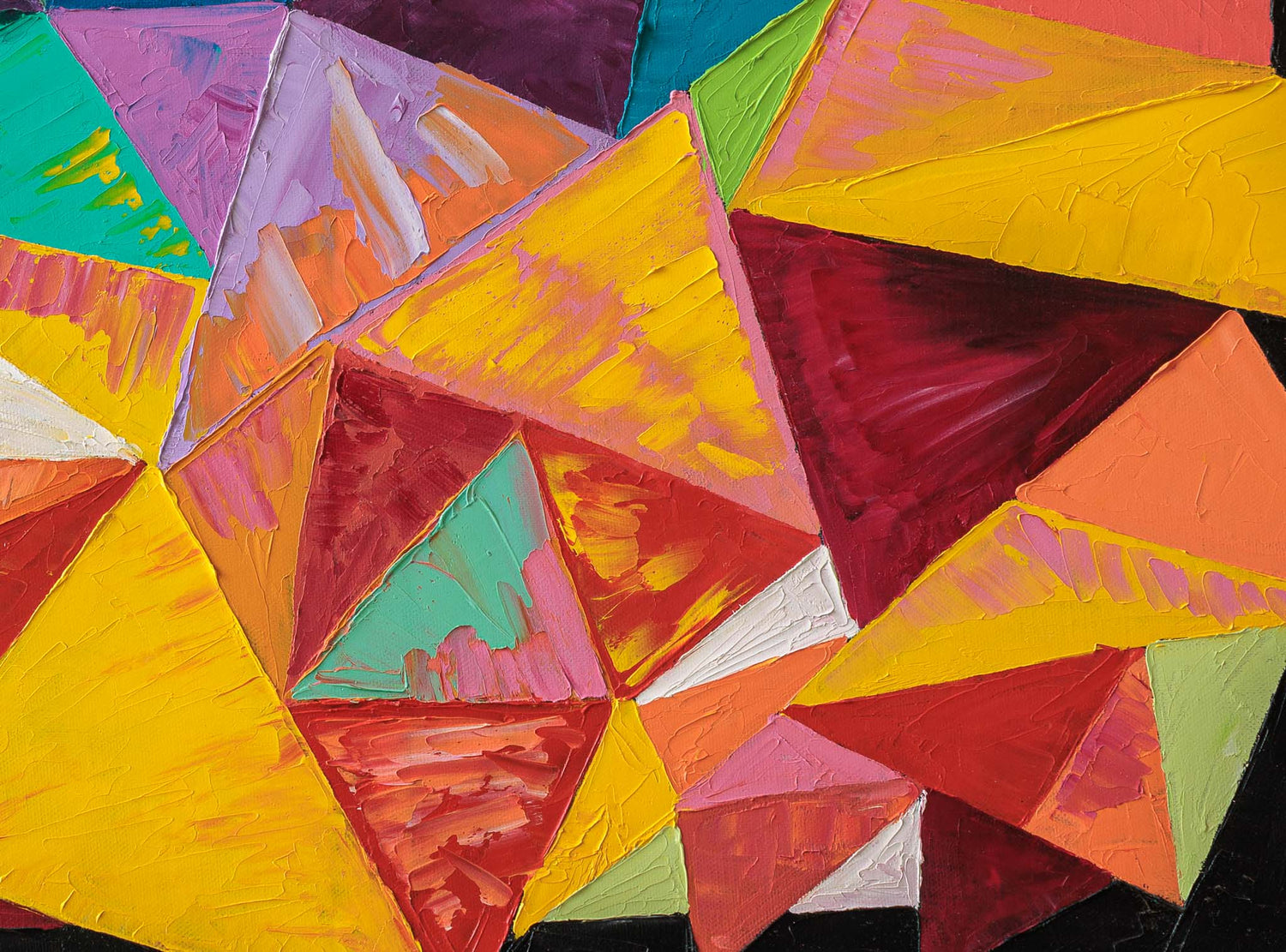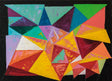 Геометрична абстракция, изградена от наситени цветни фрагменти, които се срещат и разминават в динамичен ритъм. Контрастът между топлите и студените тонове създава усещане за вечерна енергия и постепенно утаяване на движението.