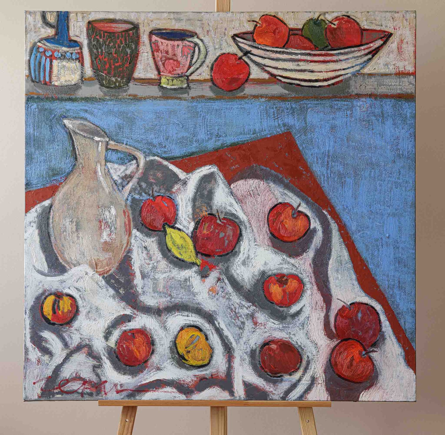 омпозицията пресъздава уютната небрежност на лятна кухня – разпилени плодове, деликатно пречупена светлина и предмети, подредени така, сякаш току-що са били докосвани. Ярките акценти върху ябълките и керамиката създават ритъм, а контрастът между наситените червени и прохладните сини тонове придава свежест и жизненост на сцената.